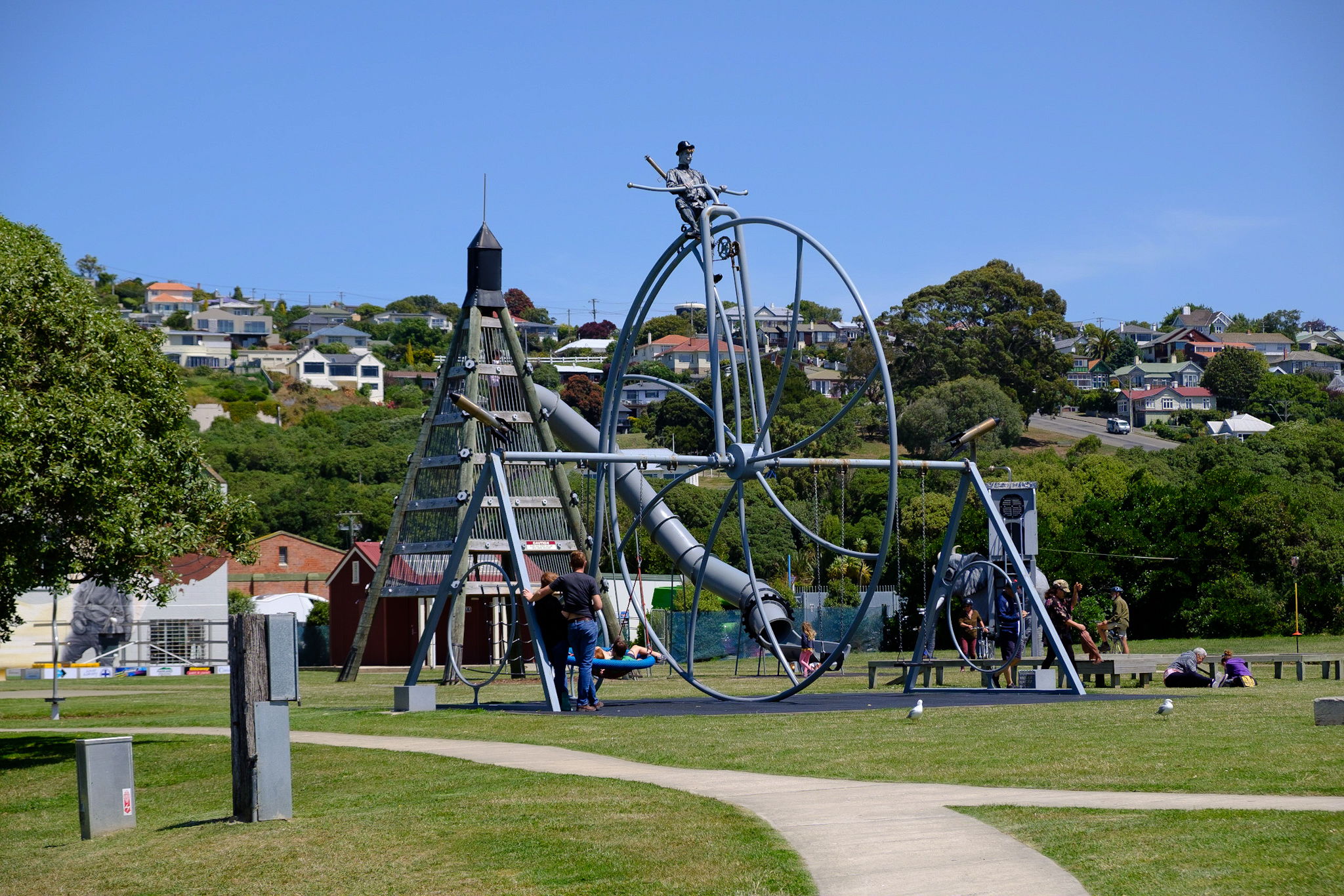Nach diesem längeren Rundgang schaue ich noch beim Hafen vorbei, wo viele Sportboote im türkisen Wasser schaukeln. Sogar das Café am Hafen und der grosse Spielplatz nehmen hier das Thema Steampunk auf.