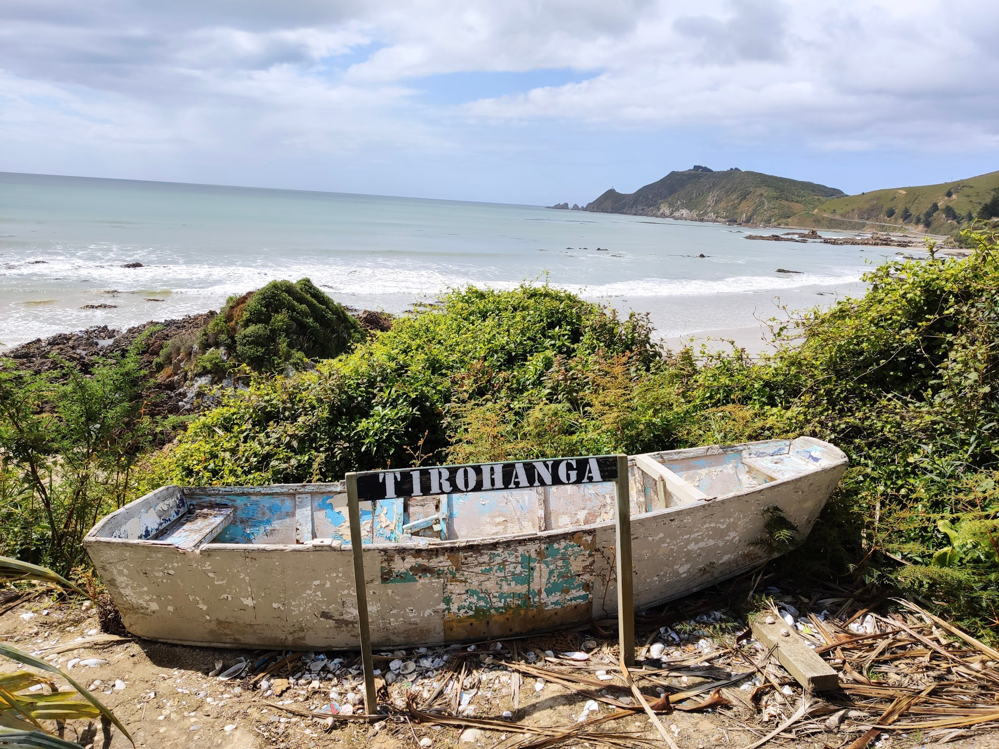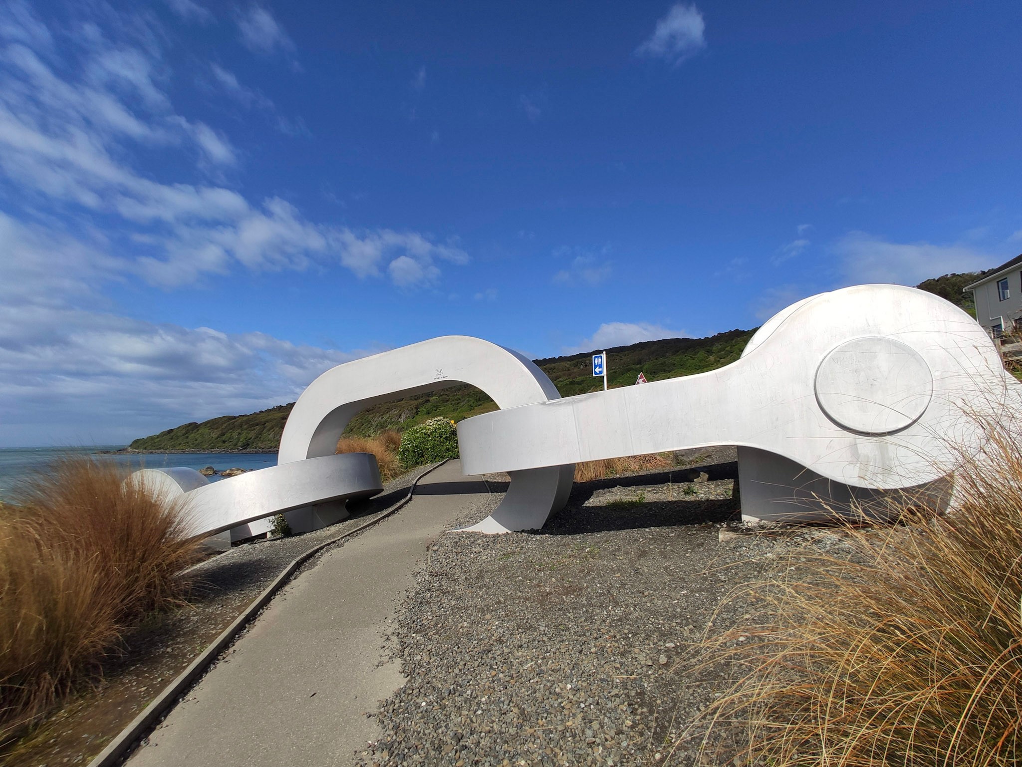 Ganz in der Nähe des Wegweisers fällt einem dann sofort ein Kunstwerk mit riesigen Kettengliedern auf. Die Kette verbindet das Kanu von Maui (die Nordinsel) mit dem Ankerstein (Stewart Island).