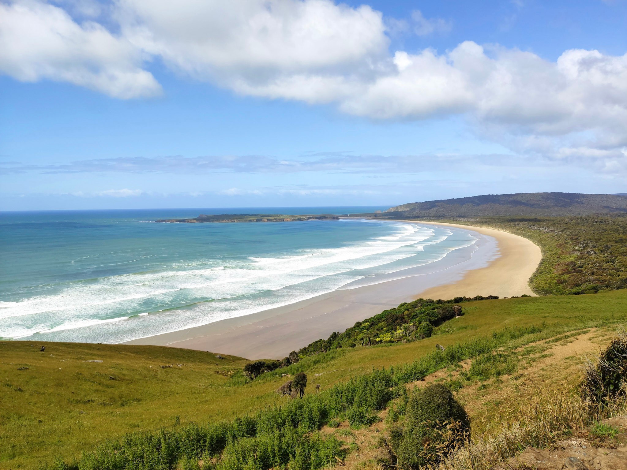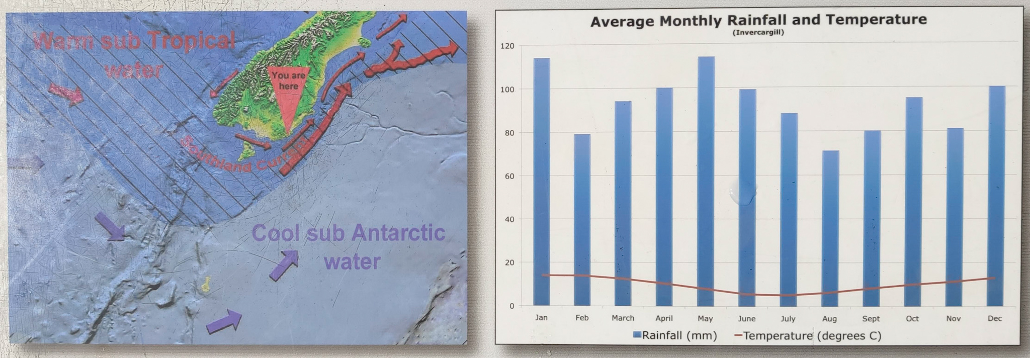 In den Catlins locken sehr viele Wanderwege, schöne Wasserfälle und hohe Klippen. Mich verfolgte nun aber schon seit langer Zeit eine dunkle Regenwolke, welche einen kleinen Spaziergang ziemlich unrealistisch machte. Am Florence Hill Lookout machte ich daher eine Pause und liess die Regenwolke weiterziehen. Das gab mir die Gelegenheit, die schöne Bucht zu fotografieren und die Schautafel zu lesen, welche die vielen Regenfälle erklärte.
