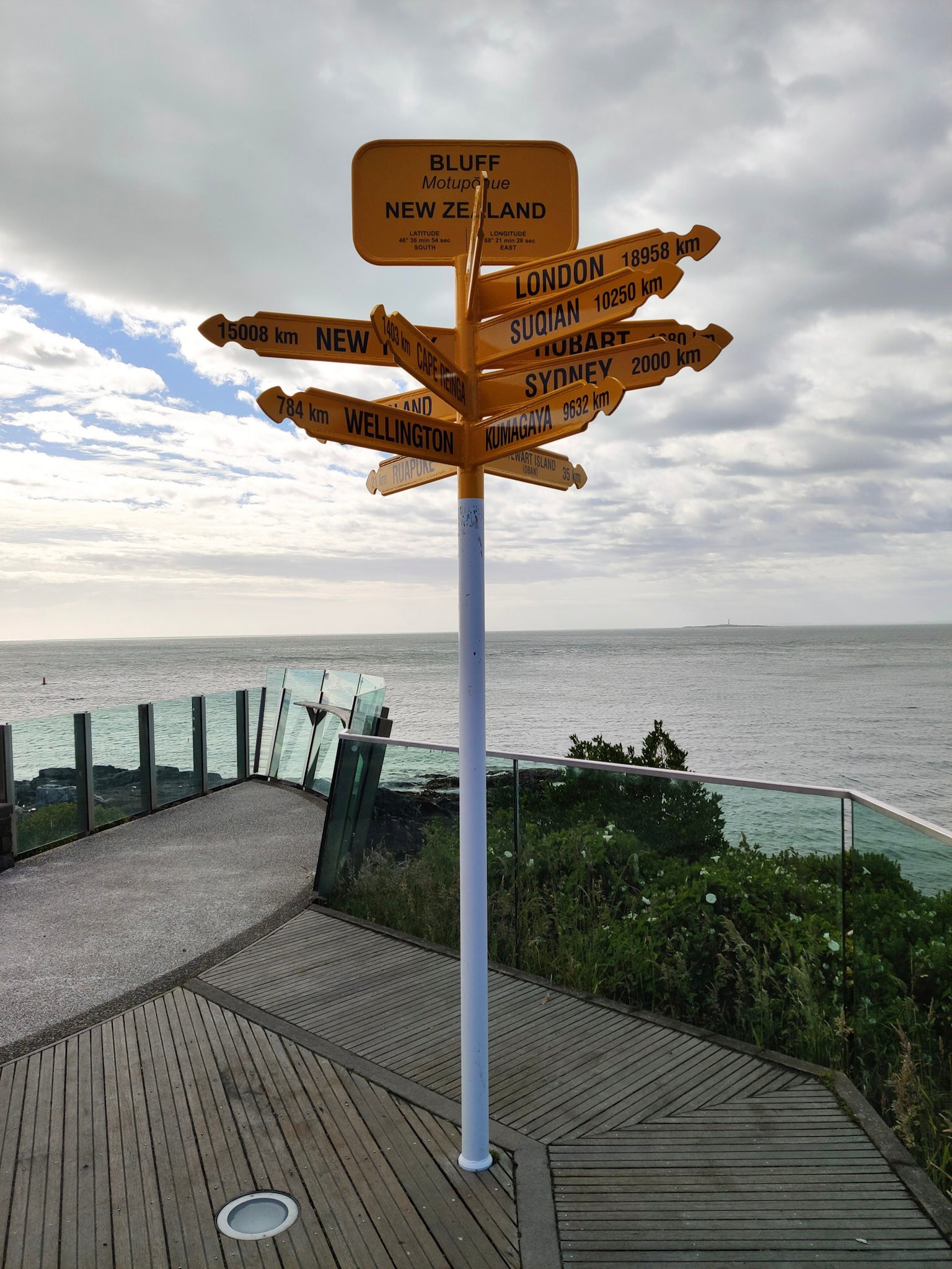 Ich hatte aber keine grosse Lust zu einem Museumsbesuch und fuhr mit dem Ca,pervan nach Bluff, an das südliche Ende des State Highway 1. Dieser führt vom Stirling Point über 2’033km von Bluff bis zum Cape Reinga. Hier am südlichen Ende steht einer der beliebten Wegweiser in alle Himmelsrichtungen. Dieser Wegweiser soll wohl eines der meistfotografierten Motive Neuseelands sein.