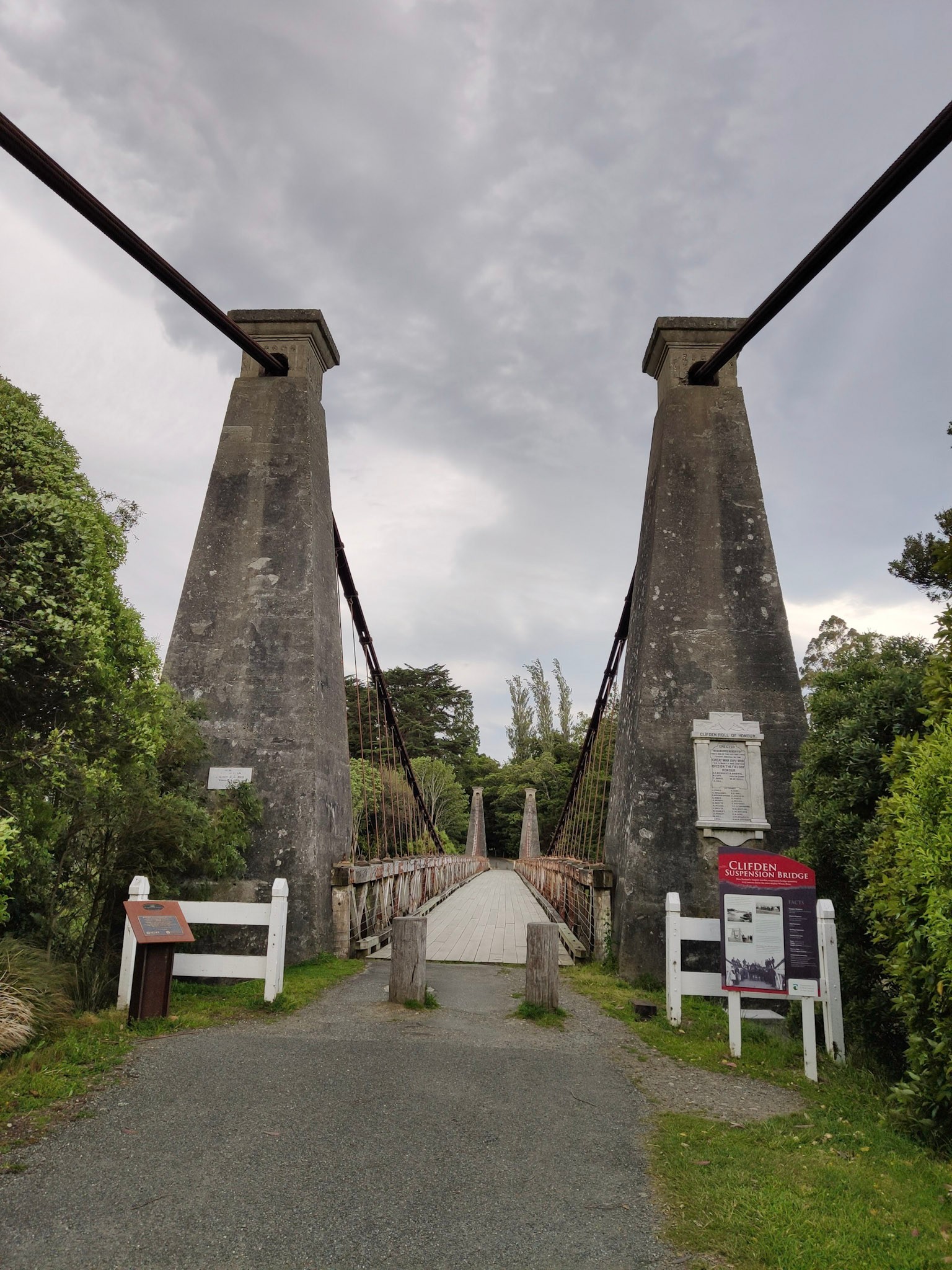 Nach etwa 30km kommt man dann eigentlich schon zum letzten touristschen Stopp auf der ganzen Strecke. Die Clifden Suspension Bridge ist eine historische Hängebrücke in der Nähe von Clifden. Erbaut im Jahr 1899 überspannt es den Waiau und ist 111.5m lang. Damals war das eine rekordverdächtige Länge und der Fluss führt auch viel mehr Wasser. Die Brücke wurde 1978 restauriert und ist nun für Fussgänger zugänglich.