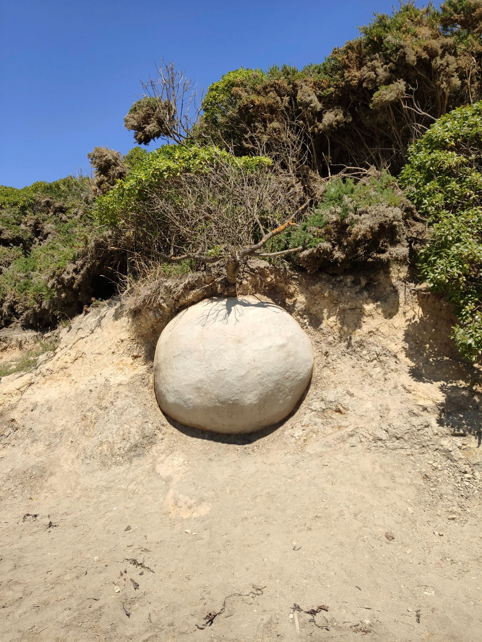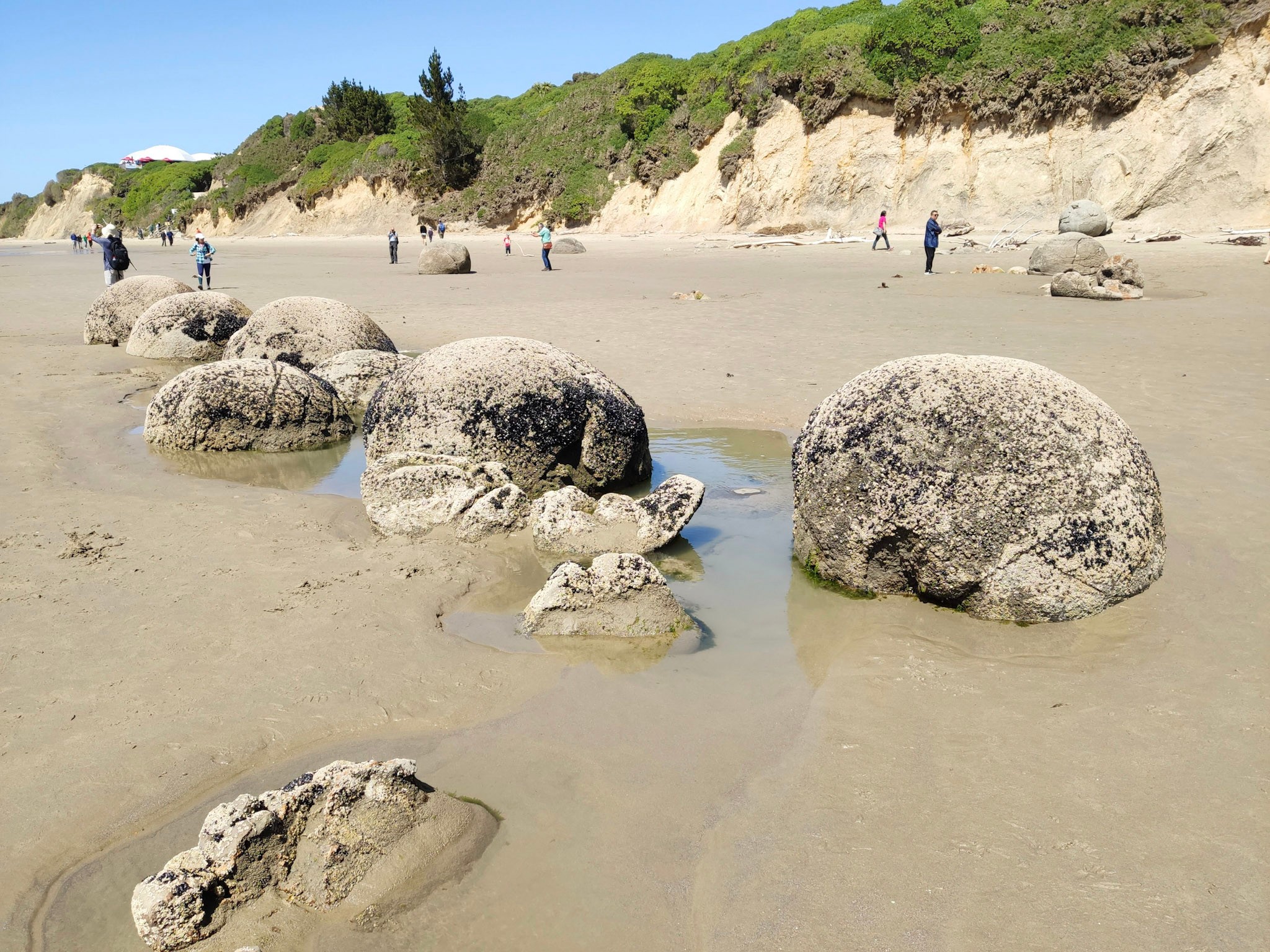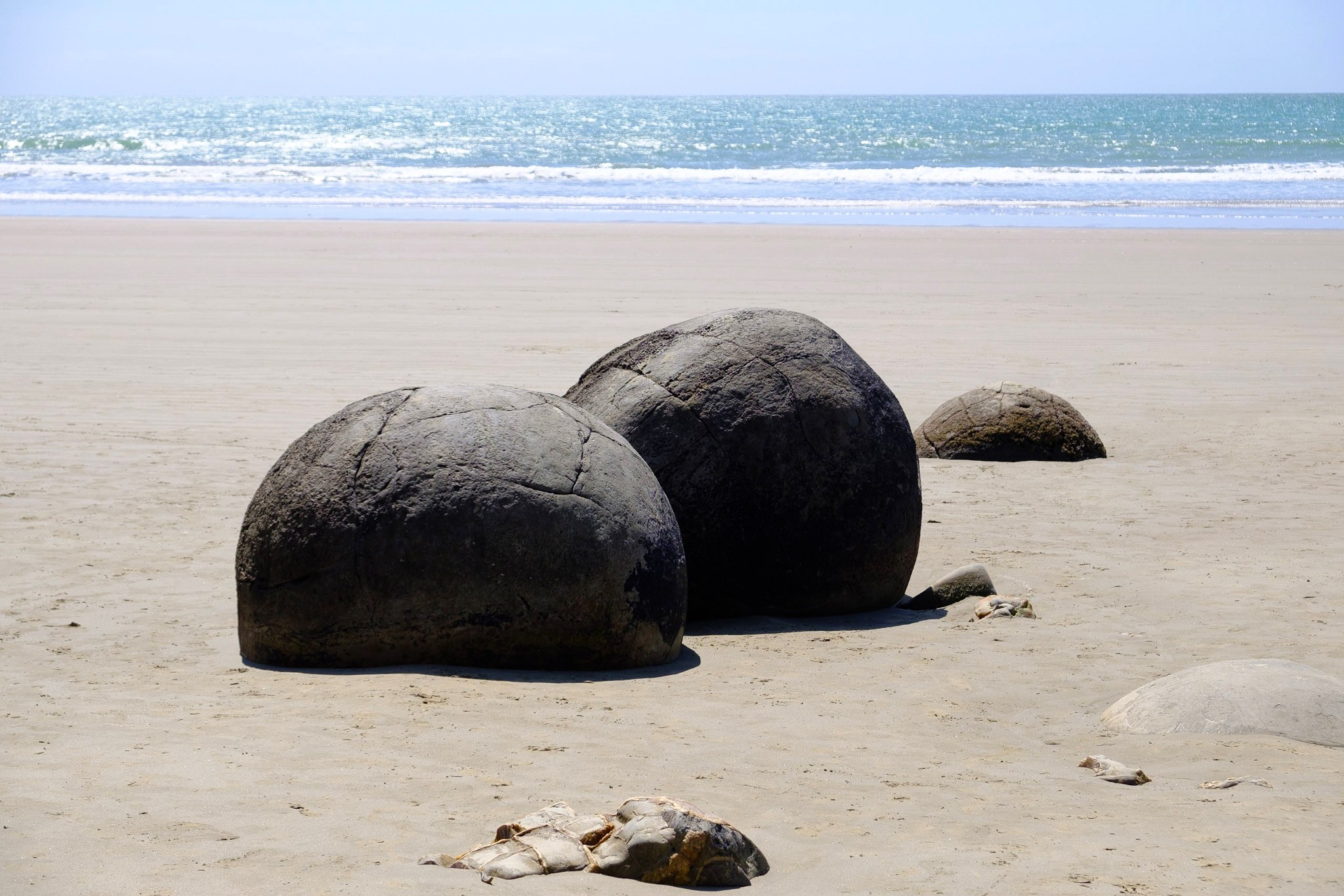 Die Moeraki Boulders sind eine Gruppe grosser kugelförmiger „Steine“ am Koekohe Beach. Diese Felskugel sind aber tatsächlich Konkretionen, die durch Küstenerosion von Küstenklippen freigelegt wurden. Ursprünglich begannen sie sich vor etwa 60 Millionen Jahren in uralten Meeresbodensedimenten zu bilden, indem sie sich um einen Kern herum kristallisierten. Es wird angenommen, dass die grössten Felskugeln etwa 4 Millionen Jahre gebraucht haben, um ihre heutige Grösse zu erreichen.