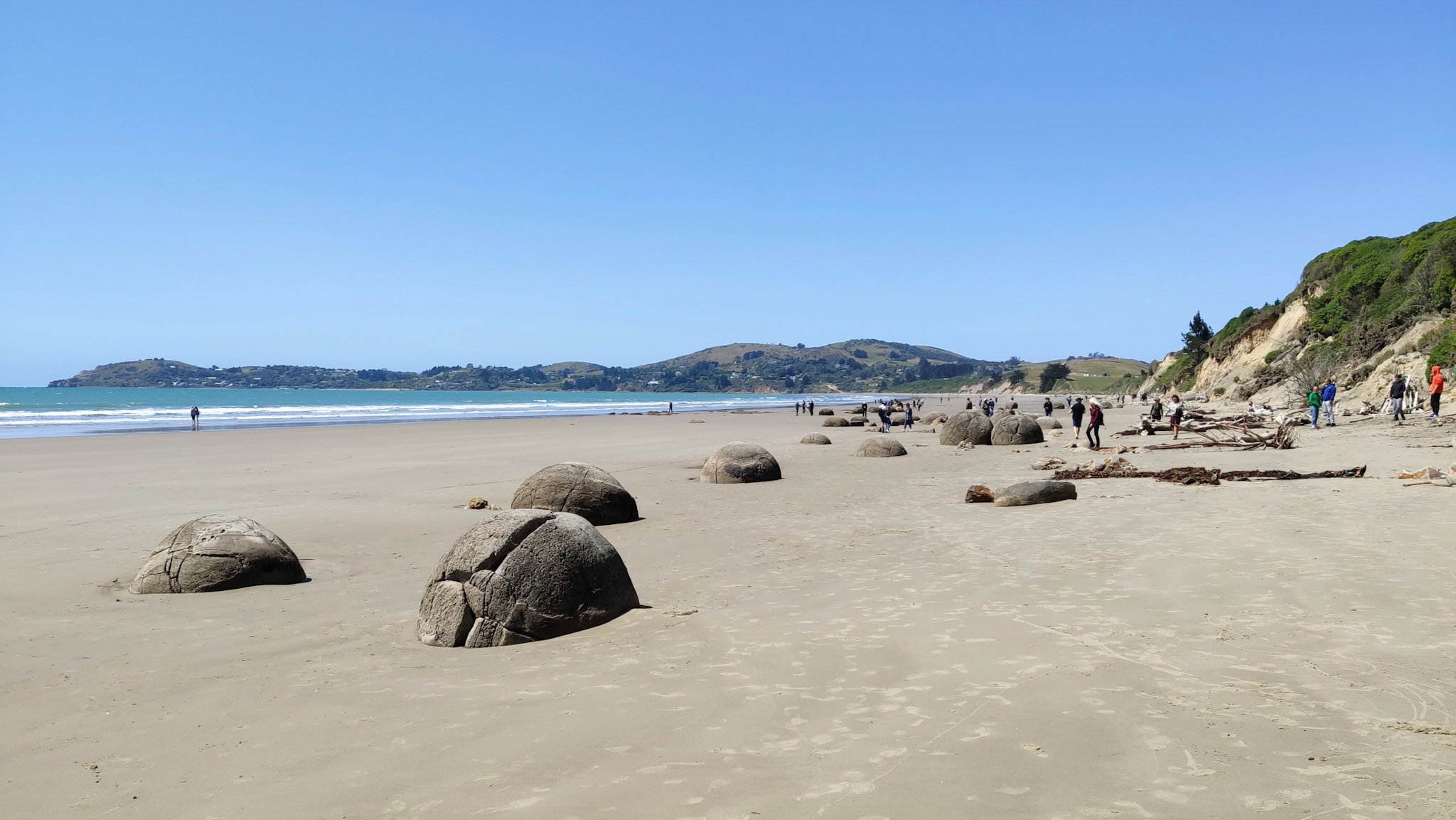Bei Hampden kann man dann ein weiteres, beliebtes Naturschauspiel besuchen: Die Moeraki Boulders. Entweder parkt man am Strand oder beim Café auf den Klippen. Ich habe mich für den Parkplatz am Strand und den kurzen Spaziergang zu den Boulders entschieden.
