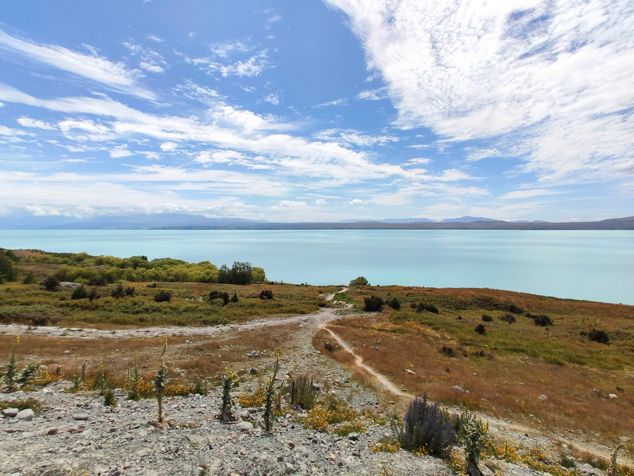 Der Lake Tekapo liegt inmitten des MacKenzie Basins und ist wohl das bekannteste Gewässer der Region, aber die türkisblau spiegelnde, weite Wasseroberfläche des Lake Pukaki beeindruckt schon am meisten.