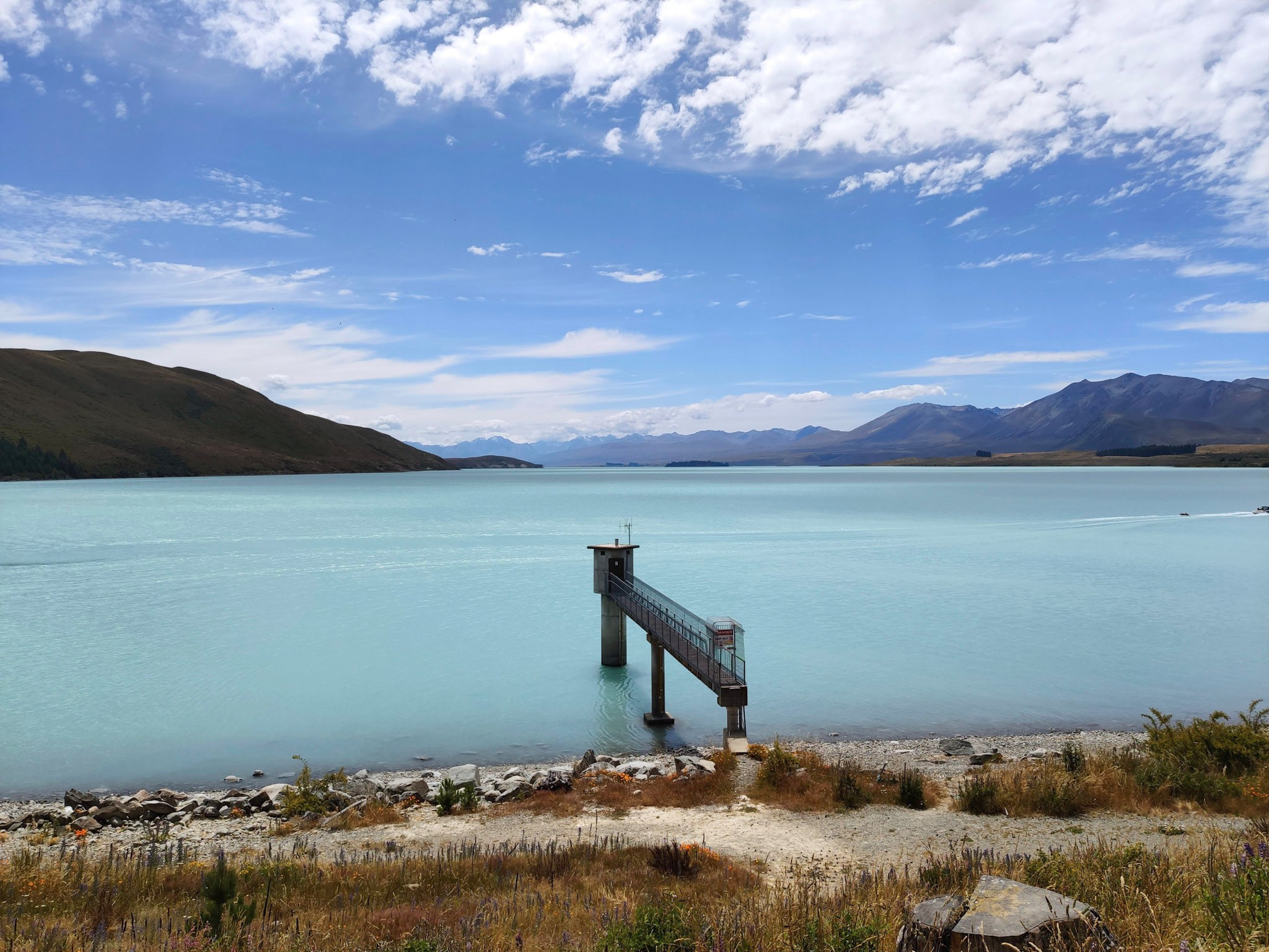 Ich habe mich am Mittwoch Morgen von Oamaru entlang des Waitaki Rivers in das Mackenzie-Country aufgemacht. In der breiten Ebene des Flusstals staunte ich über die vielen Bewässerungsanlagen und die wohl gerade im Bau befindliche neue Bewässerungspipeline.