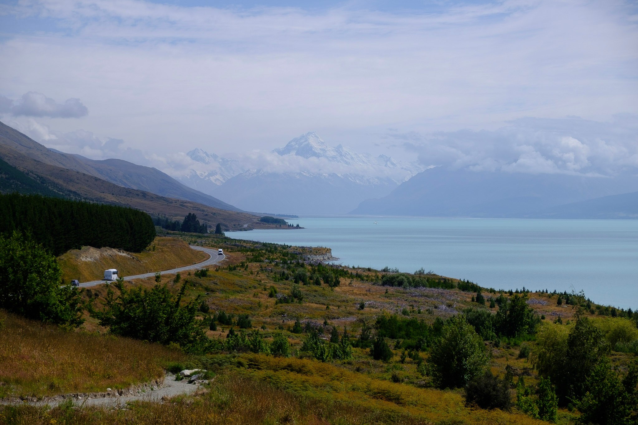 Die türkisblaue Farbe des Pukako Sees ist schon fast künstlich. Ich fahre bis zu Peter’s Lookout Richtung Mount Kook / Aoraki Village und geniesse den Ausblick über den See bis zu den schneebedeckten Gipfeln rund um den 3’754 Meter hohen Mount Cook / Aoraki. Und endlich kann ich diesen auch einmal fast ohne Wolken bewundern.