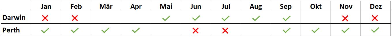 Die ideale Reisezeit ist daher zwischen April und Oktober: Früh in dieser Saison startet man in Perth, spät in dieser Saison startet man am besten in Darwin. Je früher man nach der Regenzeit den Norden und Nordwesten bereist, desto mehr Wasser führen die Flüsse und Wasserfälle! Zwar kann es um diese Zeit in Perth noch recht frisch sein, jedoch kann man mit der Kälte besser umgehen als mit schwülheissem Klima und möglichen Überflutungen im Norden.
