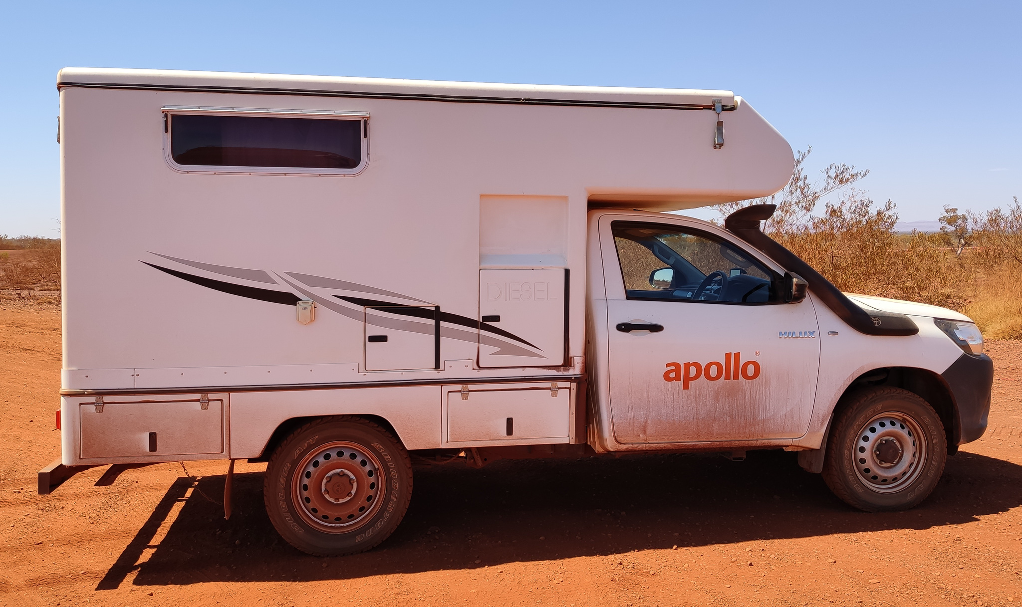 Ich bin auf der knapp dreimonatigen Reise fast 14’000km gefahren. Der Adventure Camper hat dabei 9.9l Diesel pro 100km verbraucht (total 1’380l), was ein hervorragender Wert ist. Ein Liter Diesel kostete durchschnittlich AUD 1.60.