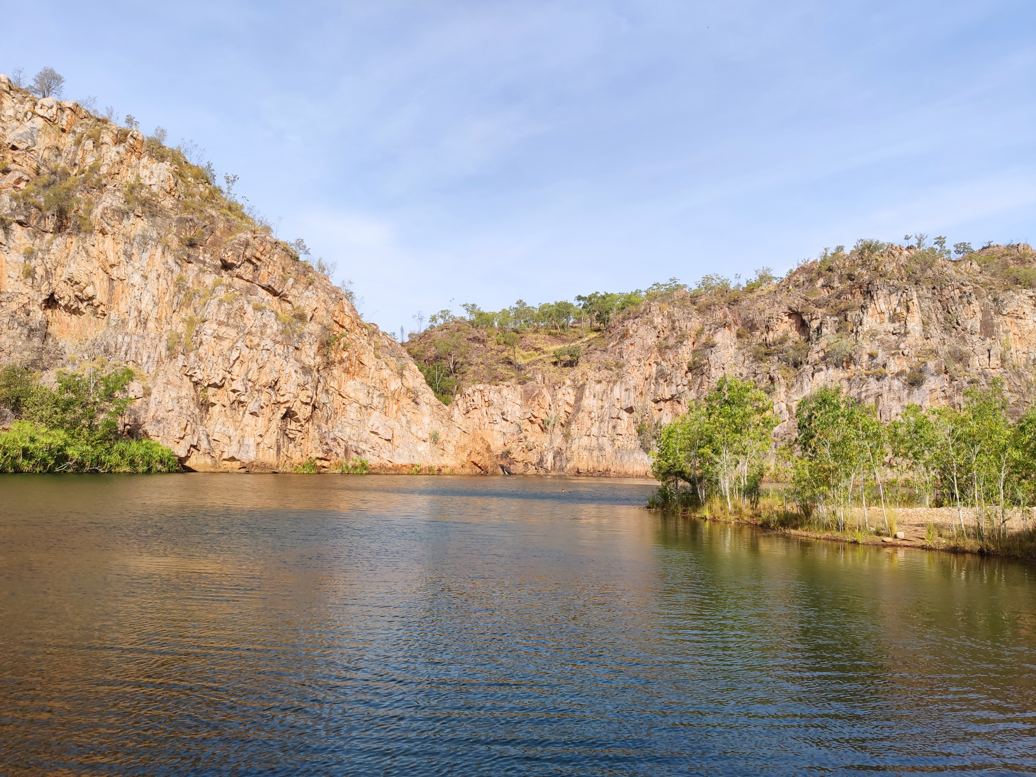 Auf dem Weg zur Katherine Gorge habe ich im geschäftigen Katherine (es ist die drittgrösste Stadt der Northern Territories) meine Vorräte aufgefüllt, die mobile Verbindung genossen und bin dann zum Nitmiluk Campground gefahren. Hier bin ich zwei Nächte geblieben. Am selben Tag habe ich abends den Baruwei Loop Walk absolviert und am nächsten Morgen ganz früh die Katherine Gorge Dawn Cruise gemacht. Beides hat mir sehr gut gefallen! Hier müsste man bei kühlerem Wetter tatsächlich einen Kanuausflug machen.