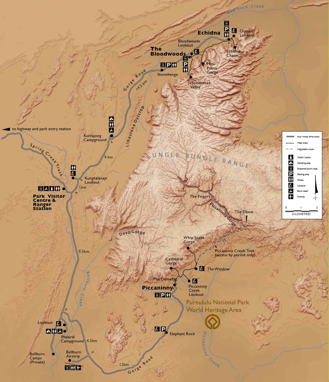 Anzumerken ist, dass mit gemieteten Fahrzeugen (auch 4WD) die Piste zur Lost City sowie der Abschnitt von den Sandy Creek Falls bis zum Victoria Hwy meist nicht befahren werden darf.