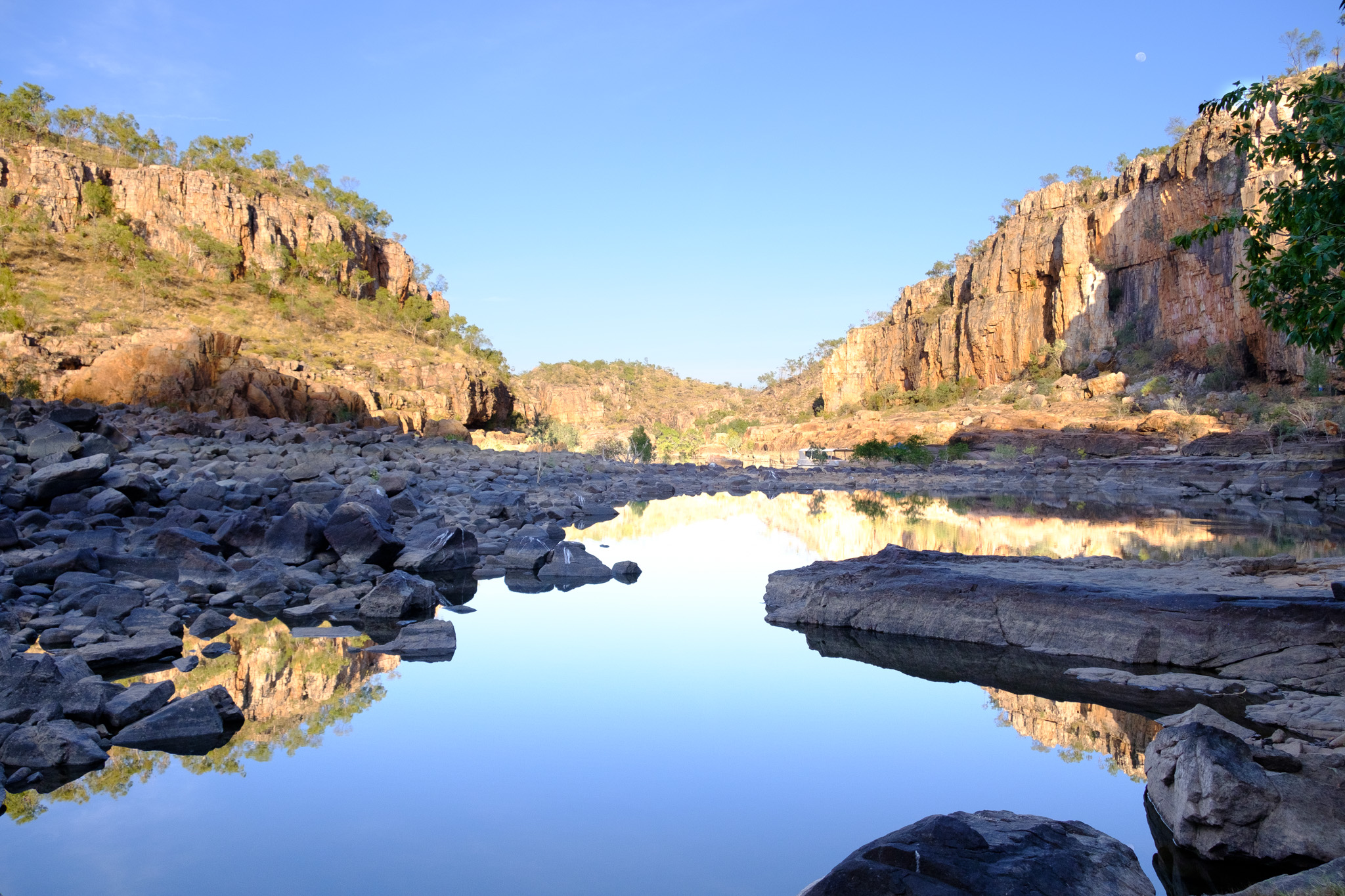 Auf dem Weg zur Katherine Gorge habe ich im geschäftigen Katherine (es ist die drittgrösste Stadt der Northern Territories) meine Vorräte aufgefüllt, die mobile Verbindung genossen und bin dann zum Nitmiluk Campground gefahren. Hier bin ich zwei Nächte geblieben. Am selben Tag habe ich abends den Baruwei Loop Walk absolviert und am nächsten Morgen ganz früh die Katherine Gorge Dawn Cruise gemacht. Beides hat mir sehr gut gefallen! Hier müsste man bei kühlerem Wetter tatsächlich einen Kanuausflug machen.