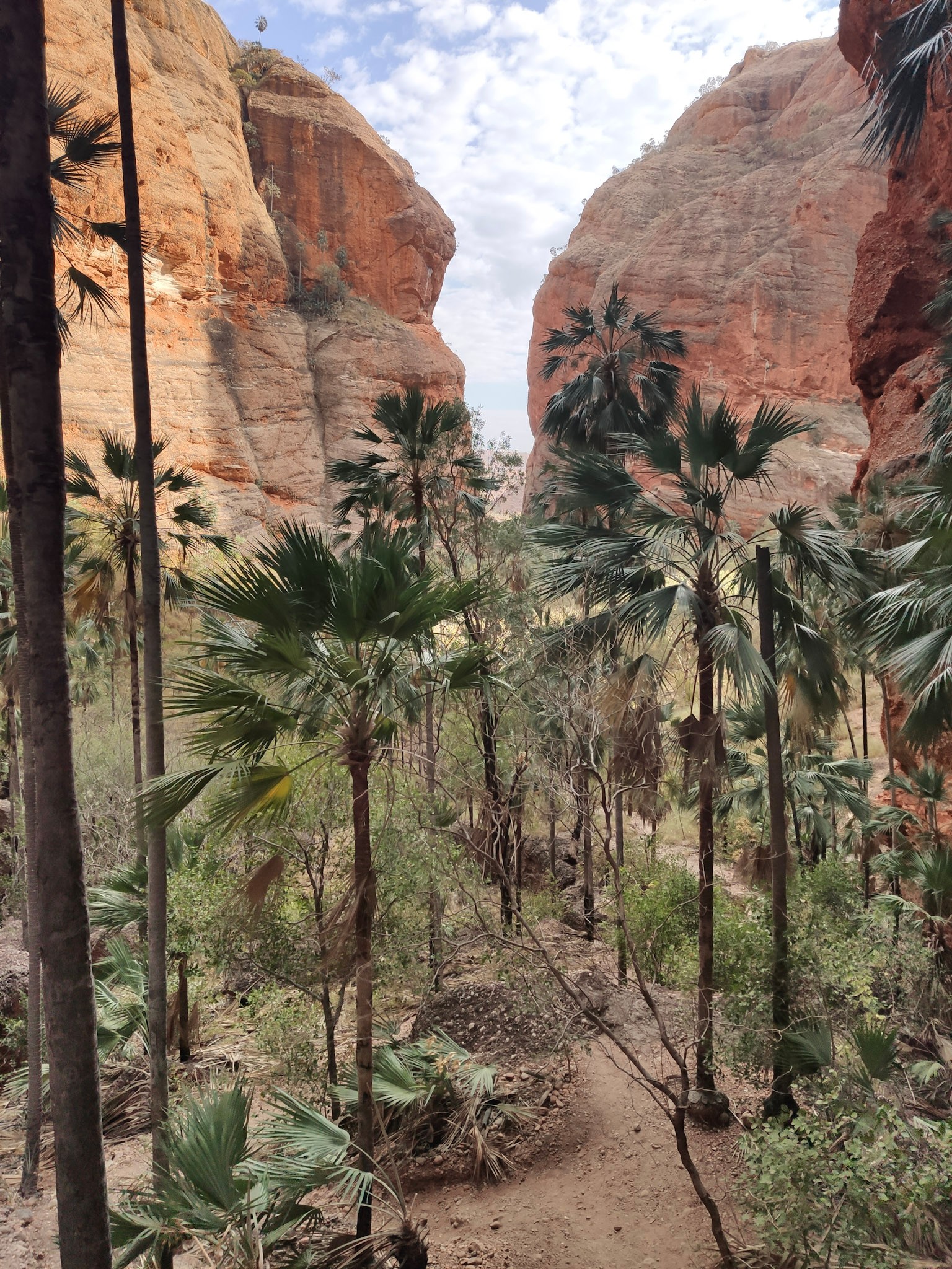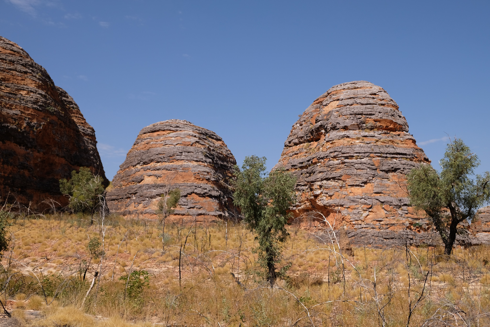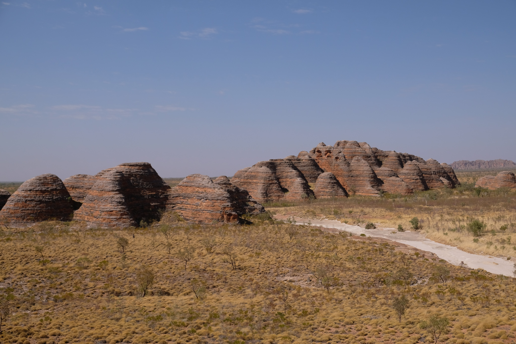 Der Purnululu NP ist 240ha gross und umfasst die Bungle Bungle Range, welche eine überwältigendes Feld an Sandsteindomen umfasst. Diese natürlichen Formationen sind in dieser Anzahl, Grösse und Vielzahl an Formen einzigartig auf der ganzen Welt. Der Sandstein der Karstformationen entstand vor etwa 360 Millionen Jahren. Die orangen und grauen Bänder haben ihre Ursache in unterschiedlicher Feuchtigkeit. Wo es feucht ist, leben Cyanobakterien, welche den Stein grau oder schwarz färben. Das sind die selben Bakterien, welche auch die Felsen der Wasserfälle schwarz färben. Die orangen Bänder sind trocken und an der Luft oxidiert.