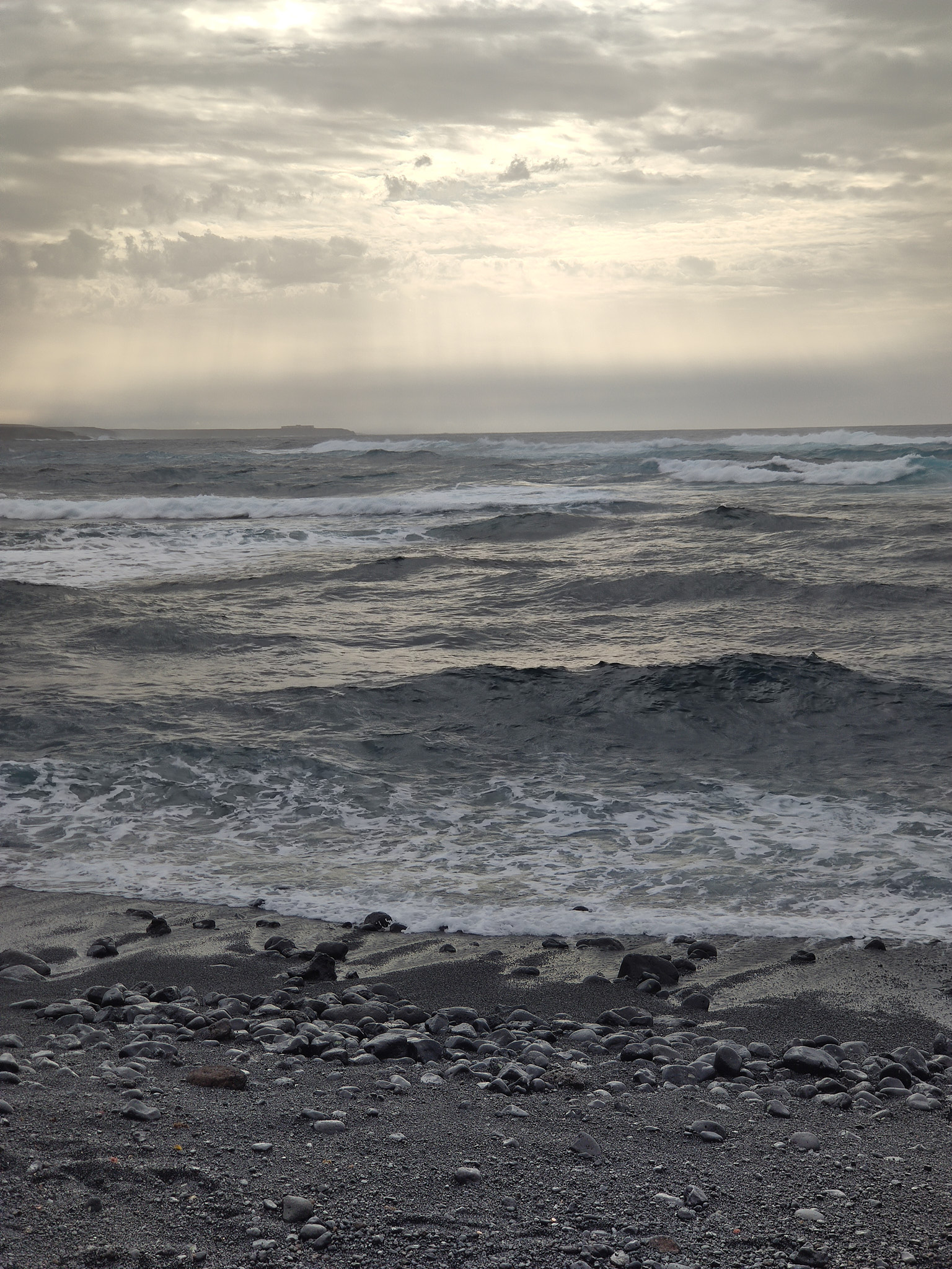 Am späteren Nachmittag des 21. Dezembers habe ich mich bei stürmischem Wetter doch noch mit dem Auto zur Playa del Janubio aufgemacht. Etwas frische Luft tanken! In der Gischt der laut brechenden Wellen versuchte ich an diesem schwarzen Strand die besondere Lichtstimmung dieses speziellen Ortes fotografisch einzufangen.