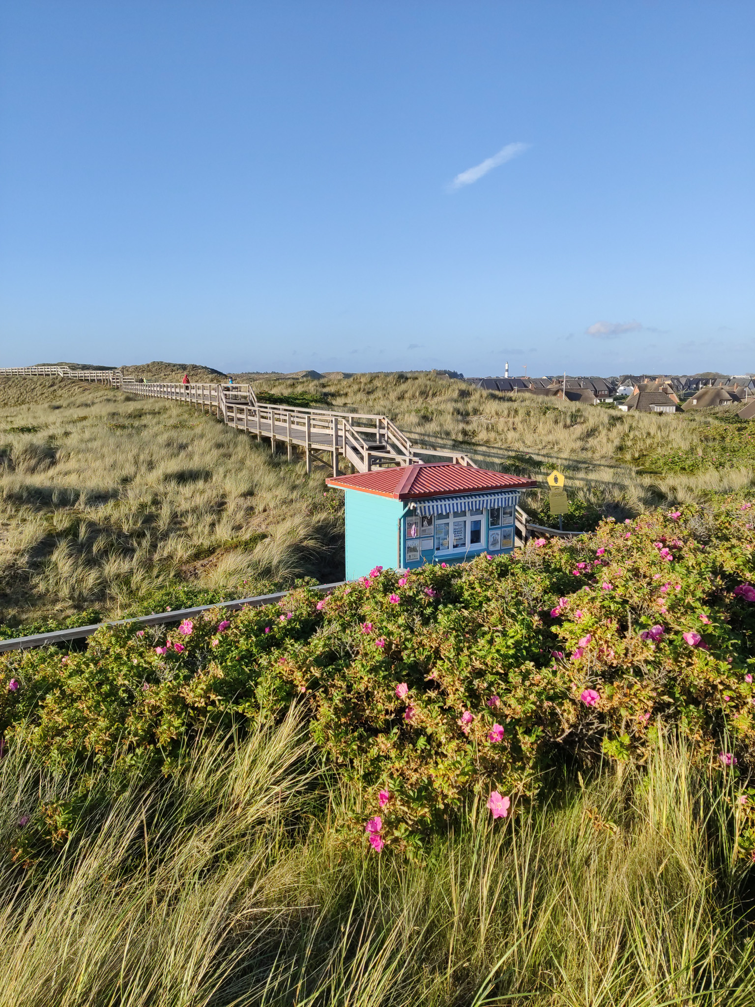 Der Flieger landete heute Samstag am frühen Abend, die Wartezeit auf das Gepäck im behelfsmässigen Zelt mit dem Gepäckförderband sowie die Übernahme des Mietautos gingen rasch vonstatten. Die Fahrt mit dem Mietauto zur Ferienwohnung in Wenningstedt dauert ja nur ein paar Minuten. Der blaue Himmel und die strahlende Abendsonne lockten mich dann ebenso rasch auf den 650m langen Weg an die kleine Promenade von Wenningstedt und zu Gosch am Kliff. Bei einem leckeren Matjes-Brötchen konnte ich den Ausblick über den Strand und den Sonnenschein umso mehr geniessen. Das ist doch der Inbegriff von Urlaub – und schon fast etwas surreal, wenn man vor wenigen Stunden noch zuhause war.