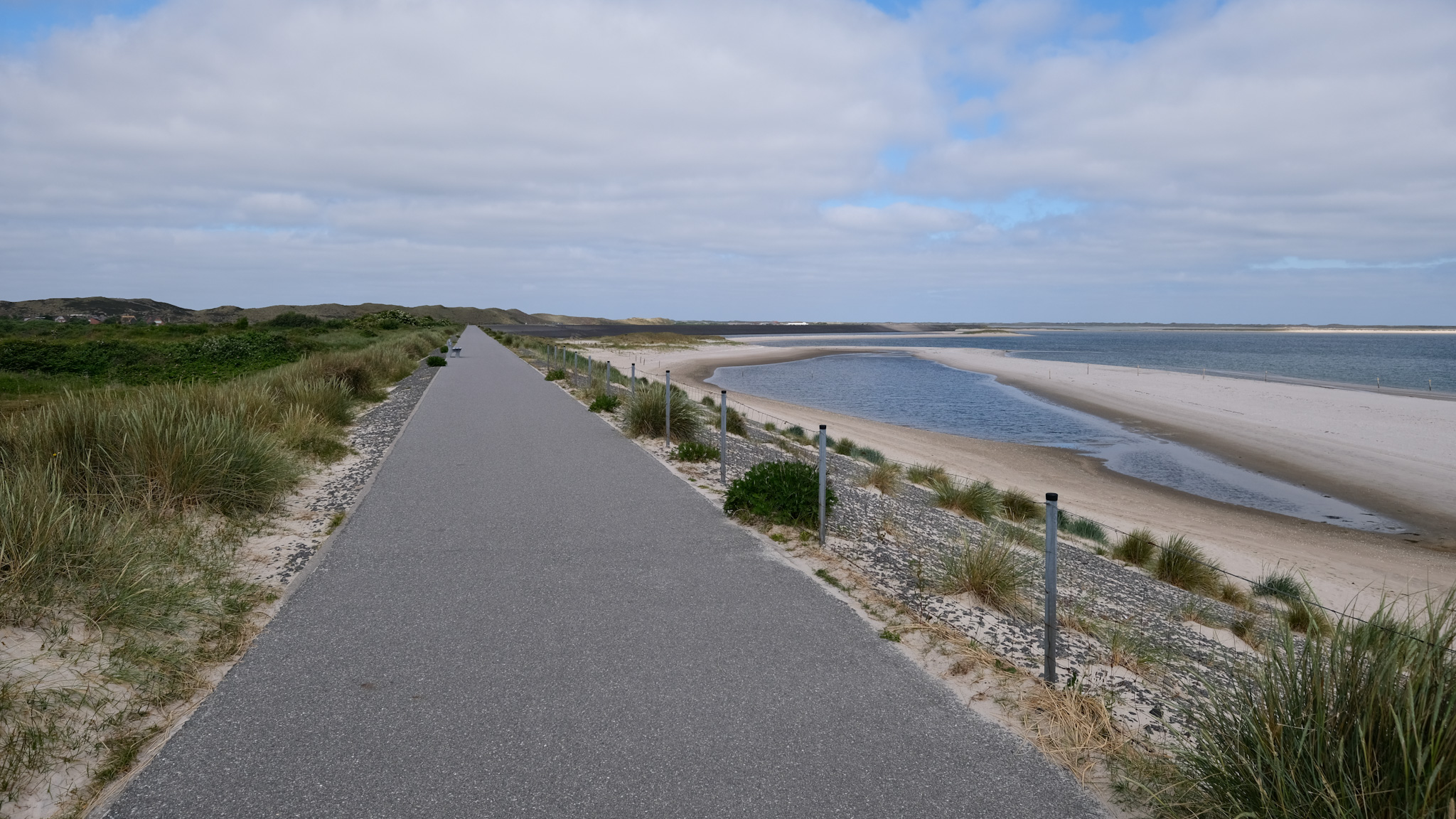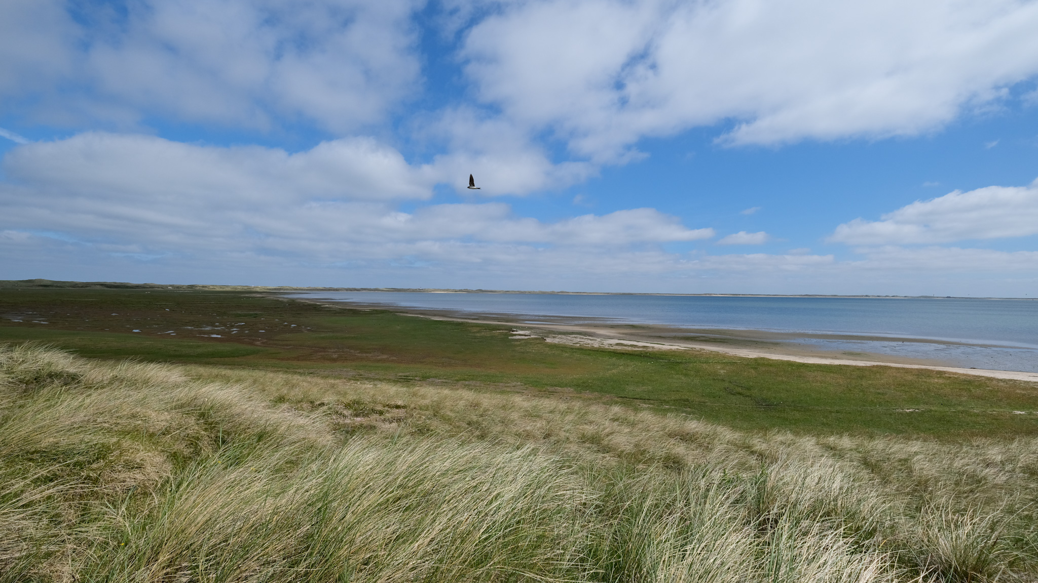 Danach hat man das bebaute Gebiet verlassen und es geht durch ein paar niedrige Dünen am Meer entlang. Rechterhand über das Meer sieht man in einiger Entfernung den rot-weissen Leuchtturm des Ellenbogens, links sieht man noch die Häuser von List. Nach etwa 500 Metern erreicht man den asphaltierten Deich, welcher unmittelbar am Königshafen entlang führt. Hier bläst einem der kühle Westwind entgegen; den Damm teile ich mit mehreren entgegenkommenden Gruppen von Jugendlichen aus der Jugenherberge, die in entgegengesetzter Richtung zum Hafen wollen, sowie mit ein paar weitereren Wandererpaaren. Mein Blick schweift weit über den Königshafen bis zum Ellenbogen oder nach links über ein kleines Gewässer (den Lister Koog) mit verschiedensten Vögel bis zu den grossen Dünen, welche sich immer stärker in’s Blickfeld drängen.