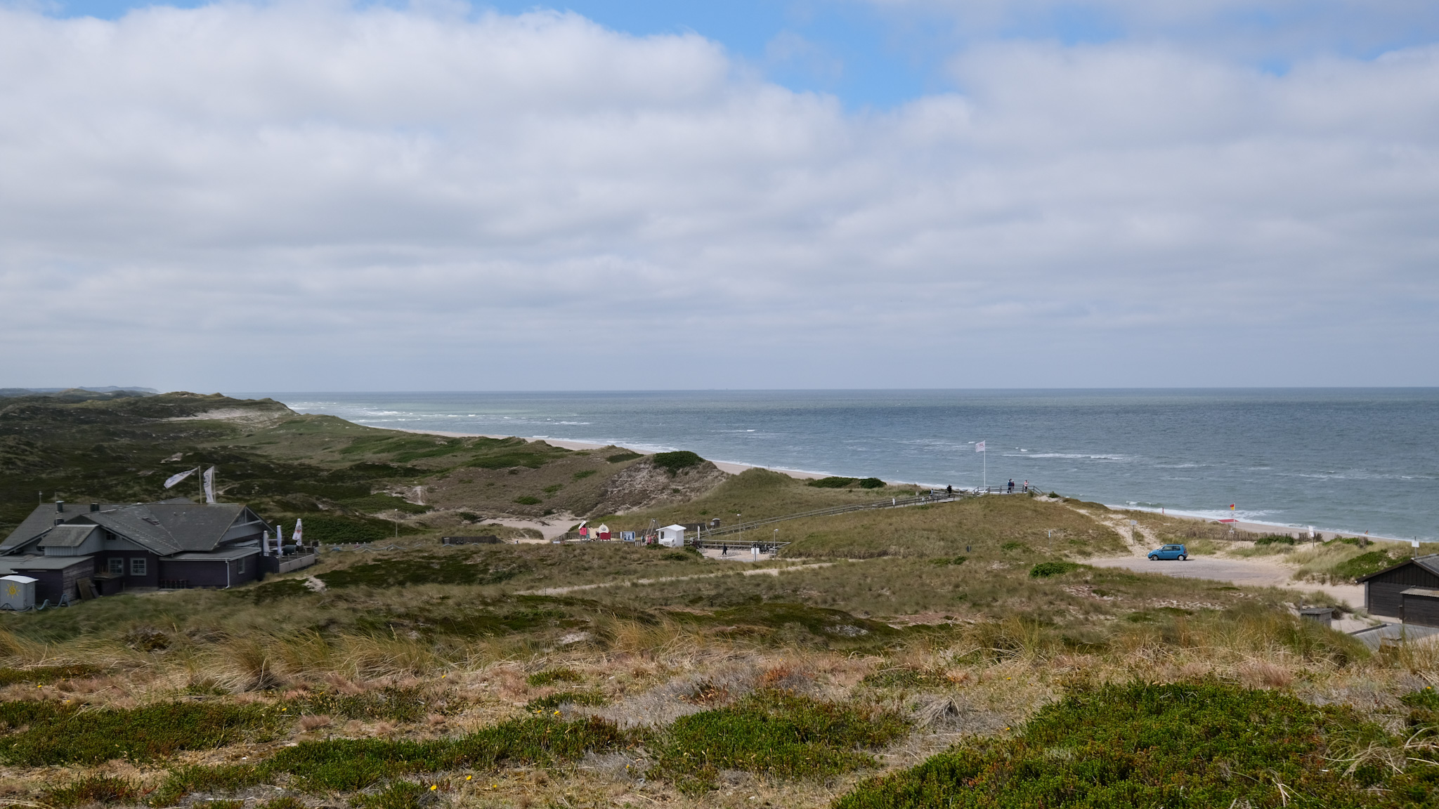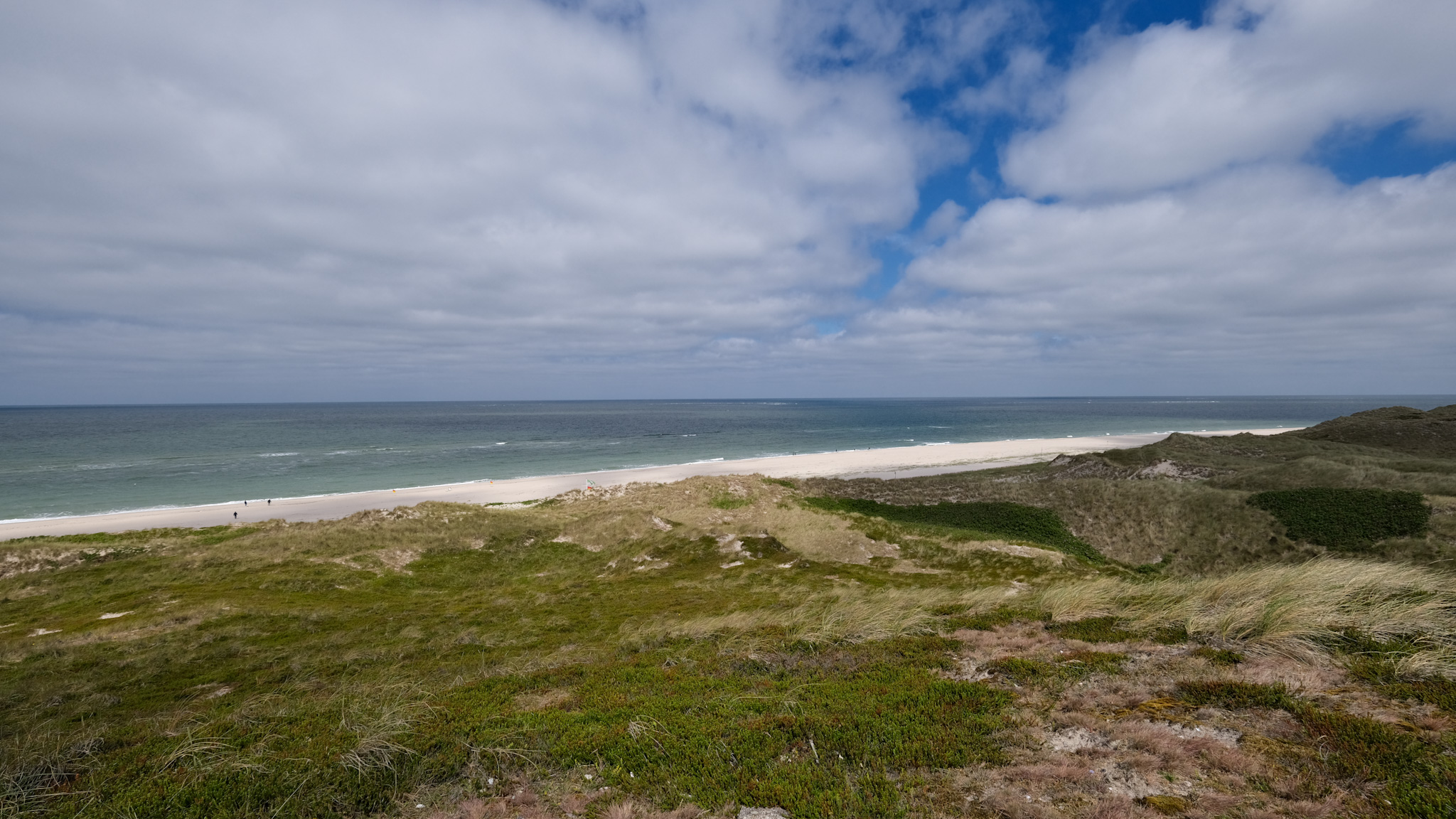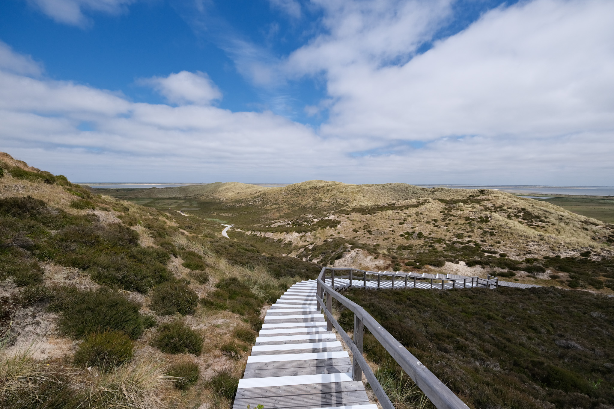 Leider wurde die Bohlentreppe runter gerade erneuert, daher konnte ich nicht den Bohlenweg runter zum grossen Parkplatz (kostenpflichtig) und zur Wonnemeyer Weststrandhalle nehmen. Dort könnte man eine erste Rast einlegen und/oder den Weg zum Weststrand nehmen. Sogar hier wird die Gästekarte beim Übergang zum Strand kontrolliert. Zurück nehme ich daher den selben Abstieg, der hinunter zur Mautstation führt. Von dort geht es dann wieder den selben Weg bis zur Jugendherberge zurück. Dort biegt man rechts in die Strasse zwischen den Häusern ein und folgt am Ende der Gebäude dem Weg links Richtung Zeltplatz und Dünen. Beim Zeltplatz führt der Weg dann rechts mitten in die Dünen. Das ist eine wunderbare Wegstrecke, von der ein Bohlenweg nach rechts in die Höhe zu einem weiteren Aussichtspunkt, dem Jensmettenberg, führt. Hier begeisterte mich trotz des kühlen Windes der Ausblick über das weite Dünental zu den grossen Wanderünen. Das Weiss der Wanderdüne hebt sich klar von der dunklen Dünenheide ab. In die andere Richtung sind wiederum List und der Ellenbogen zu sehen, noch weiter weg ist die Küstenlinie von Römö zu erkennen.