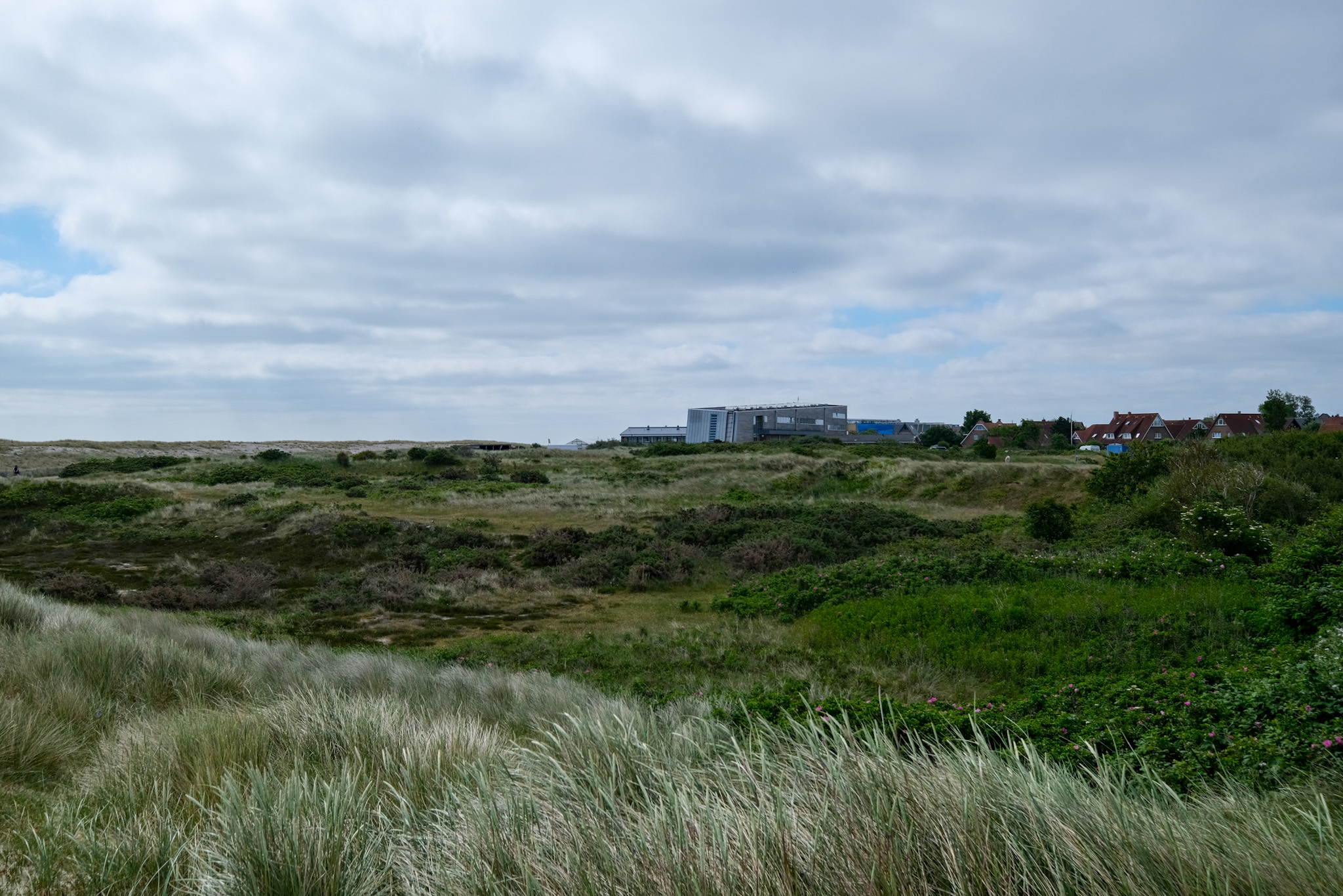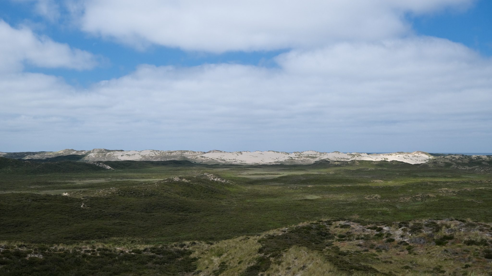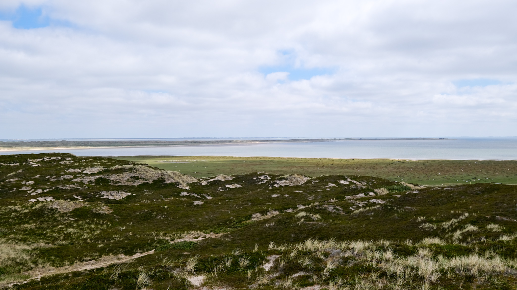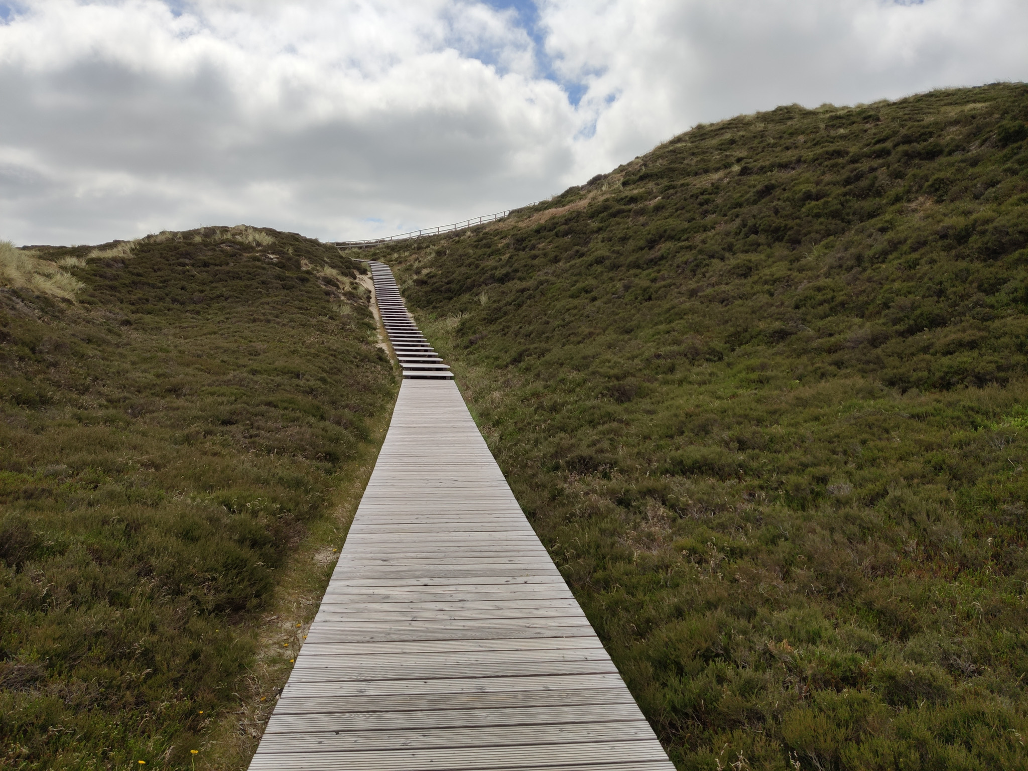 Leider wurde die Bohlentreppe runter gerade erneuert, daher konnte ich nicht den Bohlenweg runter zum grossen Parkplatz (kostenpflichtig) und zur Wonnemeyer Weststrandhalle nehmen. Dort könnte man eine erste Rast einlegen und/oder den Weg zum Weststrand nehmen. Sogar hier wird die Gästekarte beim Übergang zum Strand kontrolliert. Zurück nehme ich daher den selben Abstieg, der hinunter zur Mautstation führt. Von dort geht es dann wieder den selben Weg bis zur Jugendherberge zurück. Dort biegt man rechts in die Strasse zwischen den Häusern ein und folgt am Ende der Gebäude dem Weg links Richtung Zeltplatz und Dünen. Beim Zeltplatz führt der Weg dann rechts mitten in die Dünen. Das ist eine wunderbare Wegstrecke, von der ein Bohlenweg nach rechts in die Höhe zu einem weiteren Aussichtspunkt, dem Jensmettenberg, führt. Hier begeisterte mich trotz des kühlen Windes der Ausblick über das weite Dünental zu den grossen Wanderünen. Das Weiss der Wanderdüne hebt sich klar von der dunklen Dünenheide ab. In die andere Richtung sind wiederum List und der Ellenbogen zu sehen, noch weiter weg ist die Küstenlinie von Römö zu erkennen.