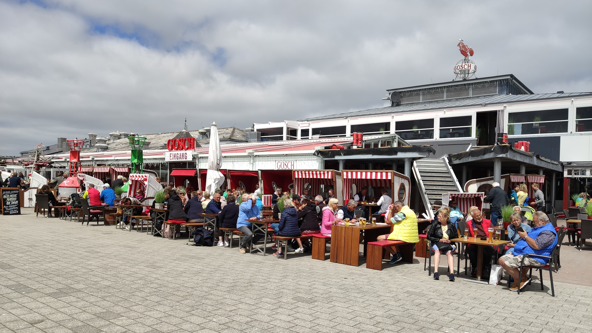 Der Bohlenweg führt nun wieder hinunter zur Strasse am Ortseingang. Da es inzwischen Mittag ist und sich ein kleiner Hunger bemerkbar macht, nehme ich die Strasse(n) nach Links durch das Wohngebiet von List zum Hafen und zu Gosch List (der nördlichsten Fischbude Deutschlands – wer die Bilder auf den beiden verlinkten Beiträgen studiert, wird ein gewisses Wachstum der „Fischbude“ erkennen…). Wer mit dem Bus zurückfahren will, kann auch rechts entlang der Strasse bis zum südlichen Ortseingang gehen: Bis zum Gebäude der Kurverwaltung mit seinem markanten Dachtürmchen und der grossen Uhr und dort nach rechts den Bohlenweg in die Dünen nehmen und dann entlang der Dünenstrasse zur Listlandstrasse, wo der Bus nach Westerland hält. Ich mache aber einen ausgedehnten Lunchbreak und gönne mir ein Schollenfilet mit Bratkartoffeln und ein grosses (alkoholfreies) Bier. Da die Sonne scheint, lasse ich mir diese Mahlzeit draussen schmecken. Das war sehr lecker, aber auch eine ziemlich ansehnliche Portion Fisch – mit einem entsprechenden Preisschild!