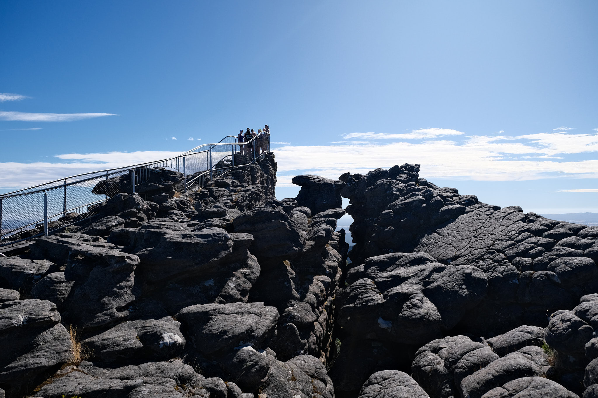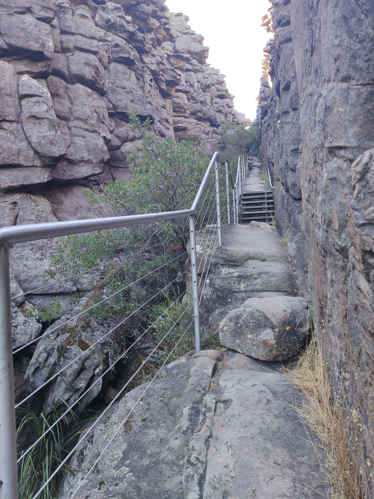 Den Hike zu den Pinnacles mache ich nun schon zum dritten Mal. Er ist jedes Mal wieder wunderbar. Über die schiefe Ebene des Bergrückens geht es stetig und über unzählige Tritte/Treppenstufen immer weiter in die Höhe. Das erste Highlight „Grand Canyon“ ist leider wegen zerstörter Treppen/Leitern am Ende des Canyons dieses Mal nicht Teil des Aufstiegs. Aber es kommt ja noch die etwas kleinere, aber ähnlich beeindruckende „Silent Street“. Der Weg geht durch verschiedene Landschaftstypen und ist daher sehr abwechslungsreich. Nach knapp einer Stunde ist man bei den Pinnacles angekommen und kann von einer mit einem Zaun gesicherten Nadeln die grandiose Aussicht geniessen. Manche können es nicht lassen, sich auf die ungesicherte Felskante zu setzen…