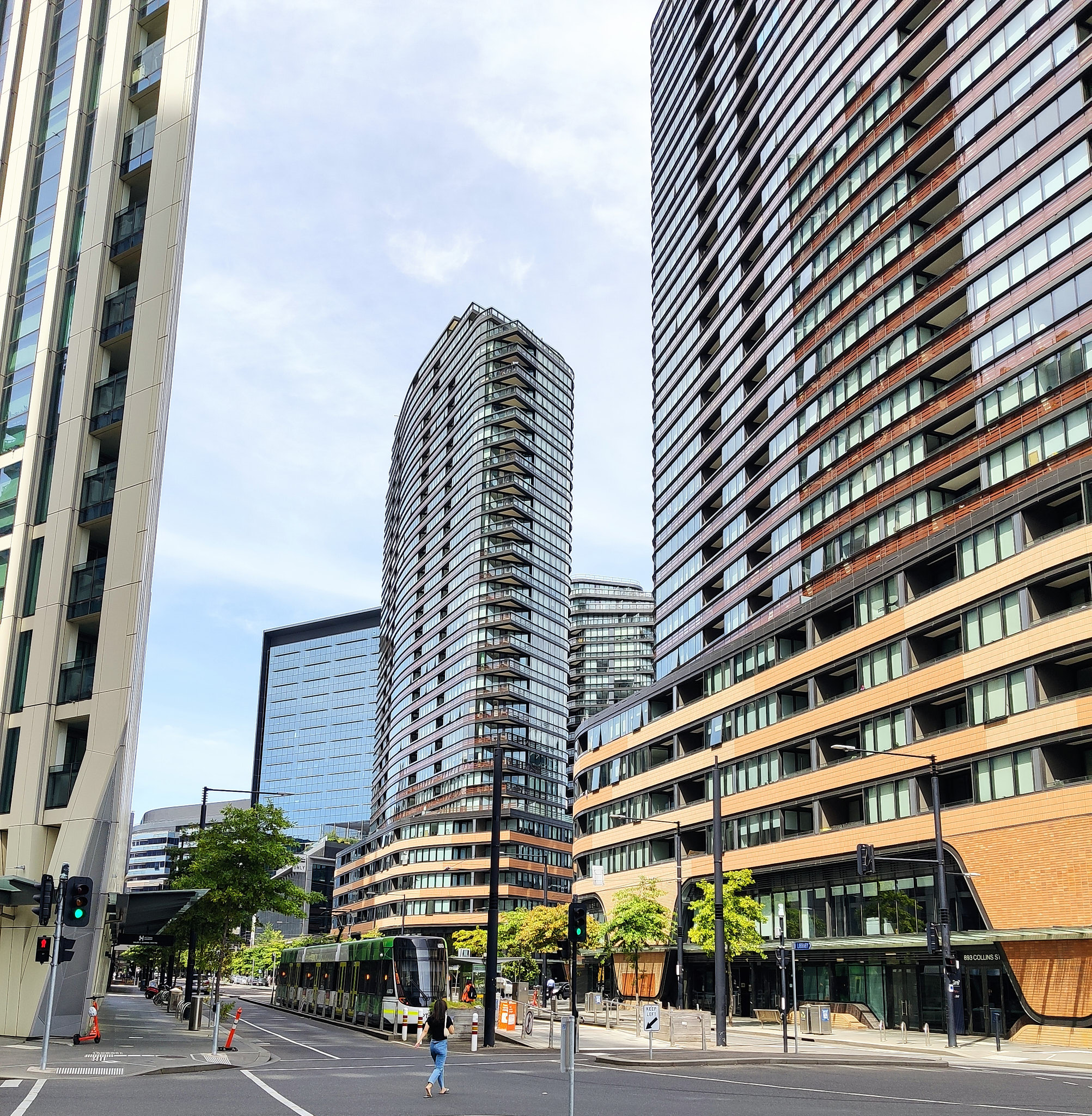 Mit dem Tram ging es dann zurück zum Melbourne Convention and Exhibition Centre (MCEC) am Yarra River. Von der South Wharf Promenade über die Webb Bridge konnte ich ausführlich die vielfältigen, zumeist neueren Hochhäuser der City und der South Wharf bestaunen. Als Schlusspunkt habe ich die ziemlich menschenleeren Docklands besucht, wo auch schon an der Endstation mein 11er Tram nach West Preston/Gilbert Rd wartete.