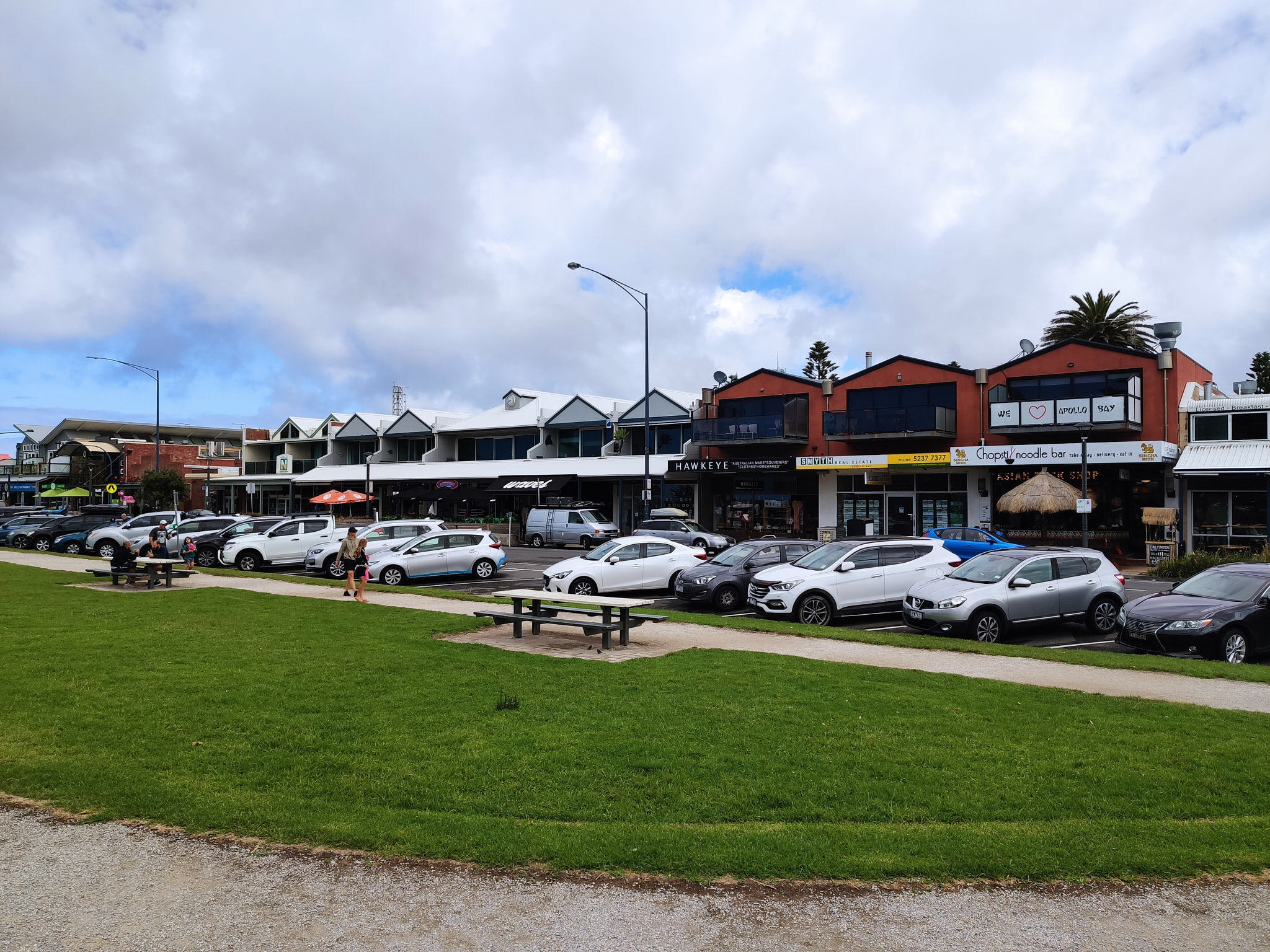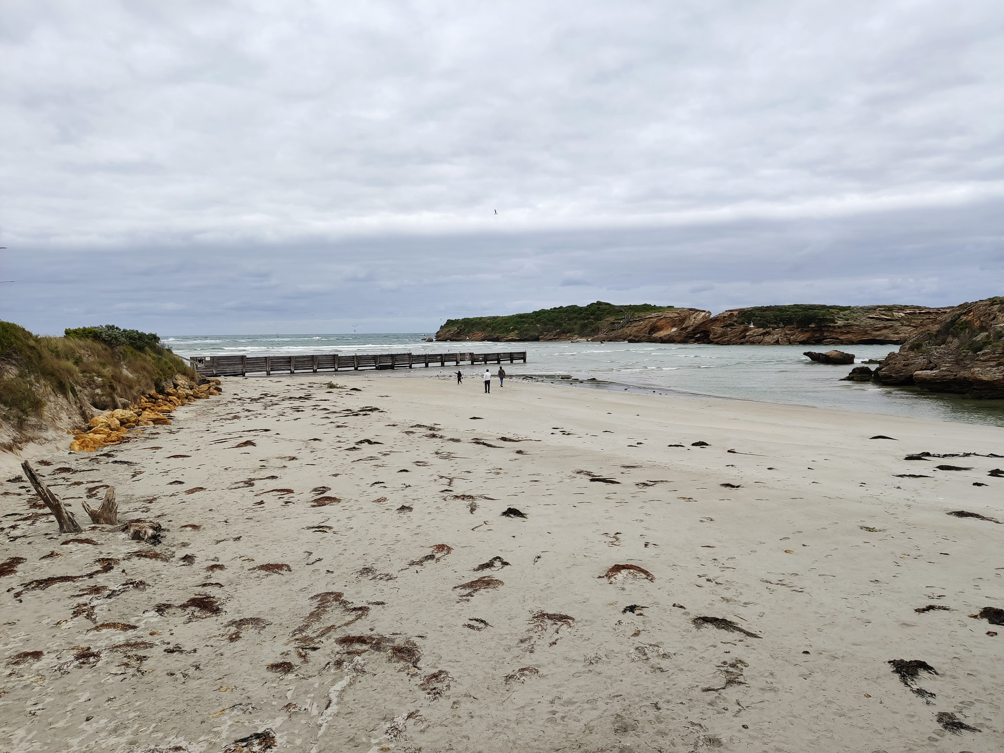 Ich bin also nach zwei Übernachtungen in Torquay (im BIG4 Ingenia Holidays Torquay) und viel kühlerem und unbeständigeren Wetter losgefahren. Meine Vorräte hatte ich schon am nachmittags verregneten Vortag (zu Fuss vom Campingplatz) aus gemacht. Da es temperaturmässig (16°) kein Strandwetter war, habe ich in Torquay kurz die Southside Beach ausgewählt, um doch noch ein paar Surfer zu sehen.