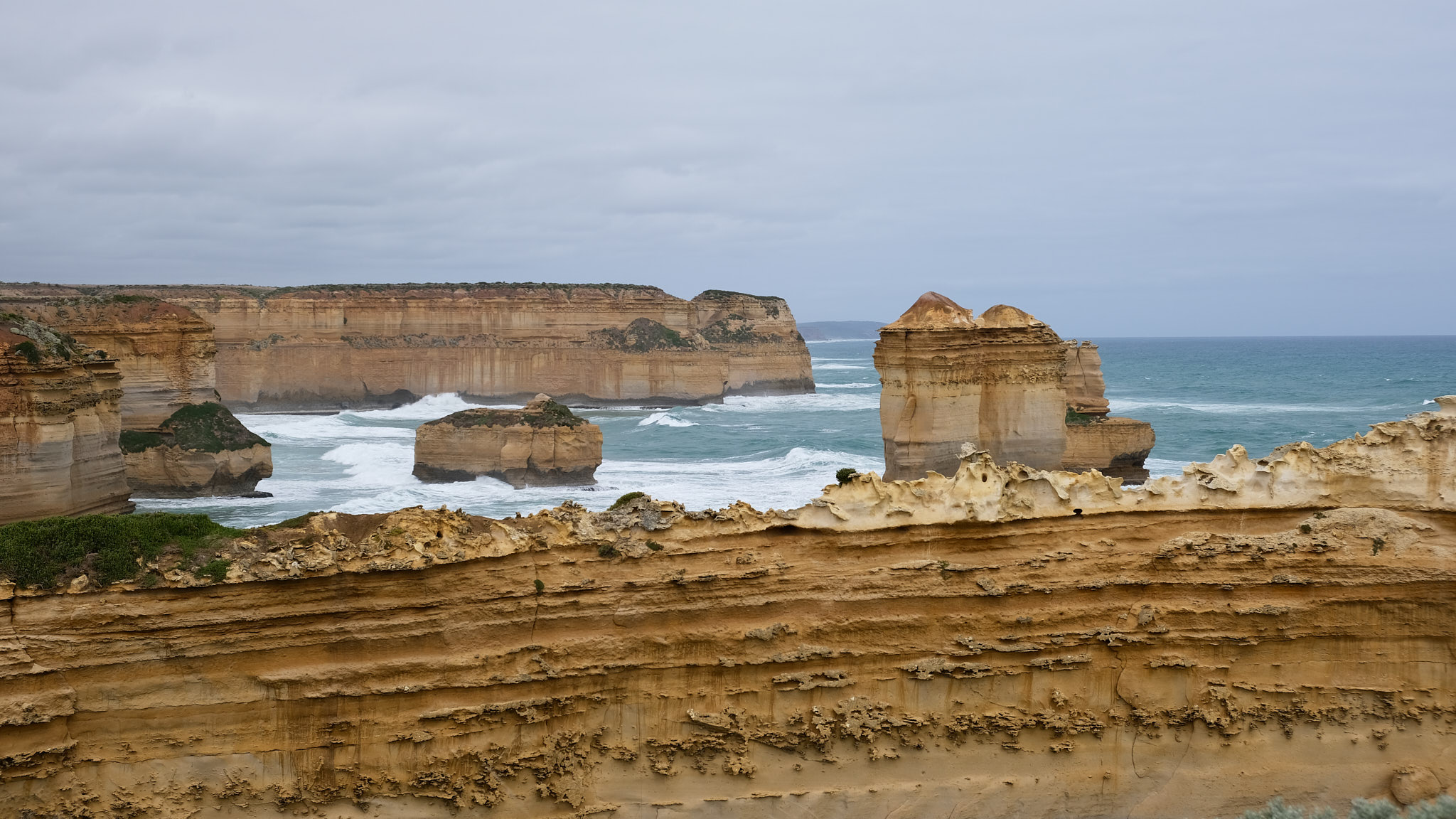 Nach dem Regenwald habe ich dann bis zum späten Nachmittag die bekannten Lookouts an der Shipwreck Coast (respektive Limestone Coast) abgefahren. An der Küste war es mit 19° deutlich wärmer als in der Otway Range und auch die Sonne schaute zwischendurch etwas durch die Wolkendecke durch.
