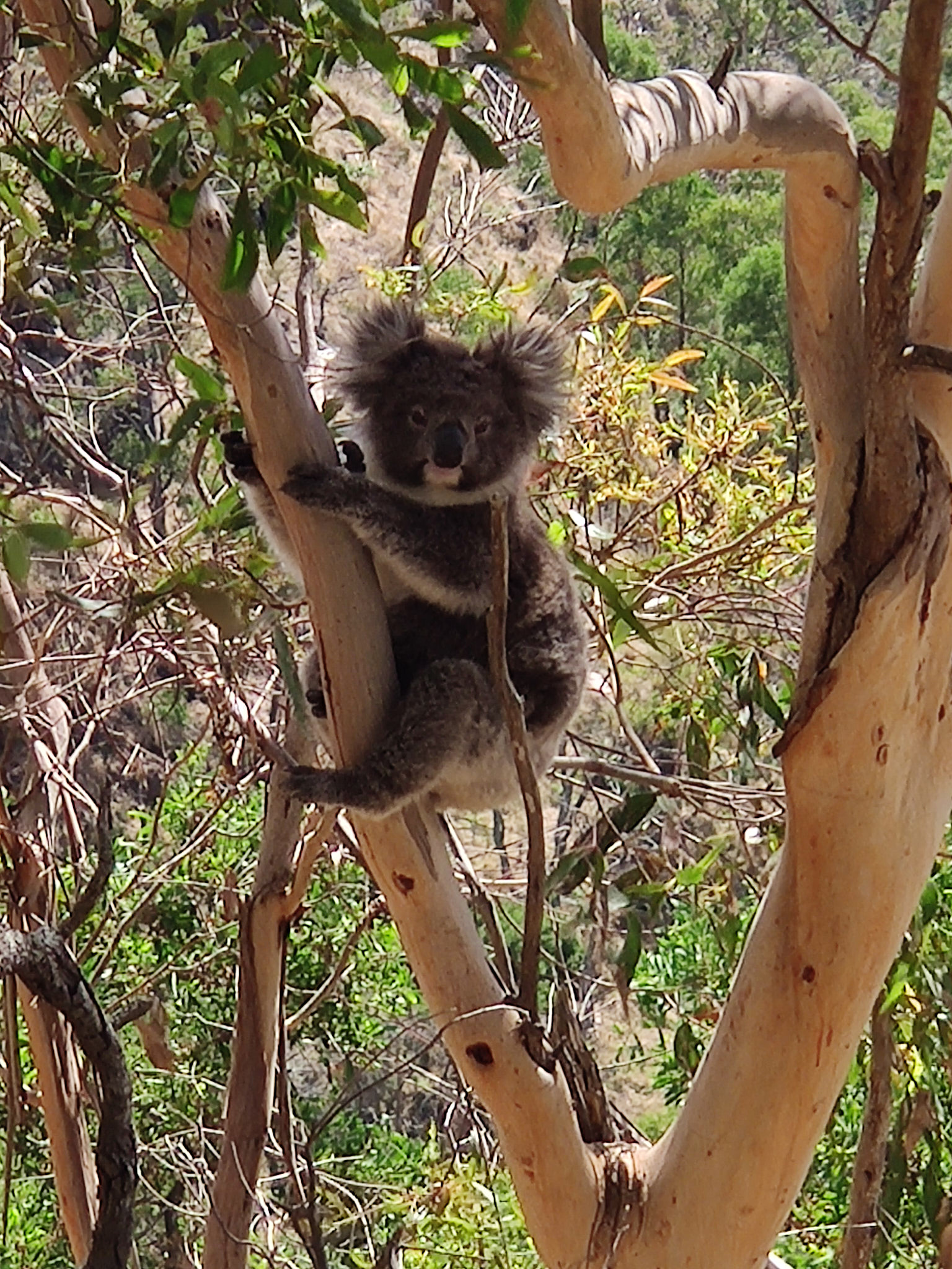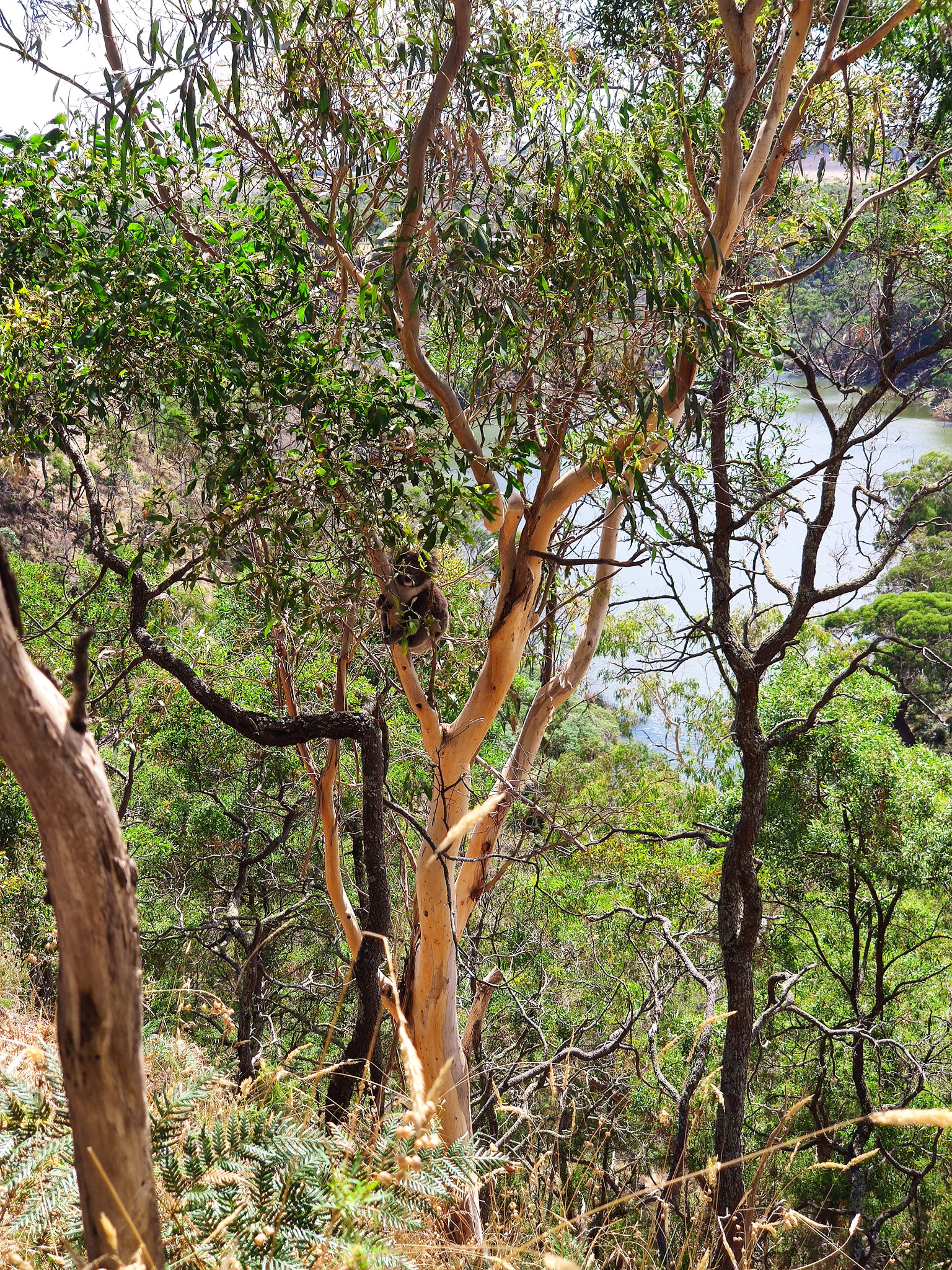 Und wie mir die beiden Ranger auf dem Campground erzählt haben, gibt es hier einige Koalas auf den Bäumen. Einer dieser Koalas hielt sich auf dem Kraterabhang an einem Baumstamm auf auf meiner Kopfhöhe, nicht mehr als 4-5m entfernt fest. Es schien fast so, als würde er sich extra fotogen in Pose werfen. Weitere Koalas habe ich auf dem Weg und im Campground entdeckt. Die waren aber alle sehr weit oben in den Manna Gum Bäumen.
