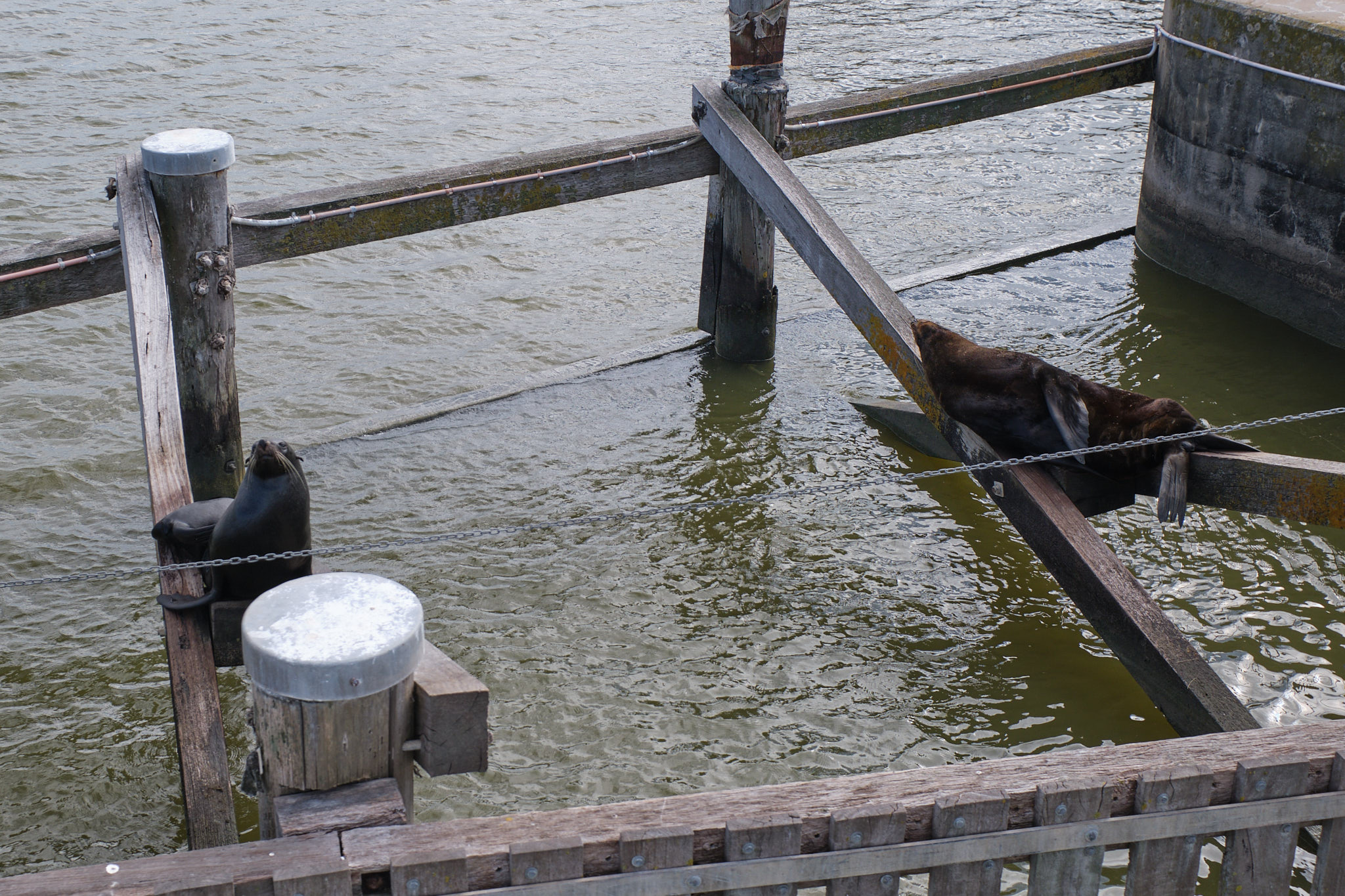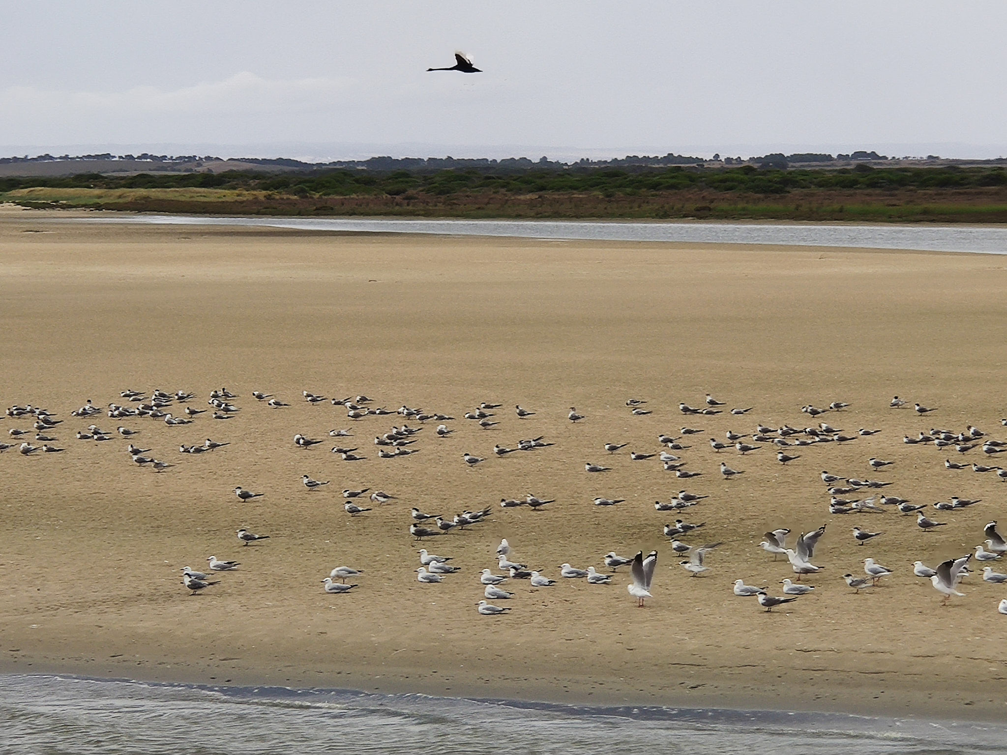 Heute hatte der Murray immer noch ganz leicht einen höheren Wasserstand. Bis vor kurzem waren die Schleusentore noch alle offen, um den Abfluss des Wassers und aller toter Fische (zum Beispiel Millionen von artfremden Karpfen) zu ermöglichen. Durch die Schleusenkammer fahren wir deshalb hinunter auf Meeresspiegelniveau und konnten auf der Murray-Seite ein paar faul herumlungernde Pelzrobben beobachten. Wie die auf das Holzgerüst gelangen, fragt man sich schon. Ich hatte inzwischen das Oberdeck in Beschlag genommen, da das Wetter viel besser und wärmer als angekündigt war. Was für ein Genuss hier oben! Und ich kriegte meinen ersten Kaffee und ein paar Frühstücks-Kekse serviert. Anschliessend fuhren wir auf den Wasserwegen des Coorong und folgen den letzten Kilometern des mächtigen Murray River bis zur Murray Mouth (Mündung) und seiner Öffnung zum Südlichen Ozean.