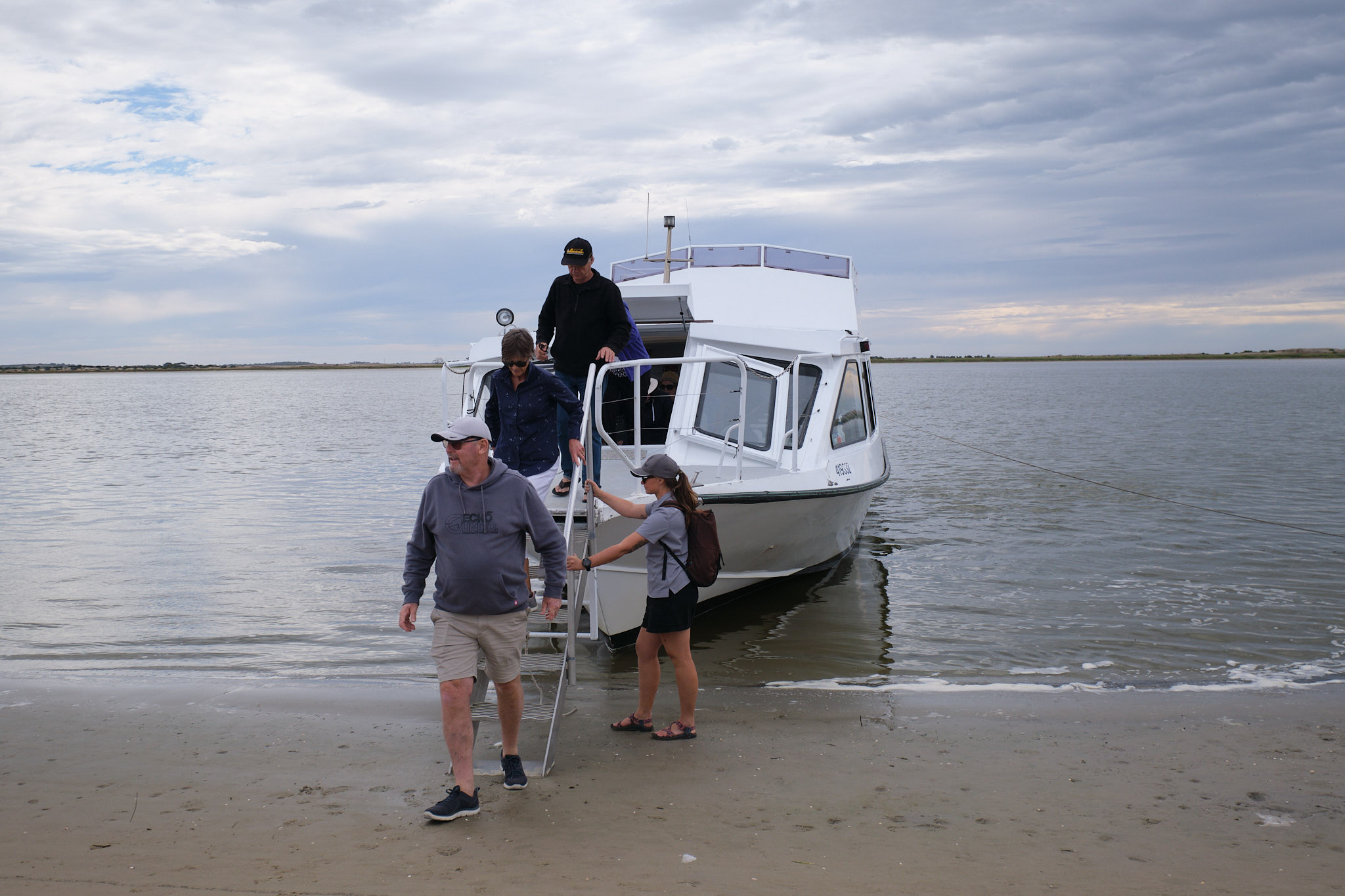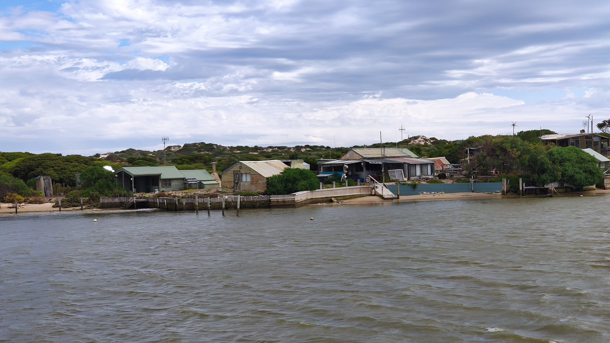 Die Muschelschalen waren nicht nur Abfall, sondern verhindern auch Sandverwehungen: Sie wurden alle mit der runden Seite nach oben abgelegt, damit man besser über sie gehen konnte. Durch den Wind verblasener Sand wird diese Stätte jeden Tag wieder anders gestalten. Wir erfuhren anhand des von seiner Tochter bemalten Wanderstabs, wie das Volk der Ngarrindjeri seit Tausenden von Jahren im Coorong lebte, wie sie die schlimmen Jahre der europäischen Einwanderung und die noch schlimmeren 1950er und 60er Jahre überlebten und nun versuchen, ein besseres Leben und Auskommen – auch mit der Welt der immigrierten Australier – zu finden. Da der Midden auch eine Grabstätte ist, haben wir uns im Gänsemarsch auf einem schmalen Weg durch das Feld bewegt. Rupert zeigt uns in einer Senke, wie man in etwa 30-50cm Tiefe zu reinem Wasser kommt. Das Wasser sickert sehr langsam durch den Sand und wird gefiltert. Es sammelt sich hier in einer Linse entweder über einer wasserundurchlässigen Lehmschicht oder über Salzwasser. Das gefundene Wasser ist reiner als das Leitungswasser und wird jährlich geprüft. Natürlich hatte Rupert viele Plastikbecher dabei und wir konnten dieses Naturwunder alle (inzwischen in der Hitze des schwülen Tages) ausprobieren. Nach der Rückkehr zum Schiff bekamen wir, nach den Strapazen der Wanderung durch die steilen Dünen) einen wohlverdienten Nachmittagstee. Wir schauten uns noch den wichtigsten Drehort von Storm Boy an und hörten ein paar Anekdoten des Drehs. Ich machte noch ein paar Fotos der Fischerhütten und des Murray Mouth. Der Himmel wurde jedoch immer schwärzer und beim ersten Gewitterregen habe ich dann auch einen Platz im Unterdeck eingenommen. Wir fuhren dann rasch entlang des vorgegebenen Wegs zwischen den grünen und roten Bojen zurück zur Schleuse, die nur bis 16:30 betrieben wird. Dieses Mal lagen auf und an der Barrage sehr viele Seals und genossen wohl die Gewitterstimmung! Kurz vor 16:30 waren wir wieder im Hafen von Goolwa.
