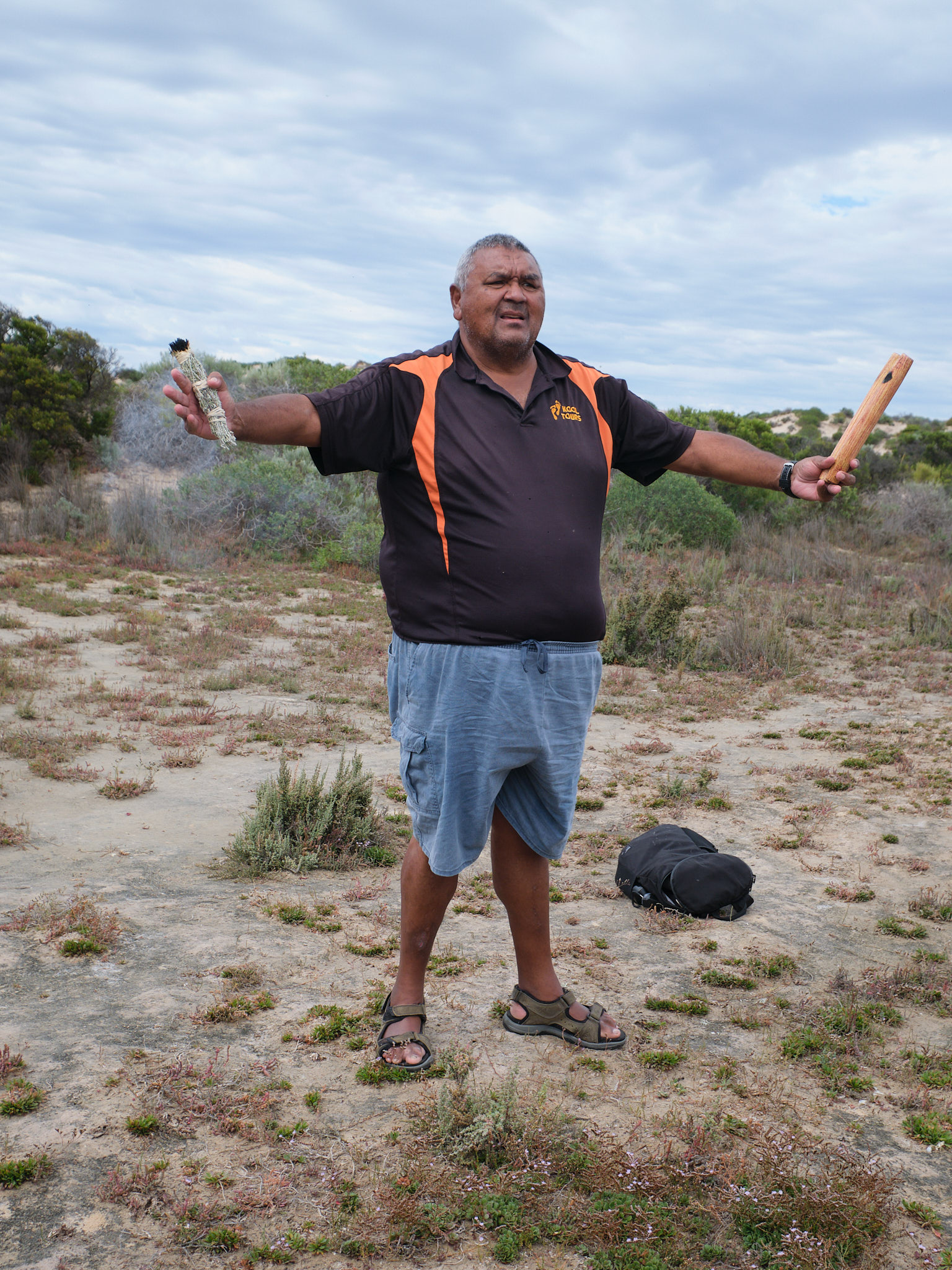 Nach der Besichtigung der Murray-Mündung fahren wir nun richtig in den Coorong in das neuerdings betitelte Storm-Boy-Land. Storm Boy ist ein Filmdrama, basieren auf dem gleichnamigen Jugendbuch von Colin Thiele das im Januar 2019 in Victor Harbor seine Premiere feierte und dann in die australischen Kinos kam. Das scheint für (Süd-)Australier ein wichtiger Film-Meilenstein zu sein, da alle Kinder das Buch und die Geschichte, welche an der unbewohnten Küste Südaustraliens spielt, kennen. Danach passieren das malerische Fischerdorf Coorong Shacks, wo die Fischereirechte noch bis zum Ableben der Rechthalter (im Nationalpark!) gültig sind. Dann legte Ruper das Boot am Strand an, wo wir zu einem Spaziergang durch die Dünen starteten. Doch zuerst empfing uns Mark, Aboriginal Führer der Ngarrindjeri. Er hiess uns am Coorong willkommen und teilte mit uns seine kulturelle Interpretation und führte eine Rauchzeremonie durch. Das fand ich ziemlich berührend.