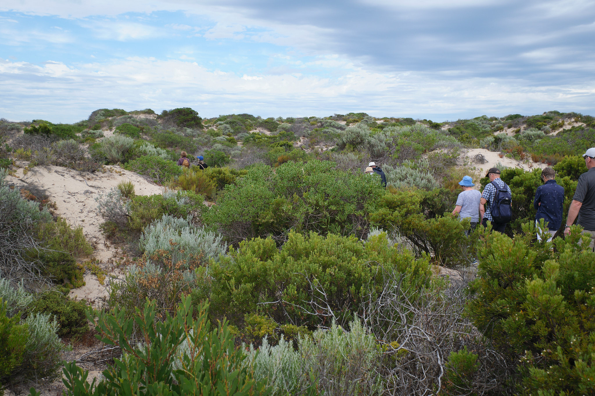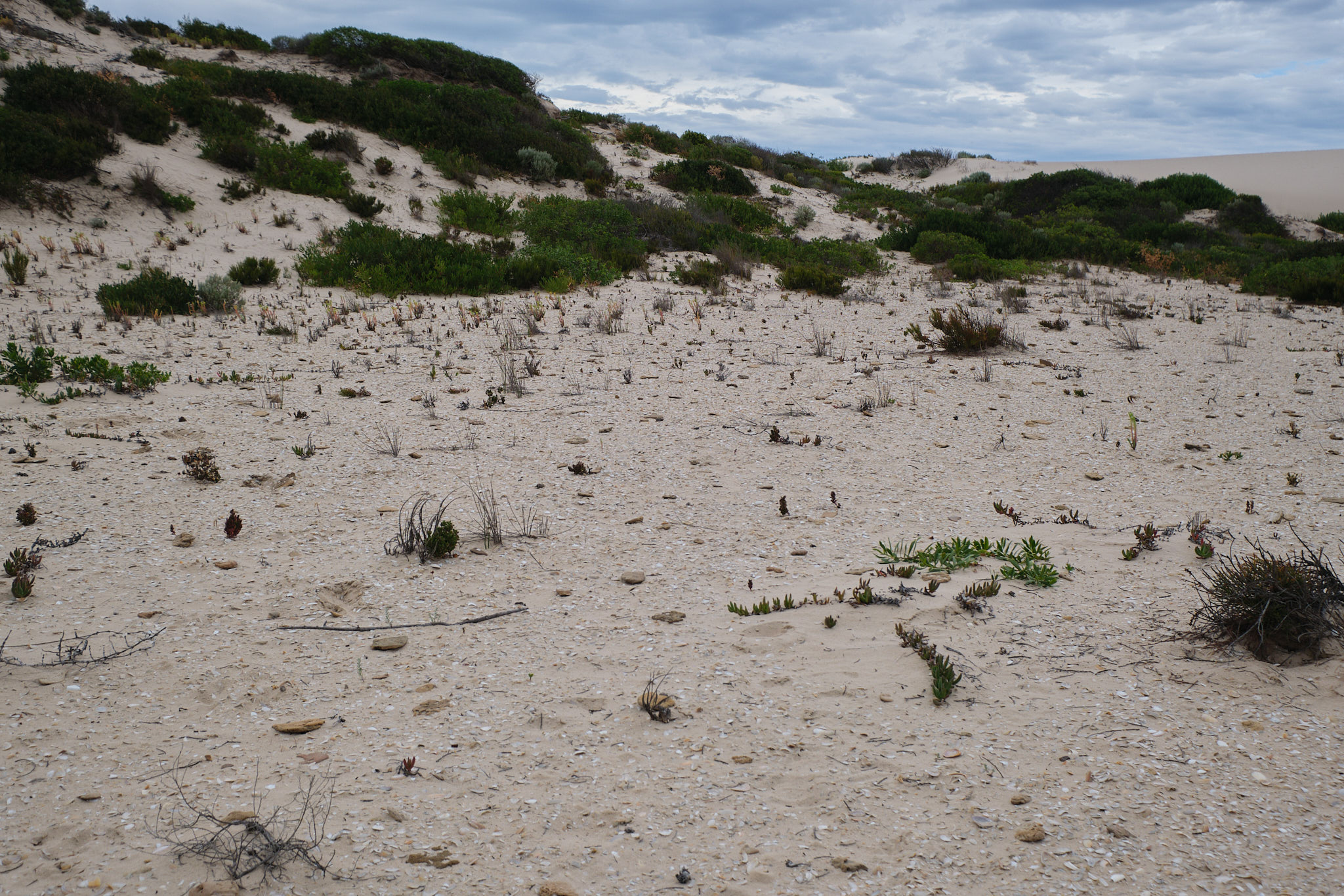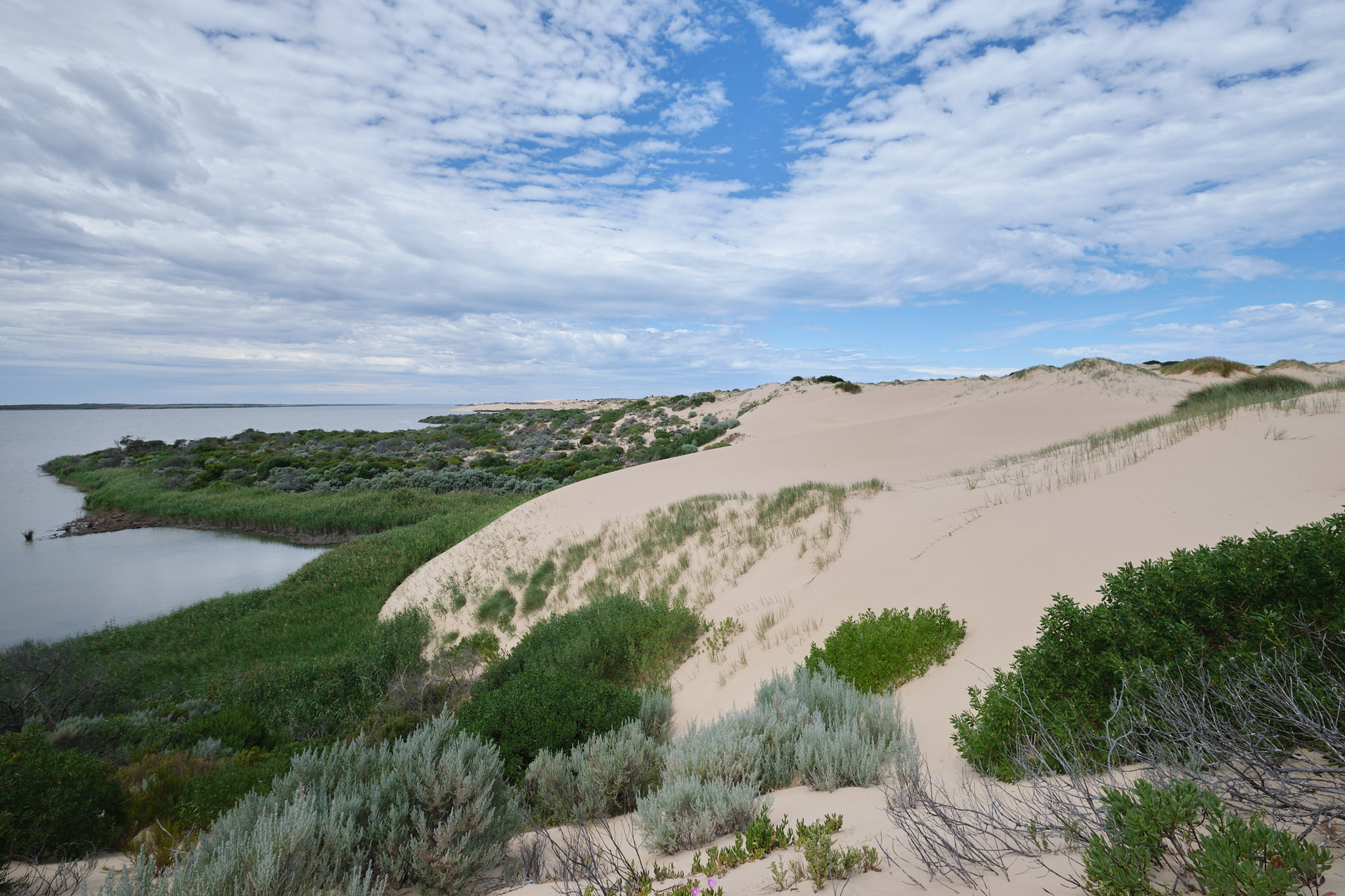 Unser zweiter Halt hiess Cattle Point. Hier ist der Coorong so seicht, dass hier früher Schafe zum Weiden in die Dünenlandschaft getrieben wurden. Wir machten hier mit Rupert und Mark einen weiteren geführten Spaziergang hoch hinauf auf die spektakulären Sanddünen. Hier erklärte uns Mark eine der bedeutendsten kulturellen Stätten der Ngarrindjeri (ein gigantischer Midden mit unendlich vielen Muschelschalen aus den zehntausenden von Jahren der Nutzung).