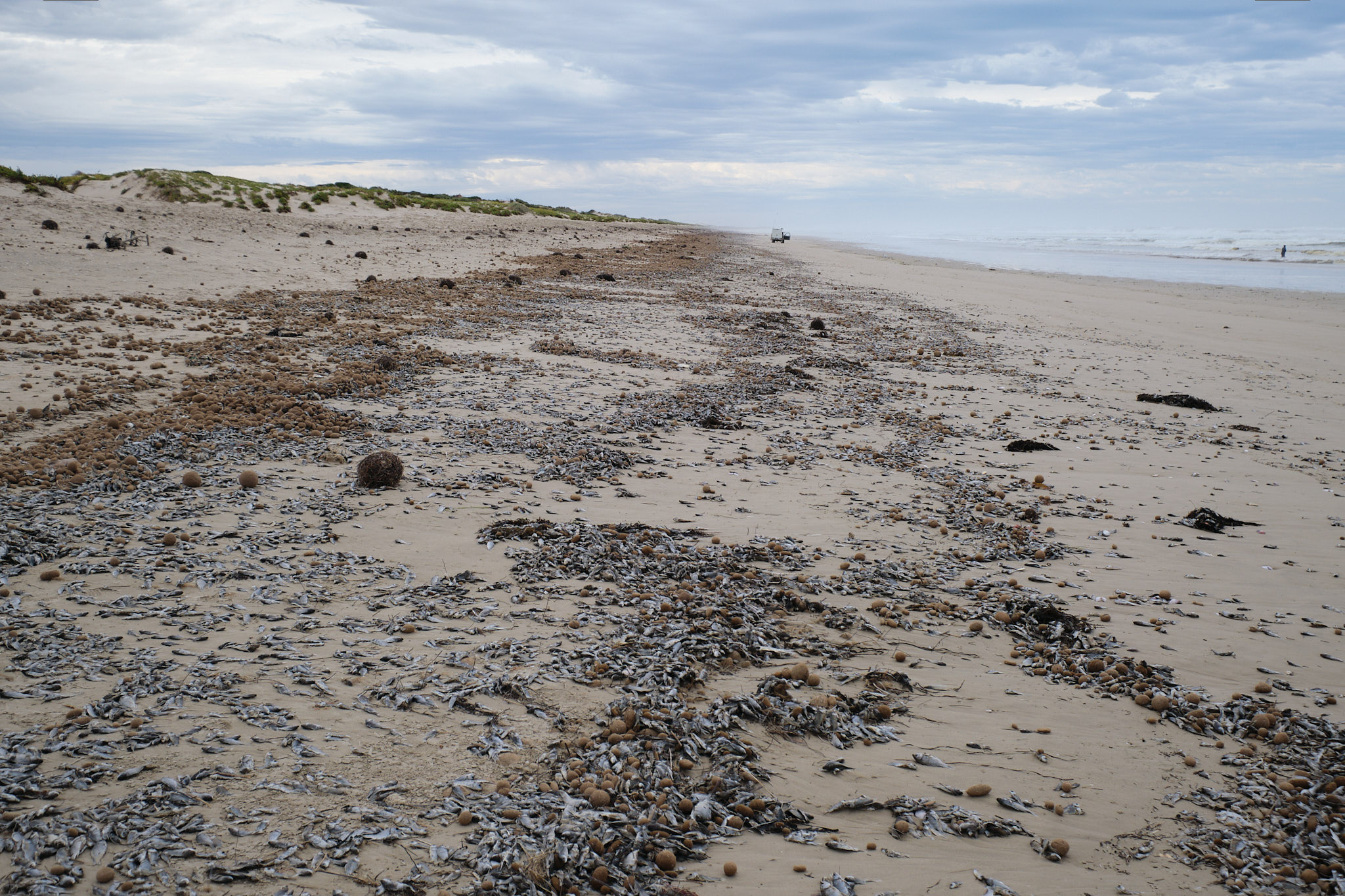 Jess führte uns dann über einem Bush-Tucker-Trail zur berüchtigten 90-Mile Beach. In der Nähe einer Midden (kulturellen Stätten der Ngarrindjeri) mit vielen Muschelschalen erklärte uns die diversen Beeren und den Thymian-Busch. Am Strand lagen Millionen von toten Karpfen, klein und gross. Das hat ziemlich nach totem Fisch gerochen. Aber der Strand und die tosende Brandung des Südlichen Ozeans waren sehr beeindruckend.