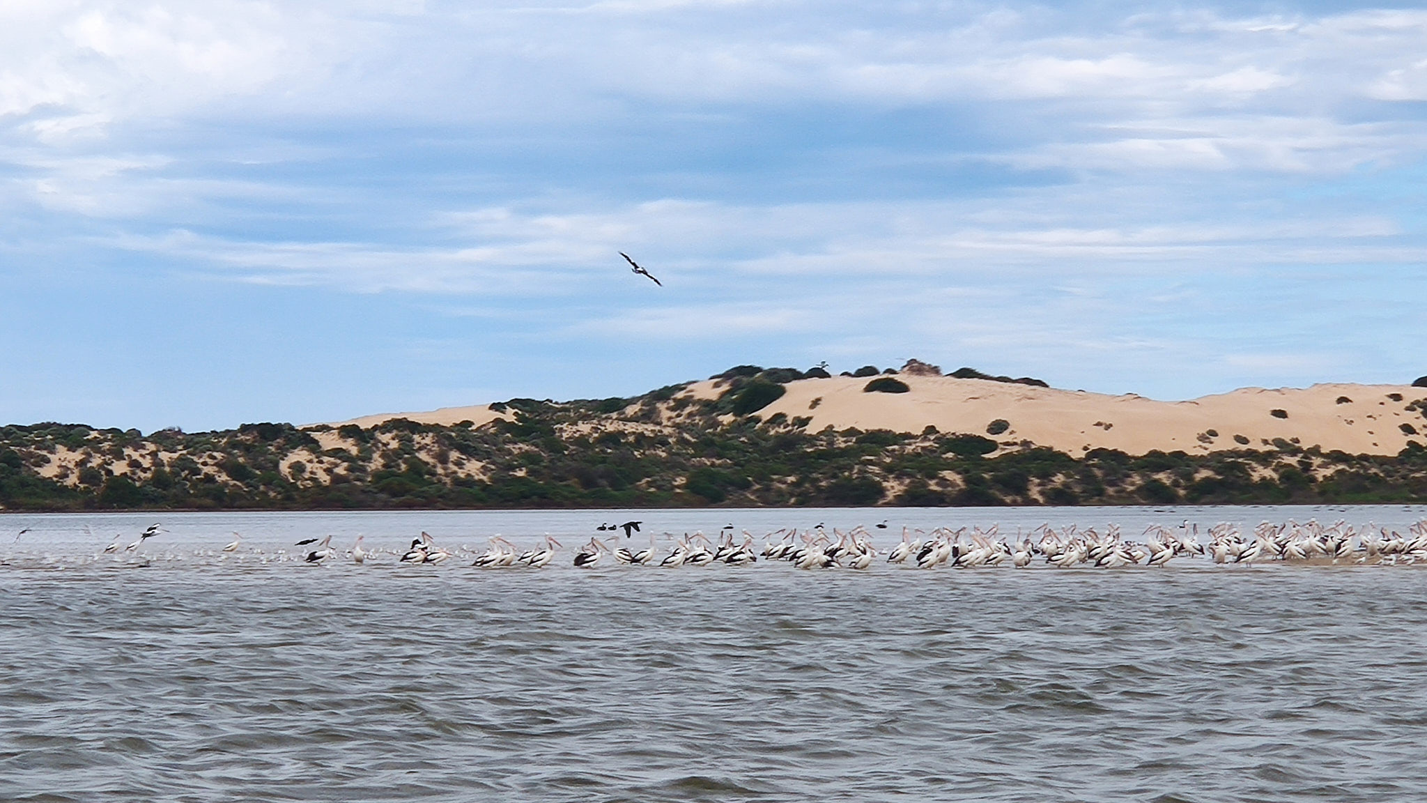 Am Strand haben wir dieses Mal nicht nach Pipi’s/Kuti (Cockles, respektive Muscheln) mit dem „Coorong Shuffle“ gegraben. Auf dem Rückweg zum Schiff haben wir mit viel Spass überall die Beeren von den Büschen gepflückt und gegessen. Unser Skipper Rupert hatte schon fleissig Pipi’s (natürlich vom Markt, mit verschiedenen Saucen) gekocht, die wir probieren durften. Während wir entlang den hochaufragenden Dünen fuhren, verschiedene Vogelarten und Emus entdeckten, gab es einen kleinen Lunch an Bord (ein kurzer Abstecher von mir in’s Unterdeck). Wir fuhren an den anderen Stauwehren (Barrages) vorbei und tauchten tief in den Coorong ein.