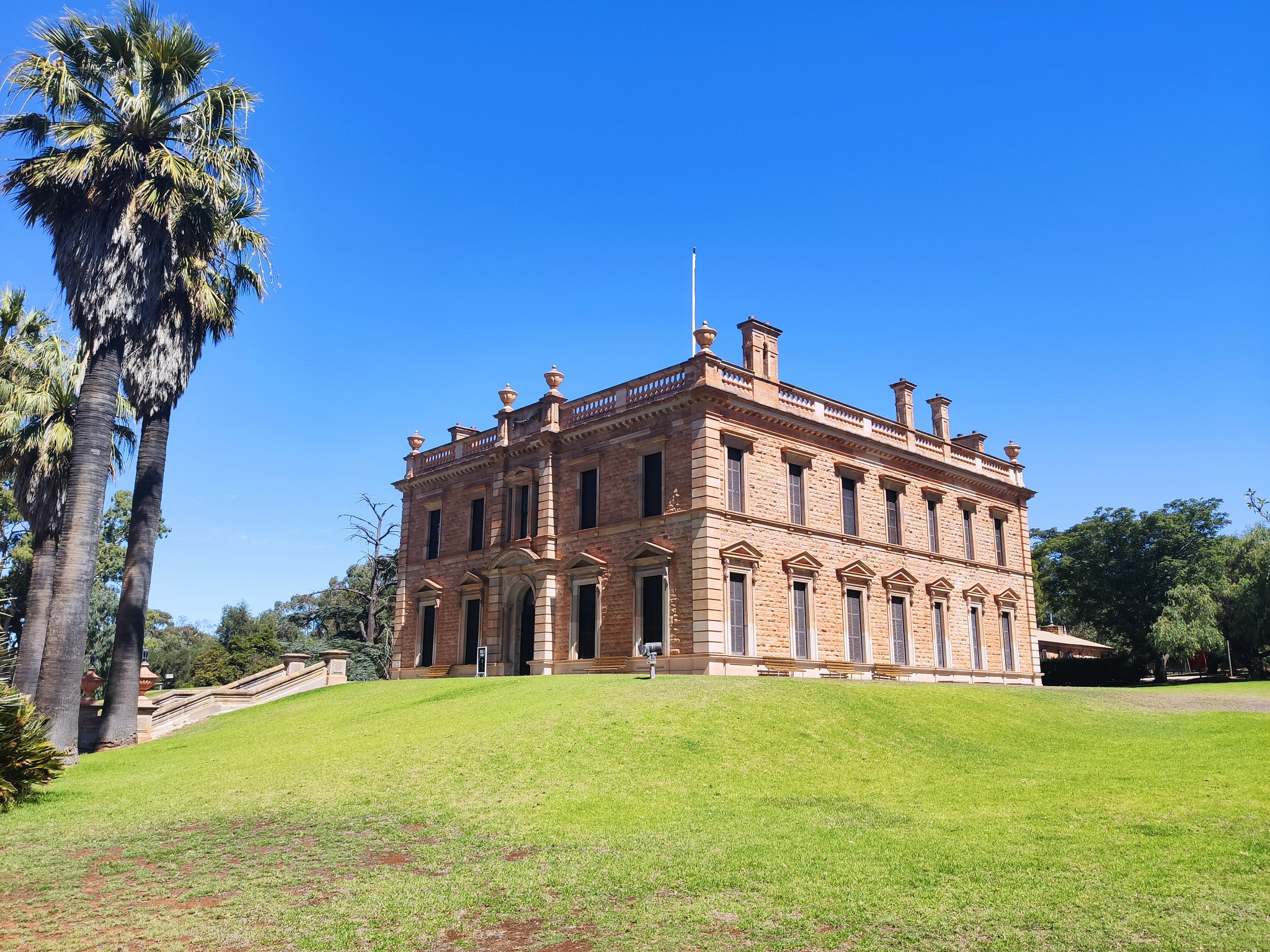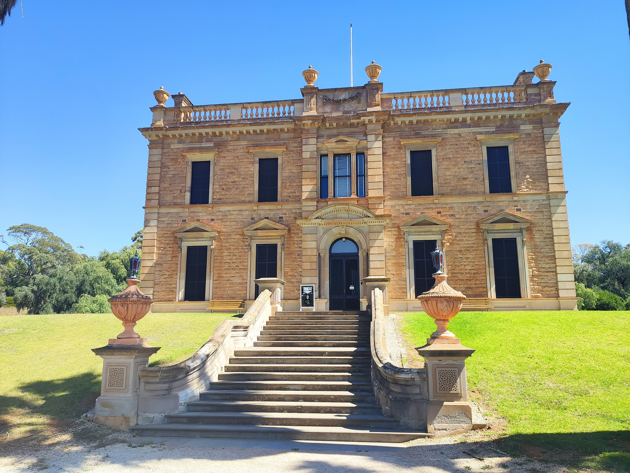 Als nächsten Zwischenstopp habe ich mir Martindale Hall ausgesucht. Dieses herrschaftliche Gutsbesitzer-Haus („a heritage listed, Georgian styled with Italianate influenced sandstone mansion) mitten in der unendlichen gelben und abgeernteten hügeligen Landschaft würde man hier in Australien eigentlich nicht verorten. Eher in Grossbritannien, dann aber wohl deutlich grösser. Martindale Hall ist heute ein Museum, welches einen Blick zurück in die Zeit des anmutigen Lebens auf einem grossen, Viehzucht betreibenden, Anwesen in den späten 1800er bis frühen 1900er Jahren erlaubt. Gerüchten zufolge gab es 14 Bedienstete, von denen vier in der Halle lebten und rund um die Uhr auf Abruf zur Verfügung standen, um die Bedürfnisse von zwei Personen zu befriedigen – so extravagant war der Lebensstil der Oberschicht eines wohlhabenden Viehzüchters. Dieses Gerücht kann man vor Ort mit der zu besichtigenden Klingelanlage nachvollziehen. Auf zwei Stockwerken bin ich durch beeindruckend eingerichtete Räume und eine Vielzahl von Schlafzimmern mit Ensuite-Bädern gegangen. Allerdings muss man zur Kenntnis nehmen, dass vieles so zusammengestellt oder neu nachgebaut wurde, um ein möglichst gutes Bild der damaligen Einrichtung zu geben. Ich hab’s nicht bereut, diesen kleinen Abstecher gemacht zu haben. Nur schon der Empfang beim Eingang war den Eintritt wert: Wer das verstehen möchte, muss selber hin.