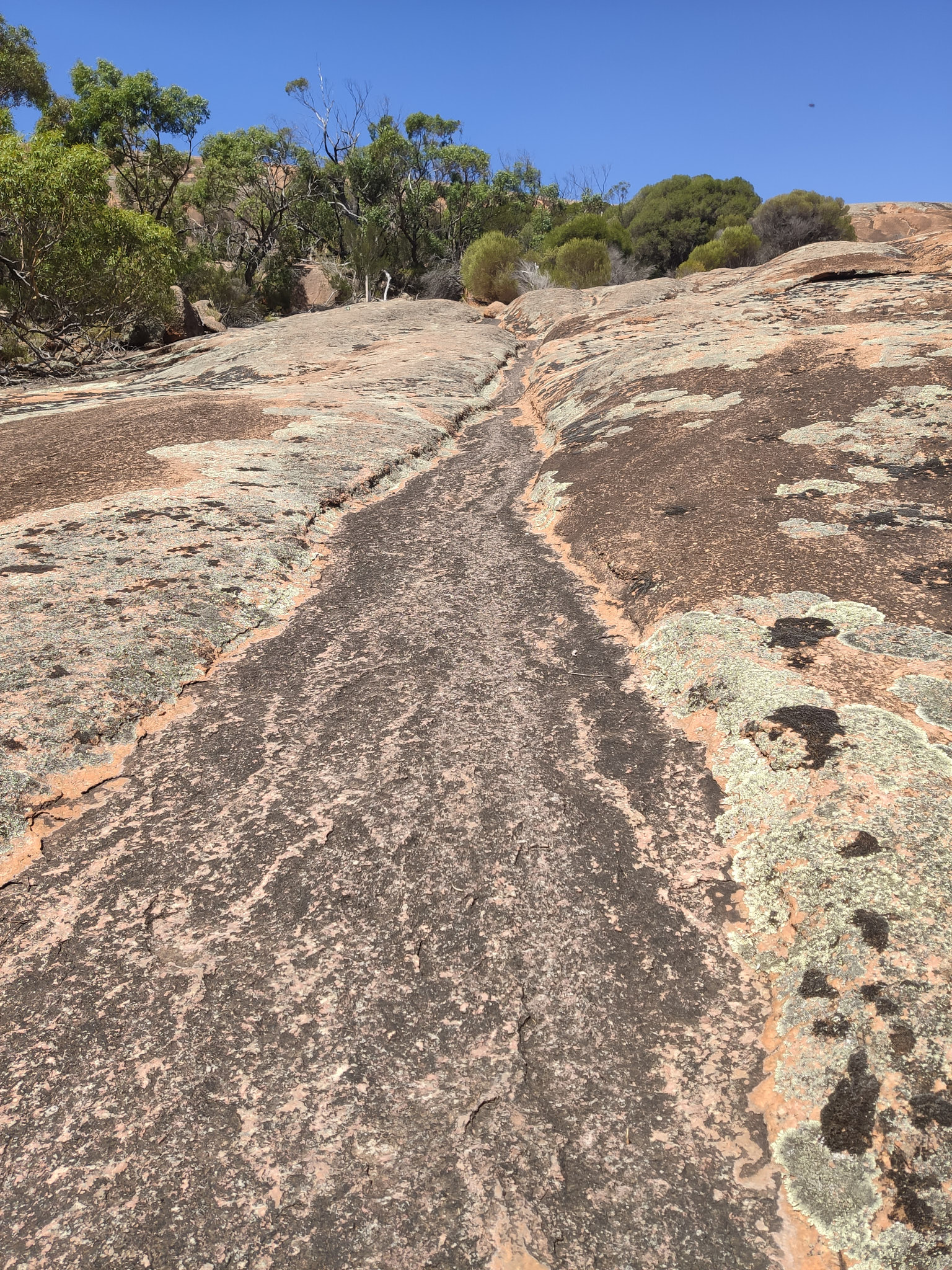 Auf dem rund halbstündigen Weg rauf und runter lernt man die lokale Fauna sowie neue Begriffe wie A-Tent (Granitblöcke bilden ein Zelt wie ein A), Tafoni (Löcher oder Höhlen im Fels), Gnammas (Wasserlöcher, das Wort kommt aus der Nyungar Sprache) und Rillen (Namensgebung durch deutsche Forscher…). Mount Wudinna hat sich gebildet, als durch das Erodieren von Gesteinsschichten über dem Granit der Druck nachliess und der Granit nach oben gewölbt wurde. Die grossen Felsen (Boulder) auf den Flanken des Monolithen waren (und sind) Teile des Granitblockes und wurden an Ort und Stelle so erodiert.
