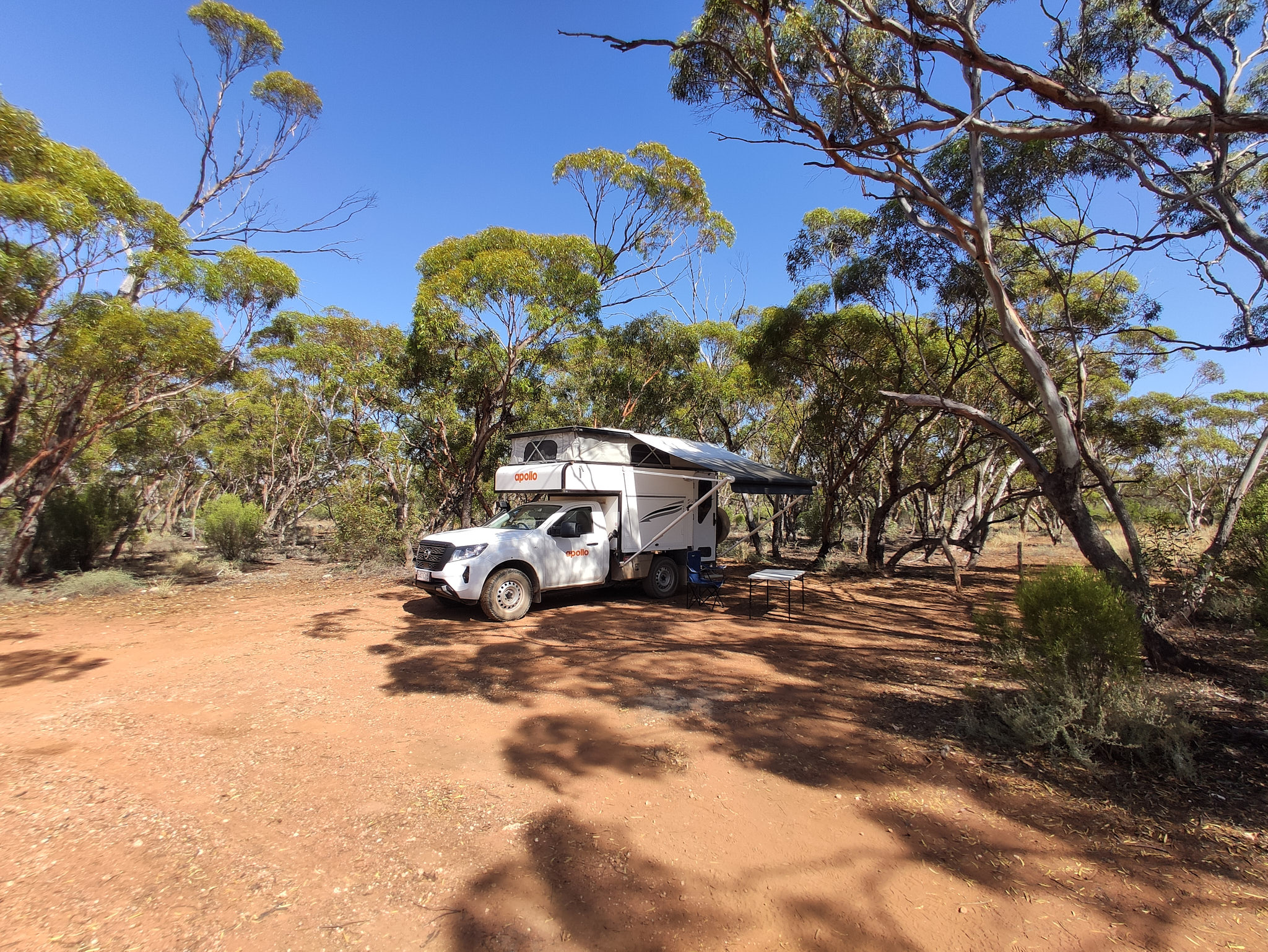Meine abwechslungsreiche Fahrt führt nun aber schon an den ersten Übernachtungsort, den Waganny Campground. Der ist sehr weitläufig, hat Platz für 11 Fahrzeuge und hat im Zentrum ein Plumpsklo (allerdings papierlos, wie sich herausstellte). Ich habe rasch einen sehr schönen, schattigen Platz für den Campervan gefunden. Am Abend waren es drei Fahrzeuge auf dem Campground.