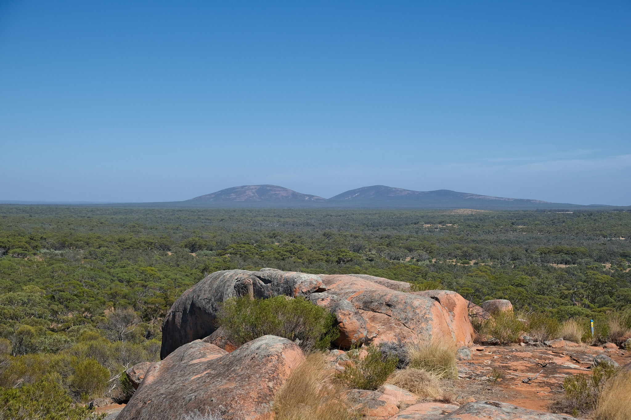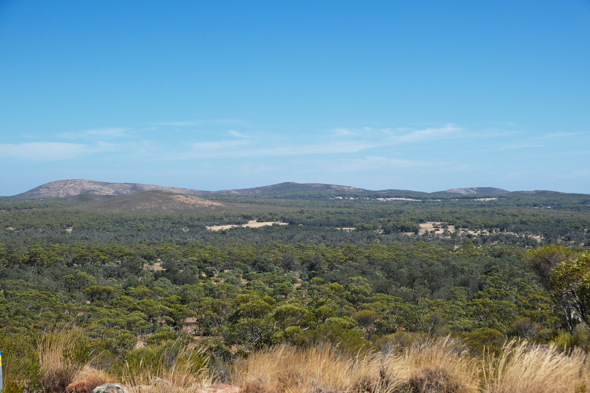 Nachdem ich einen kleinen Lunch verdrückt hatte, macht ich mich kurz nach Mittag auf den 4km (hin und zurück) langen Waganny Hill Walk Trail. Der führt zuerst durch die ehemalige Weidelanschaft mit goldgelb verdorrtem Gras, durch Baumbestand und dann auf den Waganny Hill, einen der vielen Granithügel. Auf dem selben Weg geht es dann wieder zurück. Die Farben und die Stimmung auf dieser einfachen Wanderung haben mir sehr gut gefallen. Auch habe ich, sogar mitten am Nachmittag, ein paar Kängurus (Euros) beobachten können. Dass diese kurze Wanderung eine der längsten im Park ist, fiel mir erst am übernächsten Tag auf.
