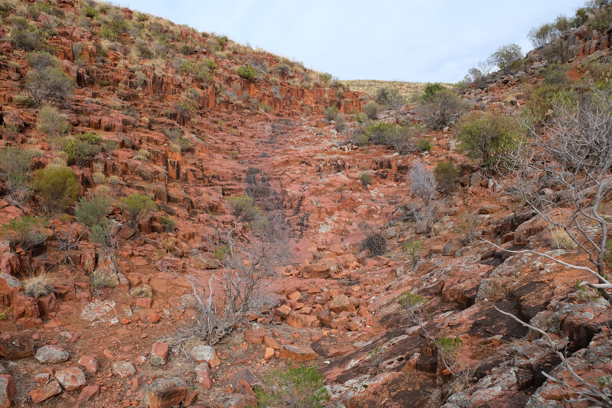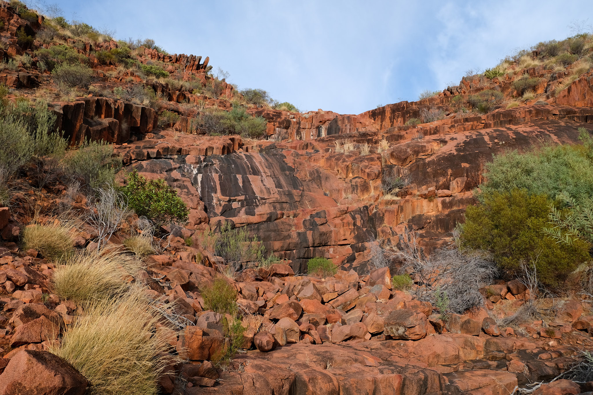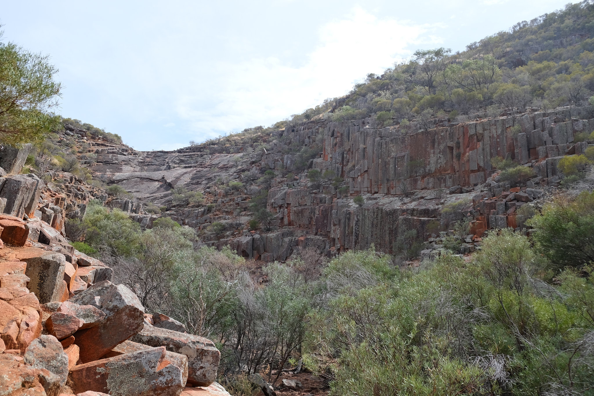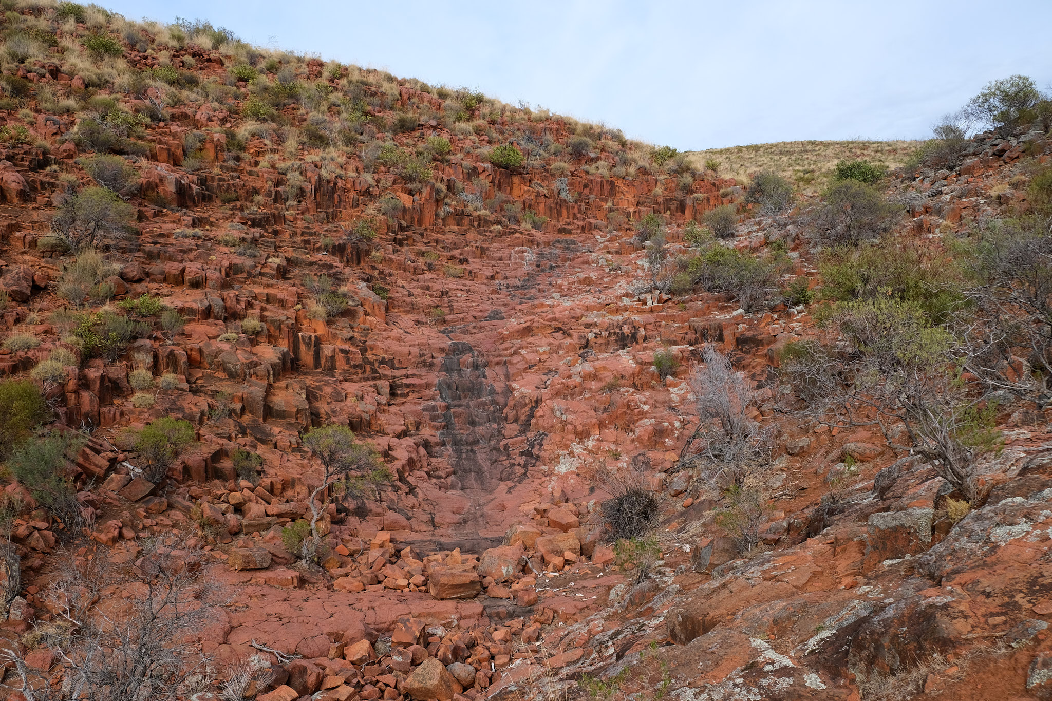 Auf dem (auch kurzen) Weg zum Yandinga Wasserfall habe ich zwar einige Wombat-Spuren entdecken können, aber natürlich keines der Tiere gesehen. Dafür bin ich die ersten zwei oder drei Stufen des wasserlosen Wasserfalls raufgeklettert und habe die Aussicht genossen. Bei beiden Wasserfällen hatte es ähnliche Felsformationen wie bei den „Organ Pipes“. Es gab also nichts wirklich neues zu entdecken. Das waren daher genug ausgetrocknete Wasserfälle für heute.