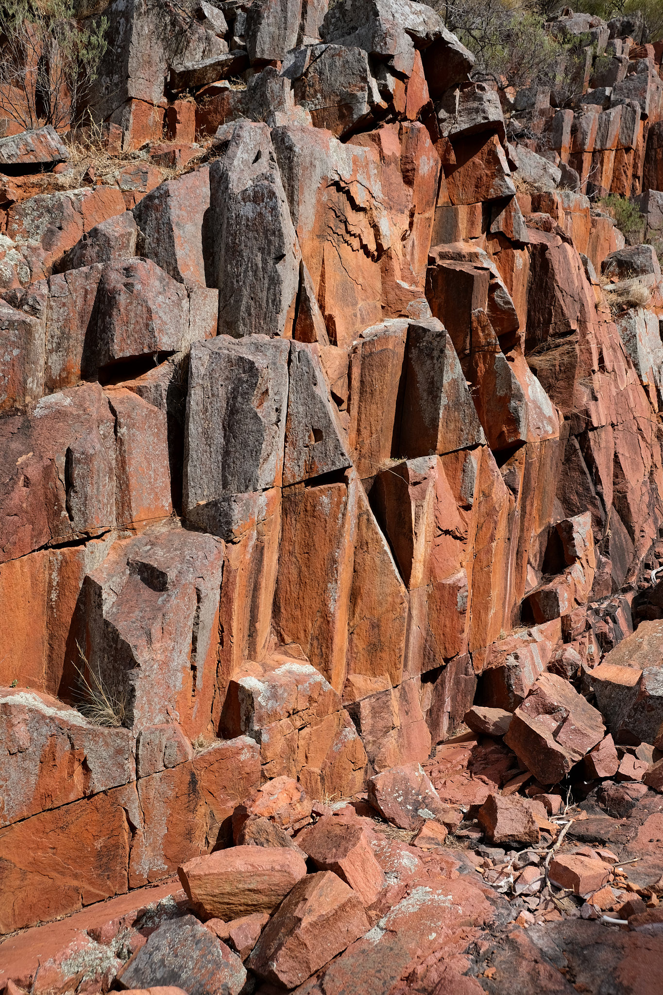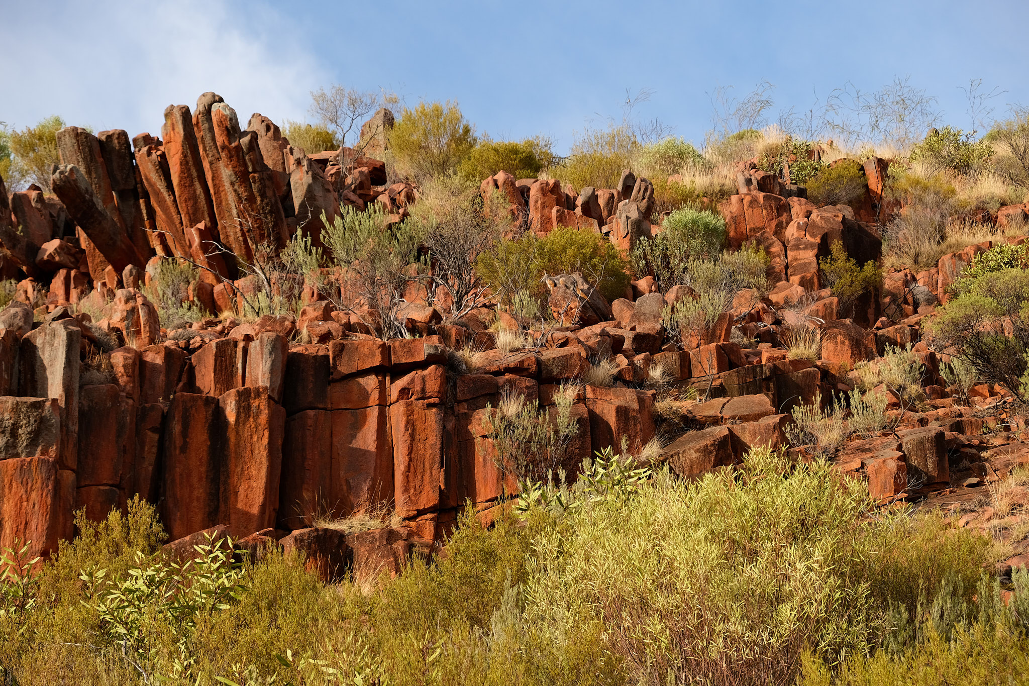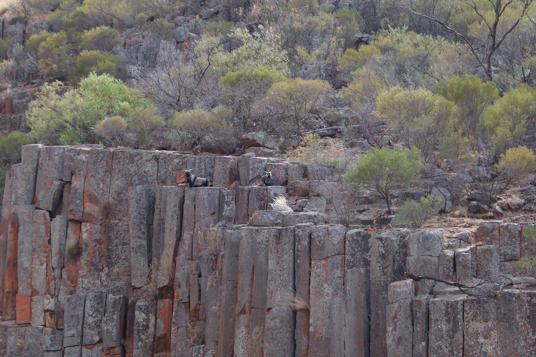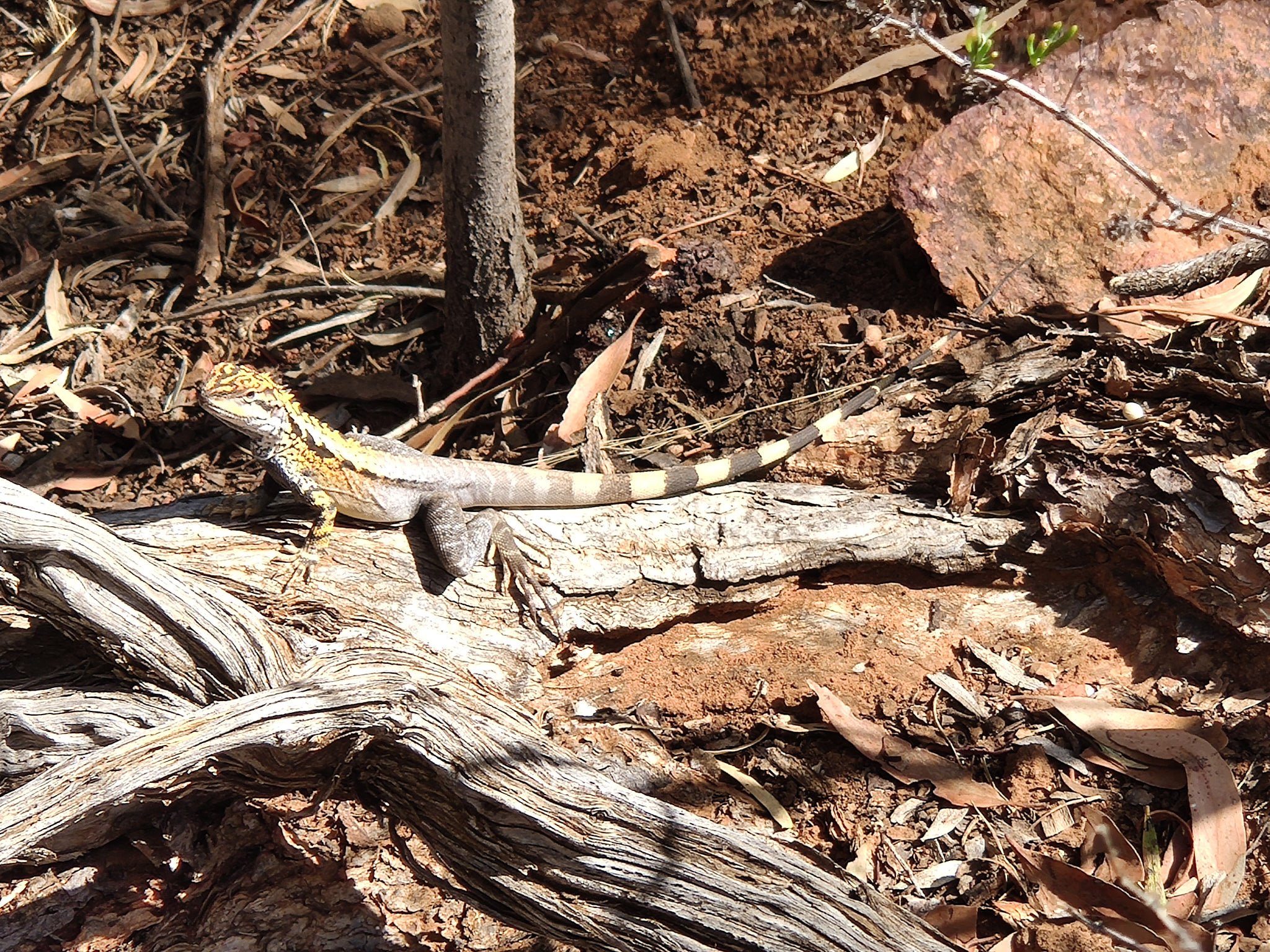 Am Ende des Scenic Drive habe ich die coole 10km lange Piste zu den Organ Pipes genommen. Noch vor dem Mittag bin ich den 1.4km (hin und zurück) Weg zur Schlucht mit den „Organ Pipes“ gegangen. Dieser führt sehr schön durch den Busch und den Wald. Wenn man etwas in die Schlucht oder auf die Felsen klettert, hat man einen sehr guten Aus- und Überblick über die faszinierenden, senkrechten Felsformationen. Das Ende der Schlucht würde ein Wasserfall bilden. Ganz von oben, von den höchsten und schönsten Aussichtspunkten, beobachteten mich mehrere Ziegen. Ein Felswallaby konnte ich aber nirgends finden. Dafür hatte es hier wieder viele Bienen und riesige Wespen, welche nach Wasser suchten. Auf dem Rückweg habe ich in Ruhe eine sehr farbige Echse bewundern können.
