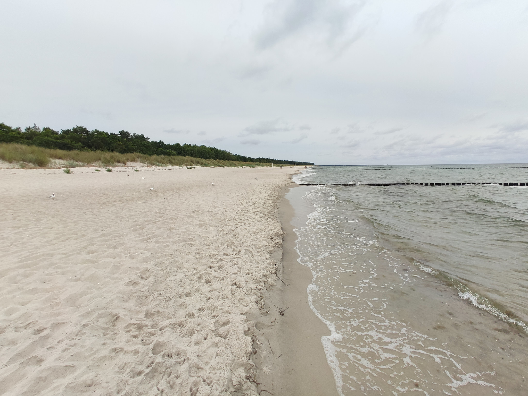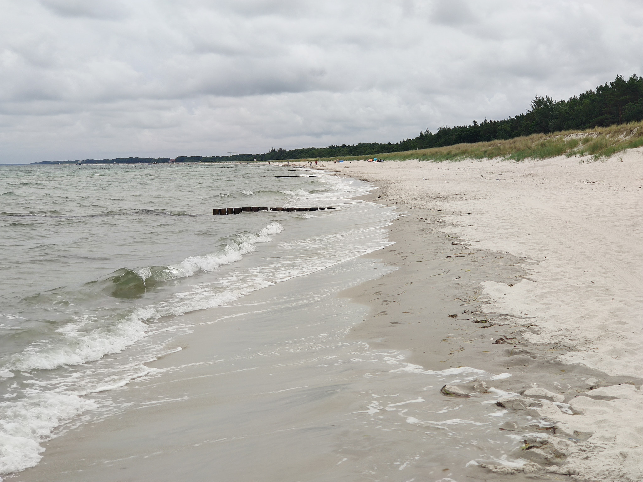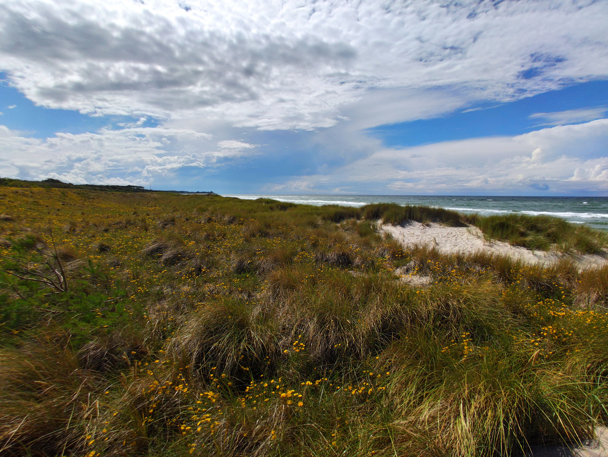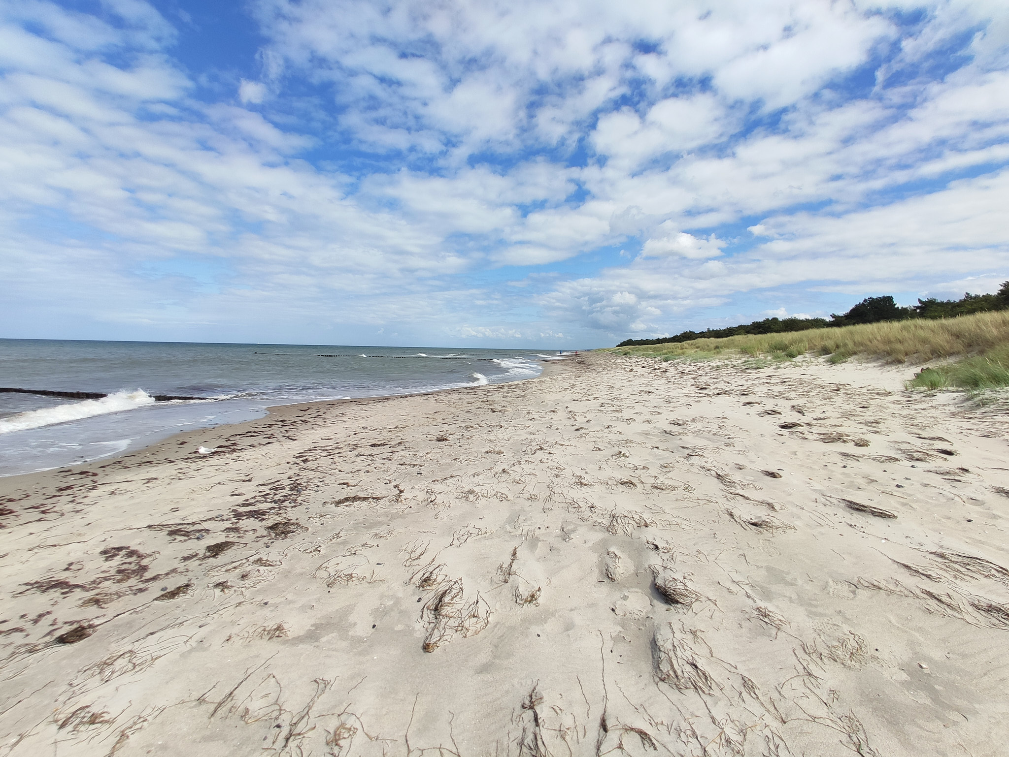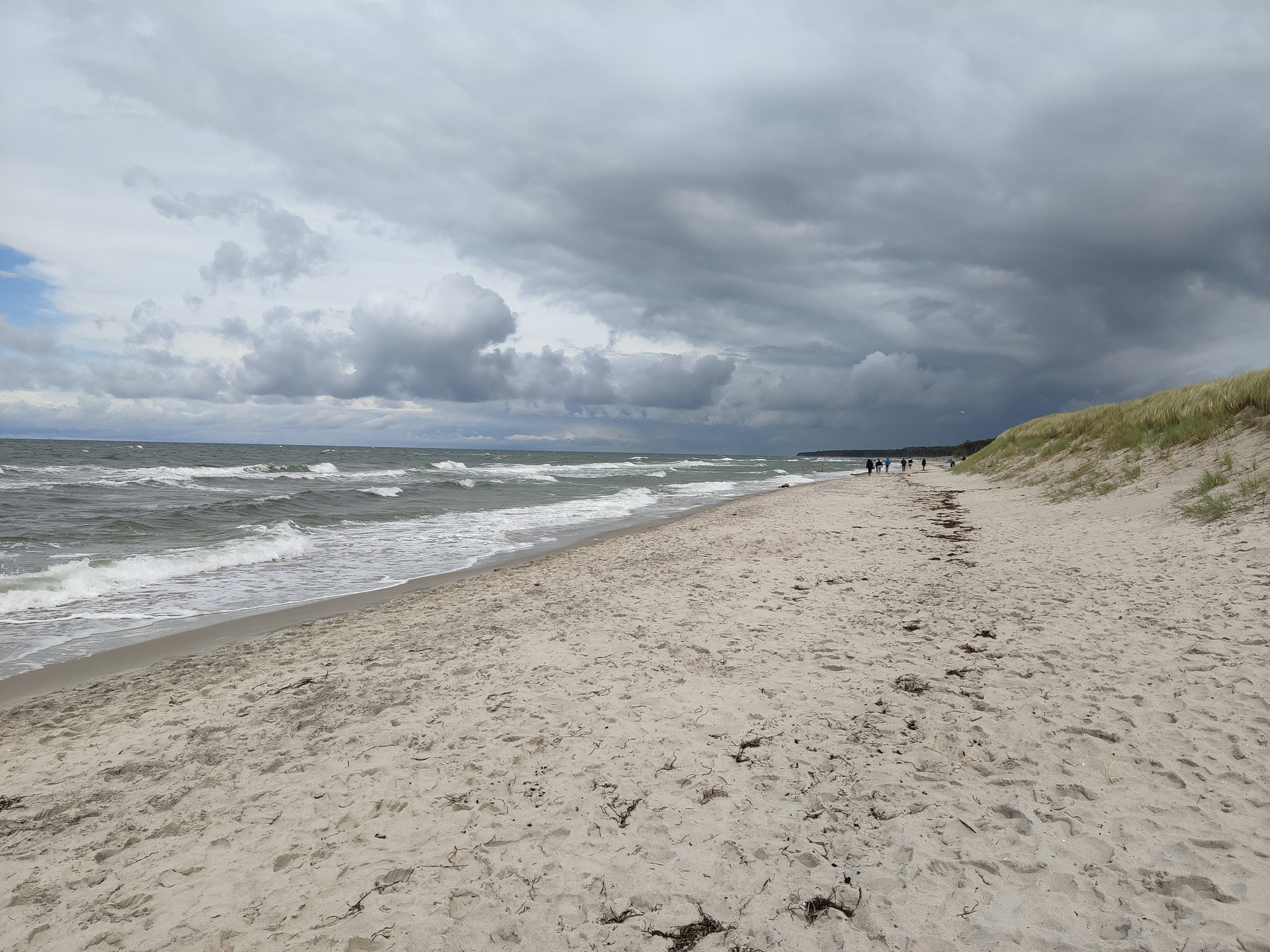 Am ersten August habe ich jedoch zum Wanderparklplatz „Drei Eichen“ am südlichen Ende des Darsser Waldes gefahren, um von dort aus eine Rundwanderung zuerst ein kleines Stück nach Norden durch den Wald, aber dann gegen Westen an zum Strand. Dann ging ich ein ganz schönes Stück Richtung Norden am wilden Weststrand entlang, bis ich genug hatte. Den ganzen Weg bin ich dann wieder zurück Richtung Süden bis zu einem Übergang Richtung Parkplatz. Da hatte ich den sonnigen Abschnitt am Himmel bis zum Erscheinen der dunkelgrauen Wolkenbergen perfekt genutzt!
