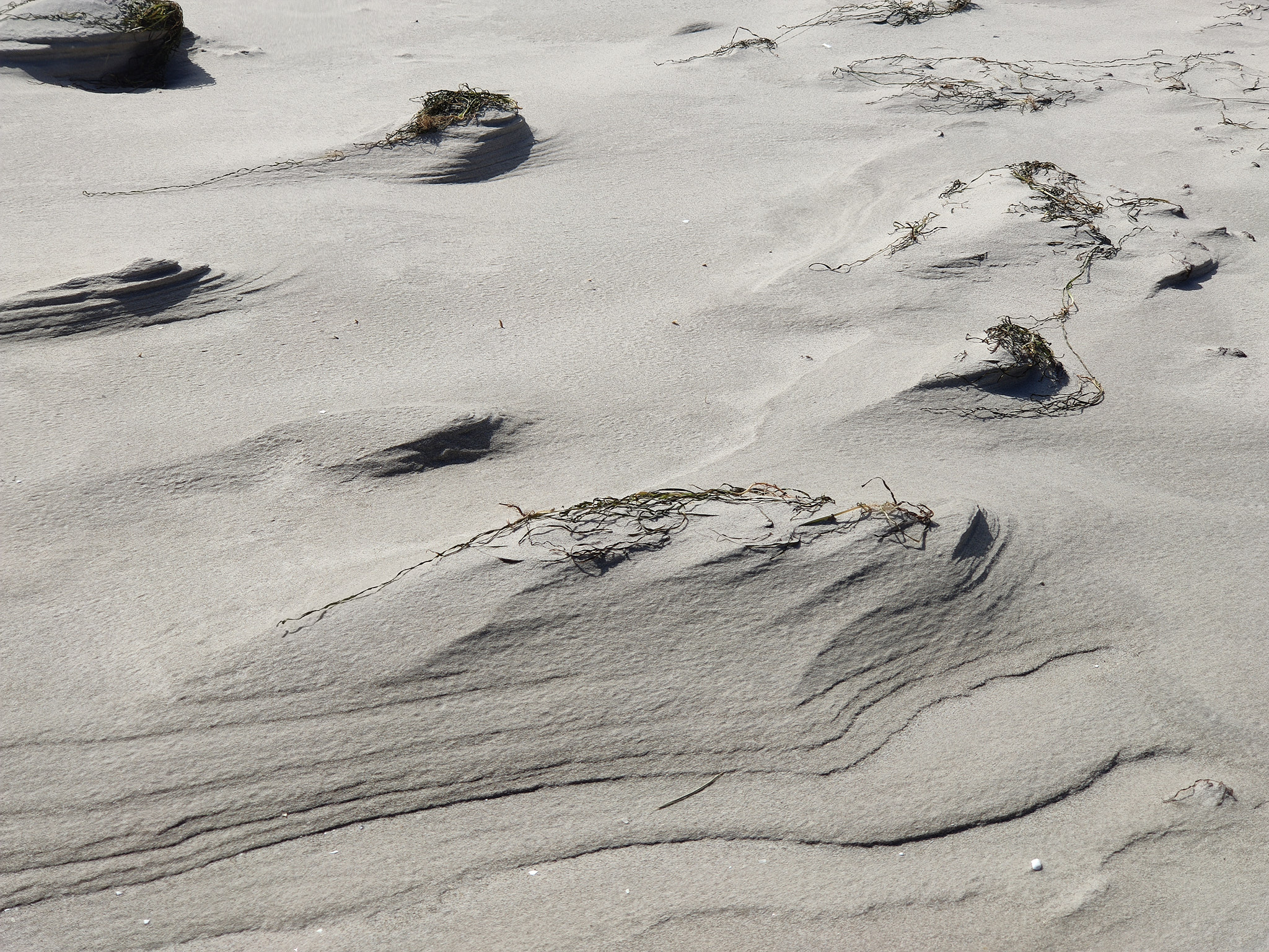 Am Tag darauf war das Wetter dann wieder etwas freundlicher gestimmt und ich konnte eine Strandwanderung bei Sonnenschein aber immer noch kühlen Temperaturen unternehmen und begutachten, was der Wind und die Wellen mit dem Sand angestellt haben.