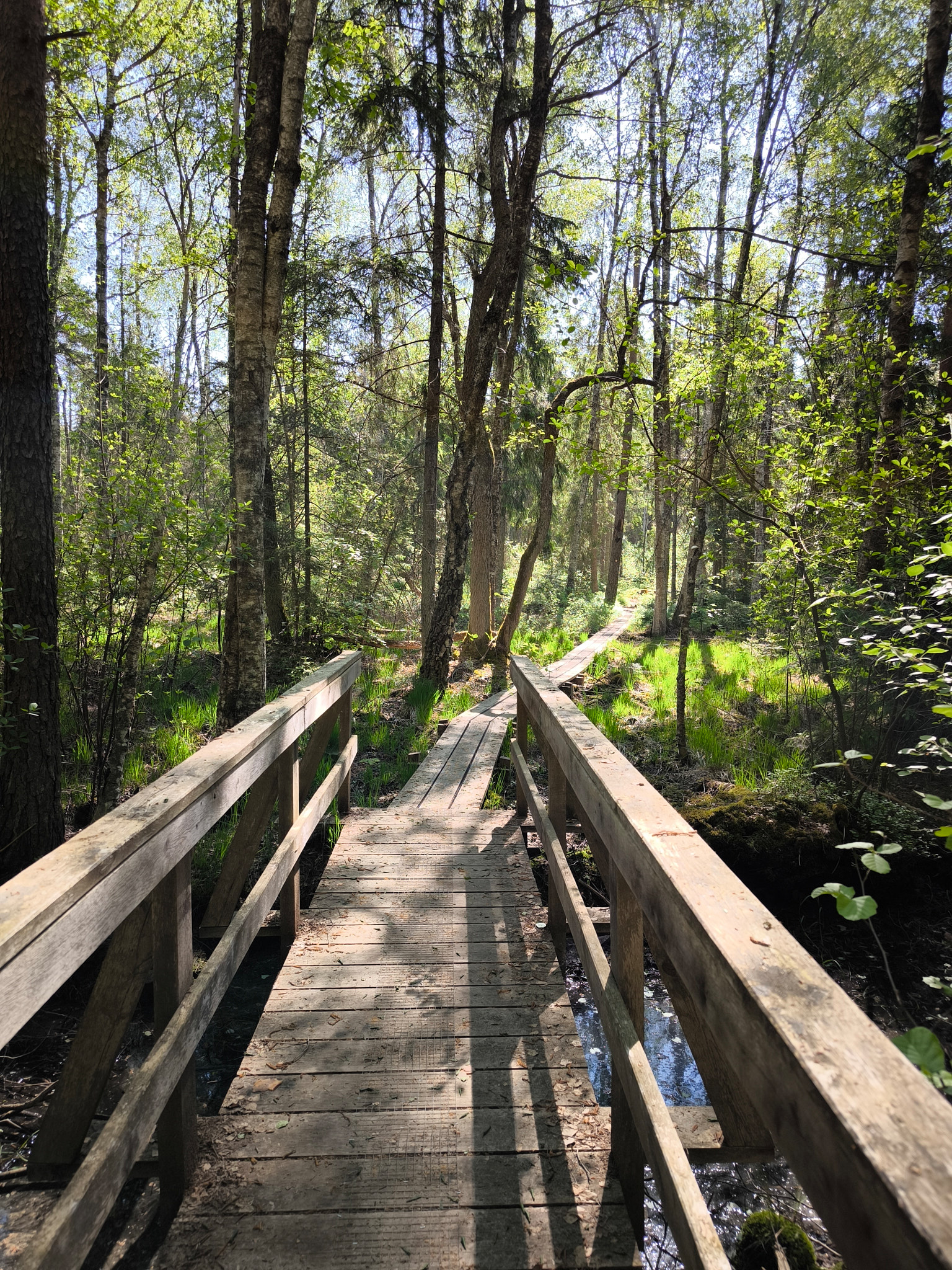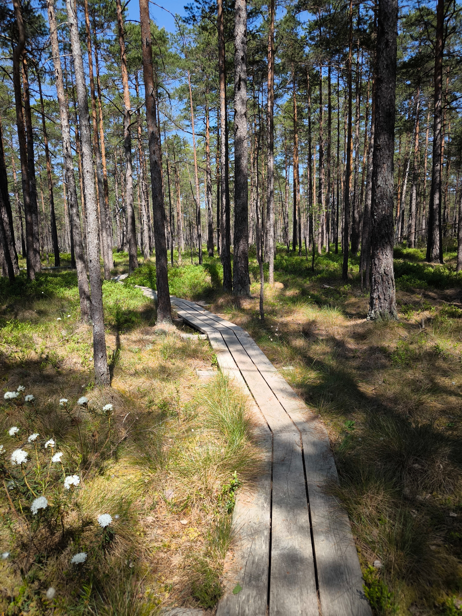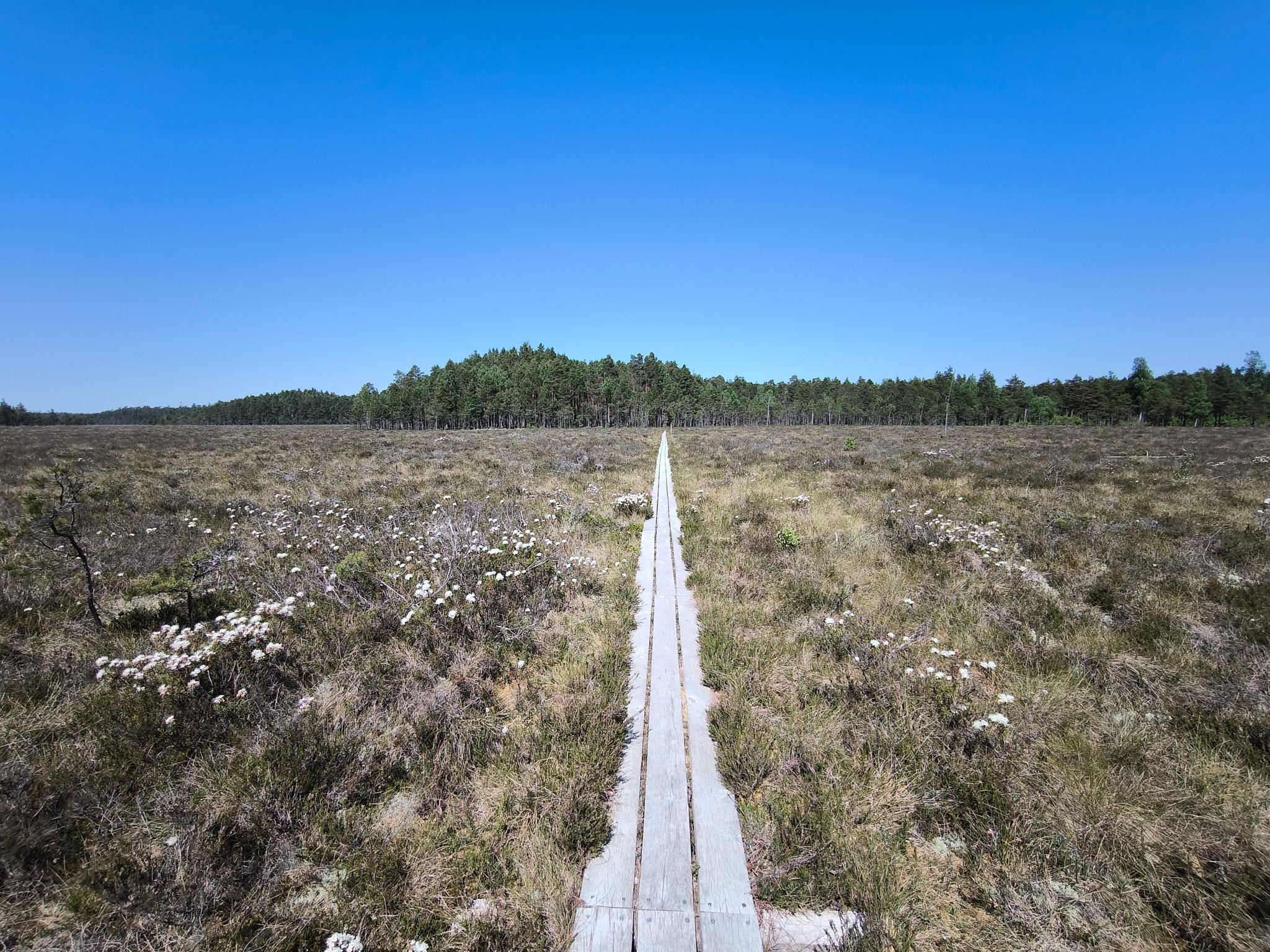 Nach etwas mehr als 900 Metern entlang des Banvallsleden folgt man dann der Wegmarkierungen nach links, und geht ein kurzes Stück auf der kleinen Forststrase weiter. Diese Abzweigung hatte ich verpasst (was man auf der untenstehenden Karte sieht): Da aber die Wegmarkierungen plötzlich fehlten, habe ich den Fehler nach kurzer Wegstrecke bemerkt. Auf dem nördlichen Teil des Weges geht es weiter auf federnden Pfaden und Stegen, die von grossen Mengen an blühendem Skvattram umgeben sind. Dessen Blätter sind als Mückenschutzmittel der Natur bekannt, aber man darf im Nationalpark ja keine Pflanzen pflücken oder abbrechen! Ich hatte mich mit synthetischem Mückenschutz eingesprüht, was ich an wenigen Stellen des Pfades auch ganz nützlich war.