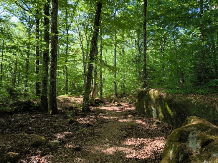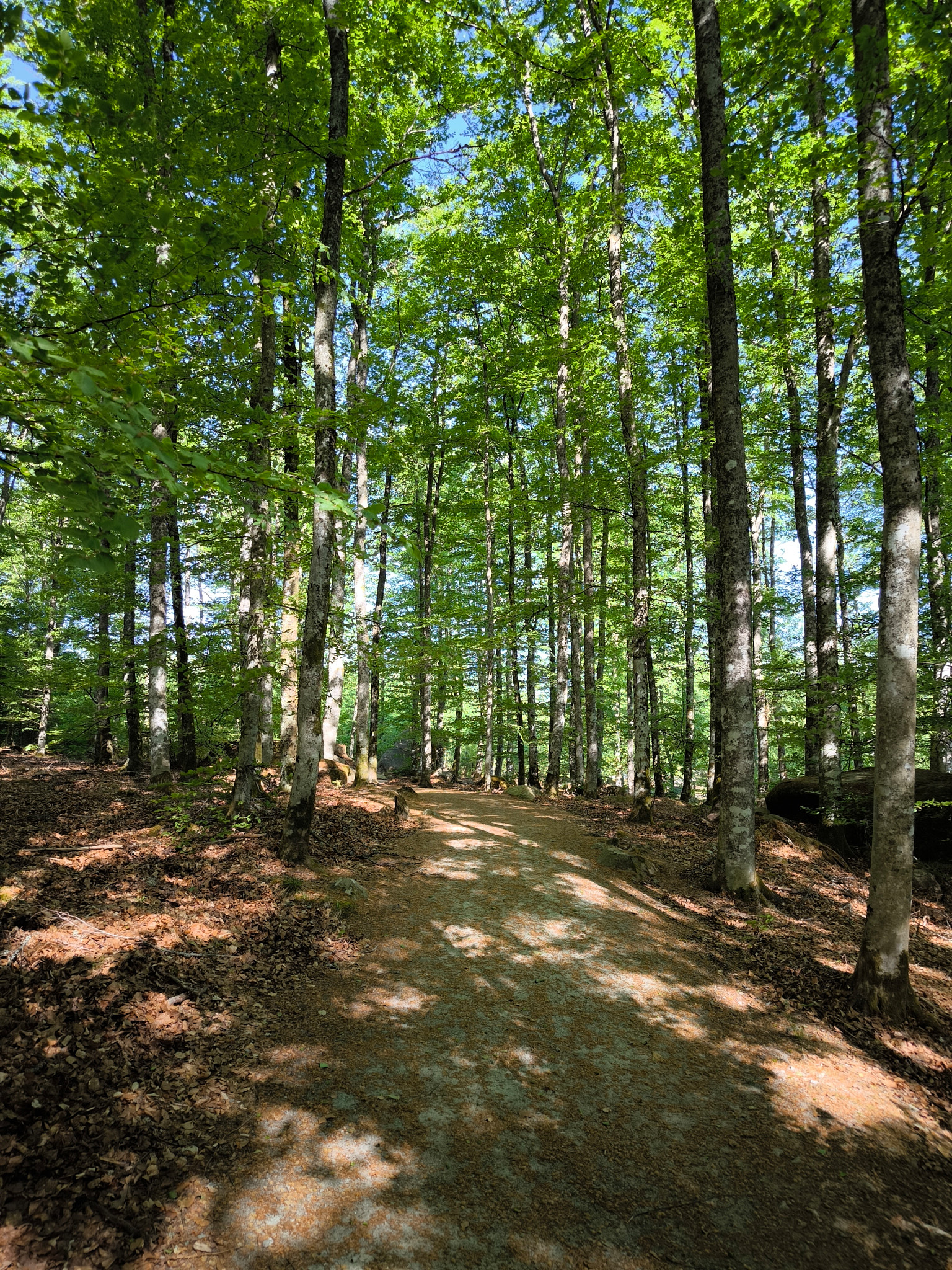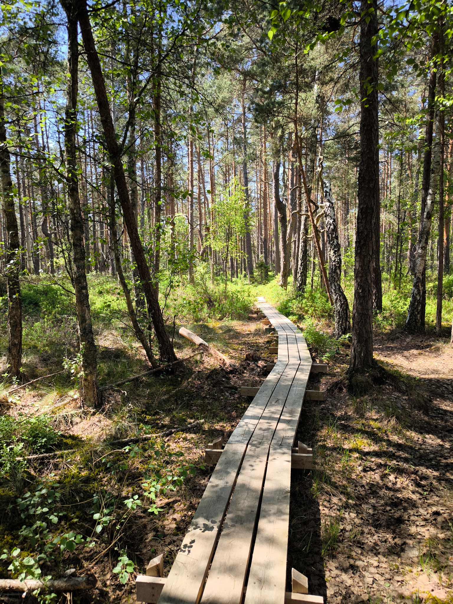 Nach etwas mehr als 900 Metern entlang des Banvallsleden folgt man dann der Wegmarkierungen nach links, und geht ein kurzes Stück auf der kleinen Forststrase weiter. Diese Abzweigung hatte ich verpasst (was man auf der untenstehenden Karte sieht): Da aber die Wegmarkierungen plötzlich fehlten, habe ich den Fehler nach kurzer Wegstrecke bemerkt. Auf dem nördlichen Teil des Weges geht es weiter auf federnden Pfaden und Stegen, die von grossen Mengen an blühendem Skvattram umgeben sind. Dessen Blätter sind als Mückenschutzmittel der Natur bekannt, aber man darf im Nationalpark ja keine Pflanzen pflücken oder abbrechen! Ich hatte mich mit synthetischem Mückenschutz eingesprüht, was ich an wenigen Stellen des Pfades auch ganz nützlich war.