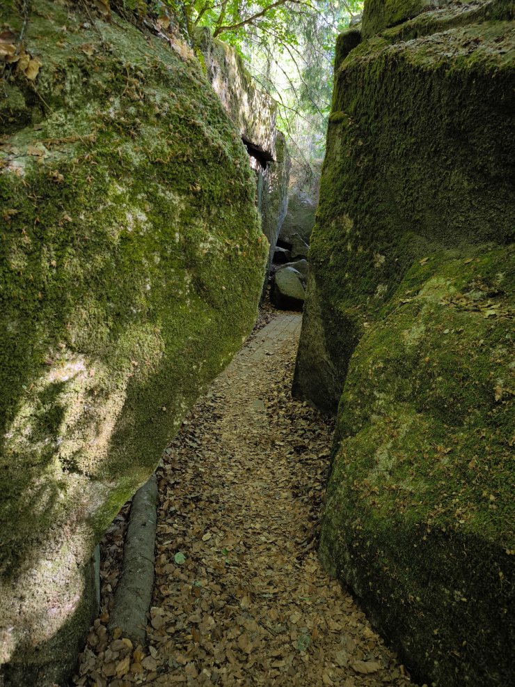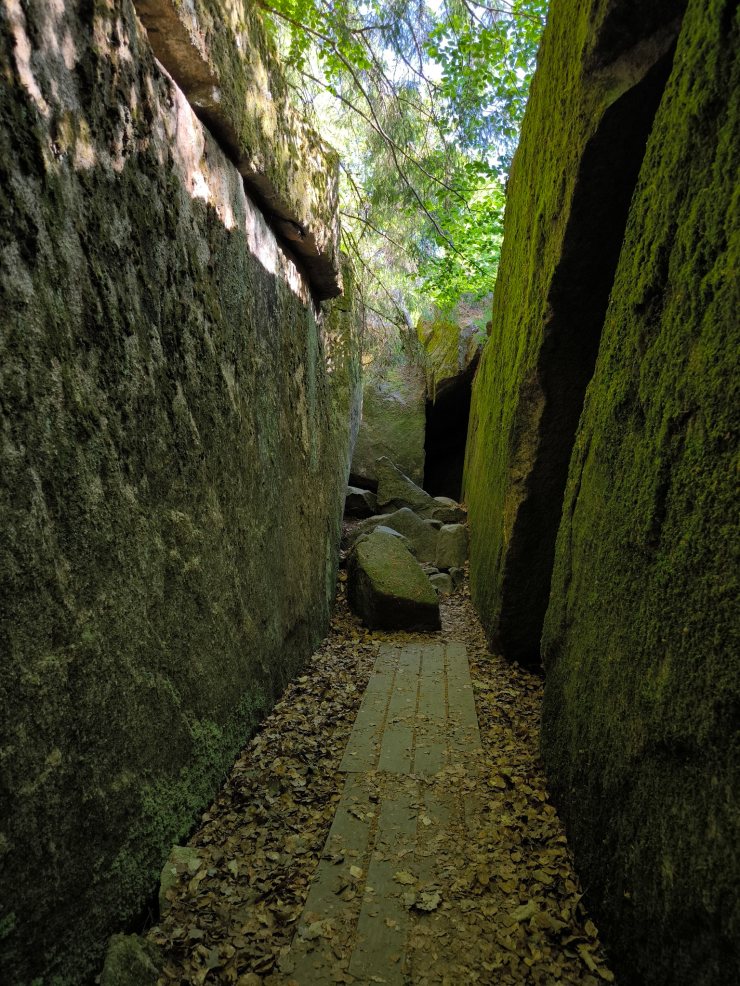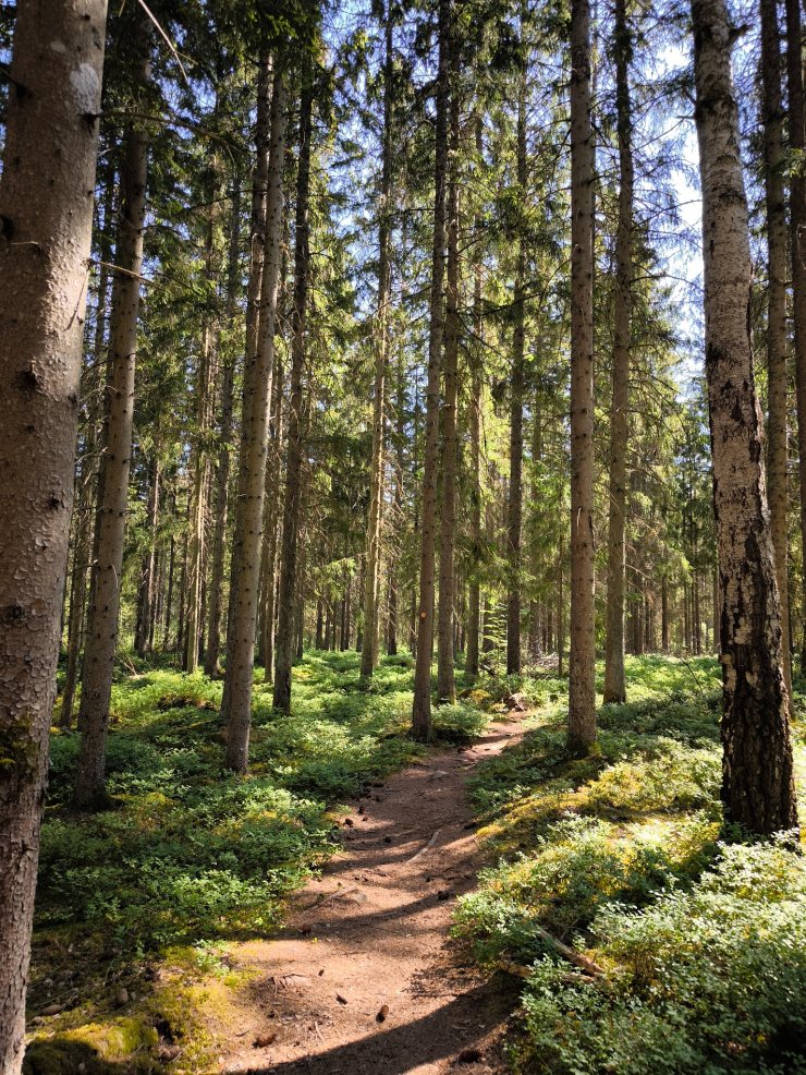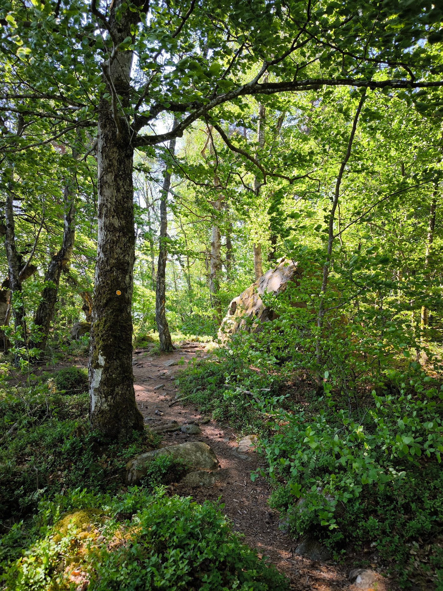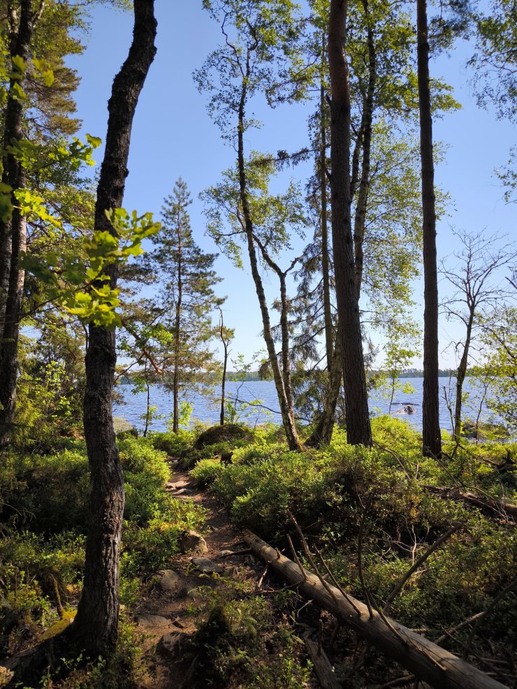 Am Dienstag bin ich die rund 25km zum Nationalparkeingang Trollberget (Trollberg) gefahren. Hier gibt es den gelb markierten Weg Trollsvansen (0,3 km), den blau markierten und etwas hügeligen Weg Utsiktsslingan (Ausssichtsrunde), und den orange markierten Skoggslingan (Waldrunde, 2,2 km). Ich habe die gelb und den orange markierten Kurz kombiniert. Gleich hinter dem Parkplatz befindet sich der Felsspalt des Trollberget, wo laut Überlieferung der Troll Weihnachten feiert. Den Eingang zur Schatzkammer des Trolls, die sich irgendwo in dem Berg befinden soll, habe ich nicht gefunden. Die verschiedenen Typen von Wäldern (Föhren, Fichten, Laubwald und Mischwald am Ufer) wechseln sich innerhalb von wenigen hundert Metern ab und unterscheiden sich stark.