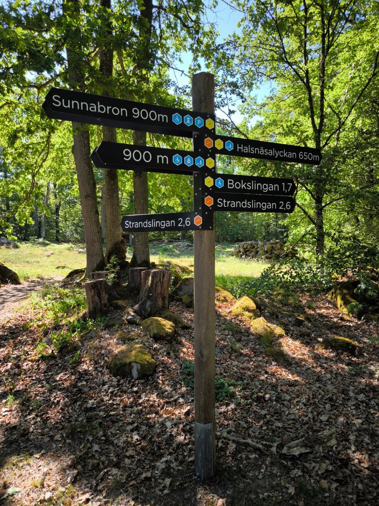 Am nächsten Morgen mache ich mich auf zum nahe gelegenen Haupteingang des Nationalparks, welcher sich bei Sunnabron am Sund zur grössten Insel des Åsnen, Sirkön, befindet. Hier spannt der Buchenwald ein schimmerndes Laubdach und man hat die Wahl aus dem gelb markierten Östra (östlichen) Torpaslingan (0,3 km) oder dem Västra (westlichen) Torpaslingan (0,9 km, auch gelb markiert). Die beiden Rundwege kann man für eine längere Wanderung auch kombinieren und mit dem Wanderweg Hunshult ergänzen kann. Ich habe mich für eine Kombination mit der schmaleren und steinigeren Strandslingan (2,6 km) entschieden und wollte danach noch die östliche Runde machen. Vor dem Start der kleinen Wanderung habe ich mich als erstes sorgfältig mit Mückenschutzmittel eingesprüht.