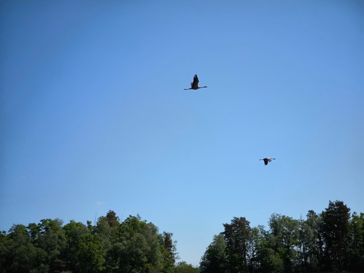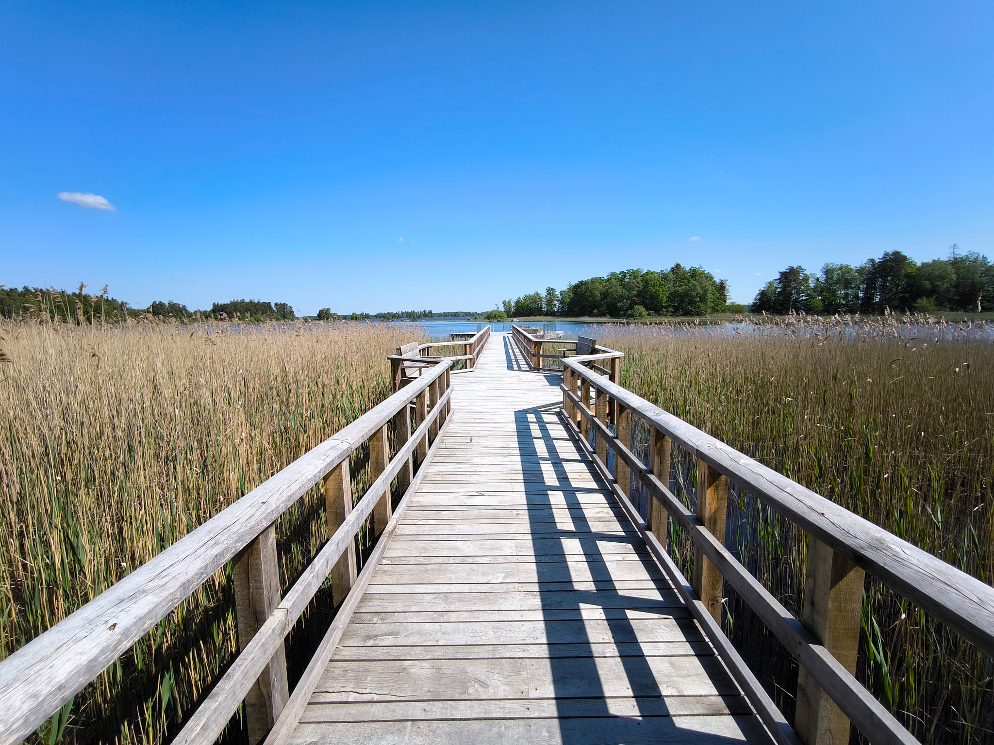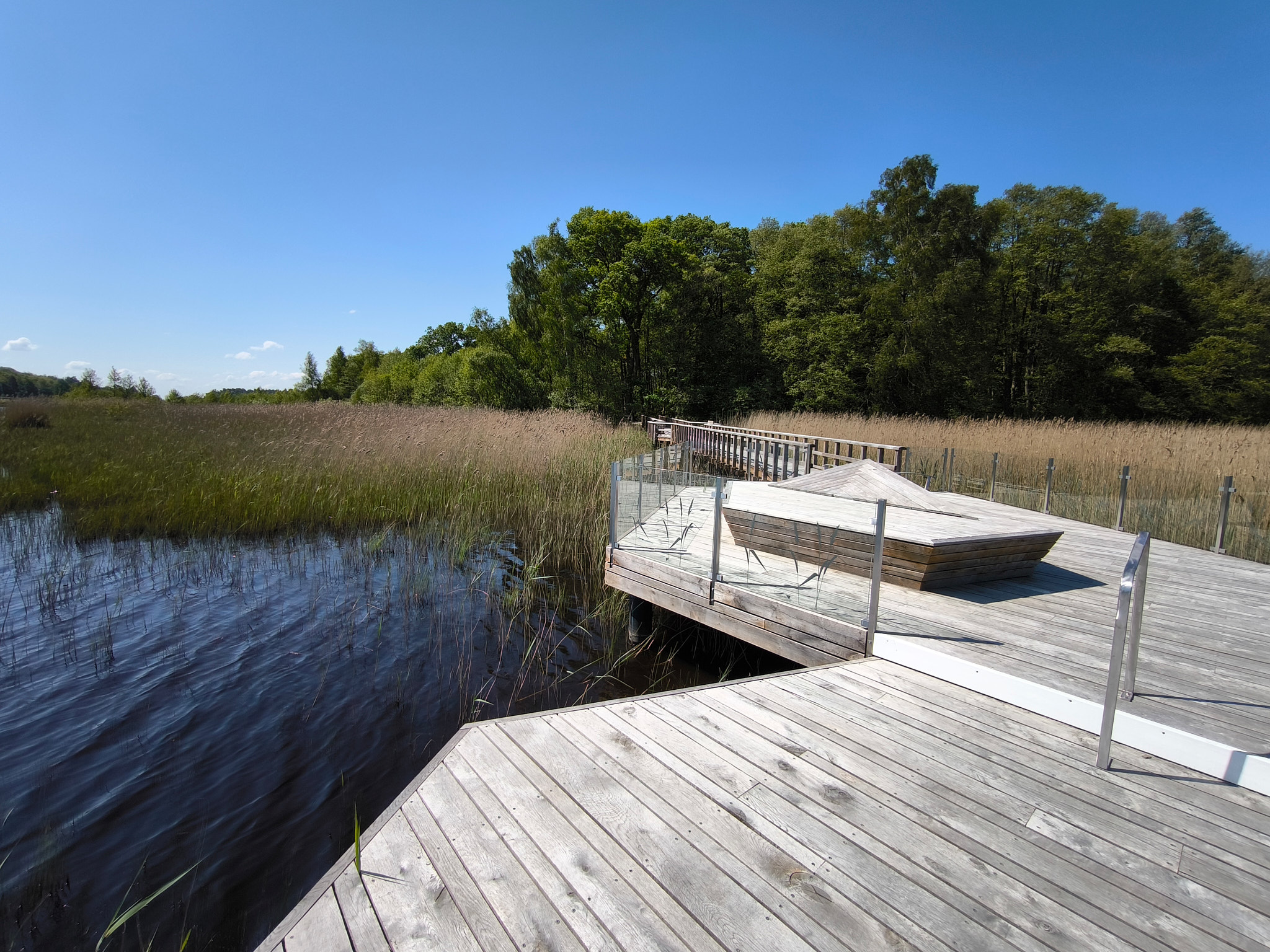Die westliche Torpaslingan führt zunächst nach Bjurkärr, das einen Teil der wertvollsten Laubwälder Schwedens umfasst. Bei Famntaget (die Umarmung), wo eine Buche eine Kiefer umarmt, gibt es ein schönes Holzdeck, das zum Verweilen mit Aussicht über die Inseln und das Wasser des Åsnen einlädt. Solange der Pfad entlang des Ufers führte, war es sehr angenehm zu wandern. Führte der Weg allerdings in den Wald, dann wurde ich von hunderten Mücken begleitet. Das war sehr unangenehm, aber der Mückenschutz wirkte sehr zuverlässig. Hinter mir schwebte aber eine richtige Mückenwolke. Daher habe ich meinen Schritt etwas beschleunigt, was aber auch nichts half. Das war schlussendlich so unangenehm, dass ich die geplante zweite Runde durch den Buchenwald von Hunshult nicht mehr angehen wollte. Ich habe mir im Camper ein Lunchpaket zusammengestellt und habe dann gemütlich auf der nördlichen Plattform (Punkt B auf der untenstehenden Karte) den Lunch und die Aussicht auf mich wirken lassen. Ich habe doch tatsächlich eine Entenfamilie, zwei laut rufende Kraniche und einen Seeadler beobachten können! Was für ein tolles Erlebnis.