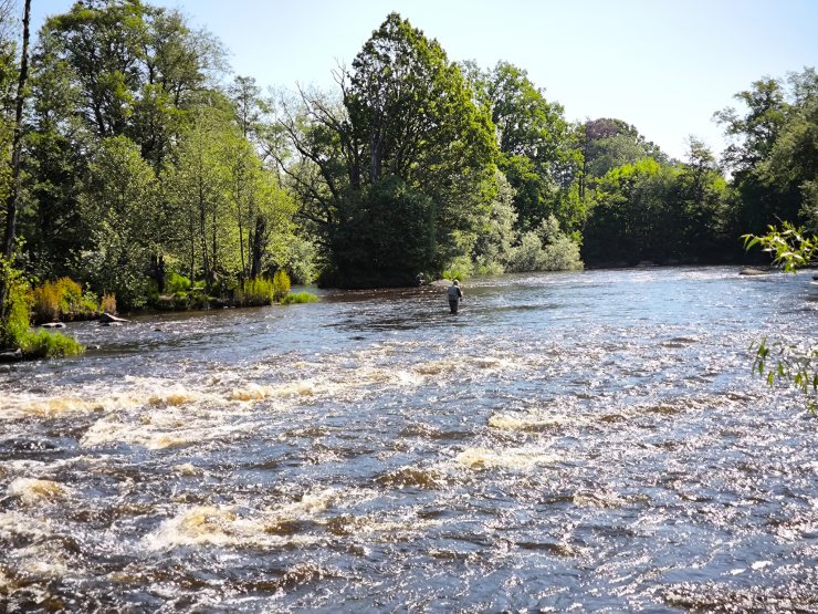 - Blanklachsfischen: Im Mai, Juni und Juli überwiegen die neu aufgestiegenen Blanklachse. Sie sind meist um die zehn Kilogramm schwer, aber auch Fische von über zwanzig Kilogramm sind darunter. Bis zur Laichzeit im Herbst wandern immer wieder neue Lachse aus der Ostsee den Fluss hinauf. In manchen Jahren steigen im Spätsommer viele kleine Lachse (Grilse) von zwei bis drei Kilogramm auf; dann sind die Aussichten auf einen Fang besonders gut.