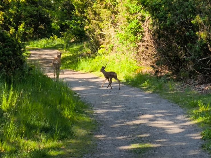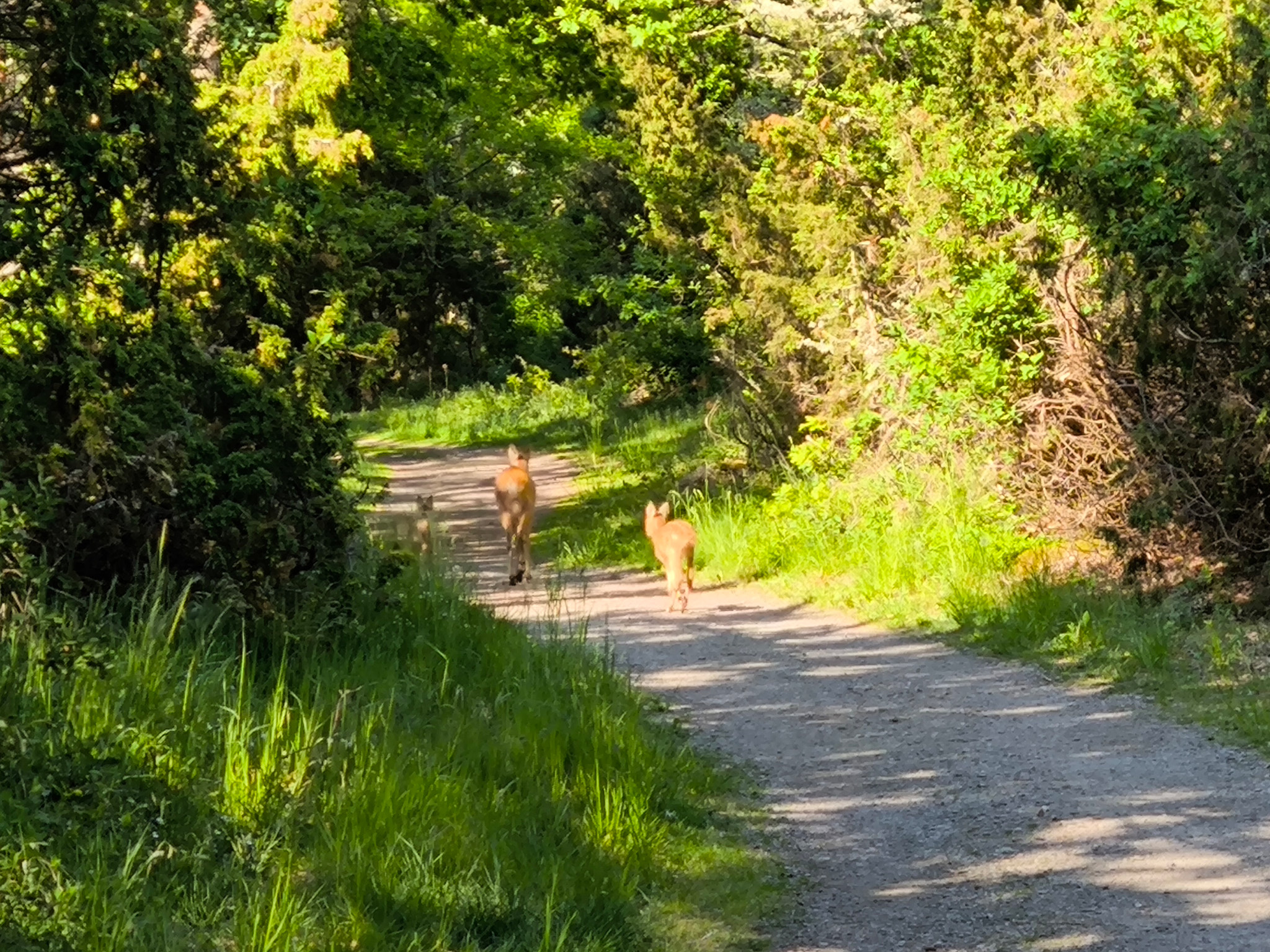 Weiter geht es auf dem Weg. Ich bin total überrascht, dass vor mir eine Hirschkuh (oder ein Reh?) mit zwei Kitze auftaucht! Der zauberhafte Eichenwald wird wieder zum gewöhnlichen Kiefernwald.