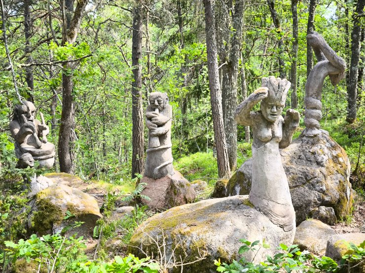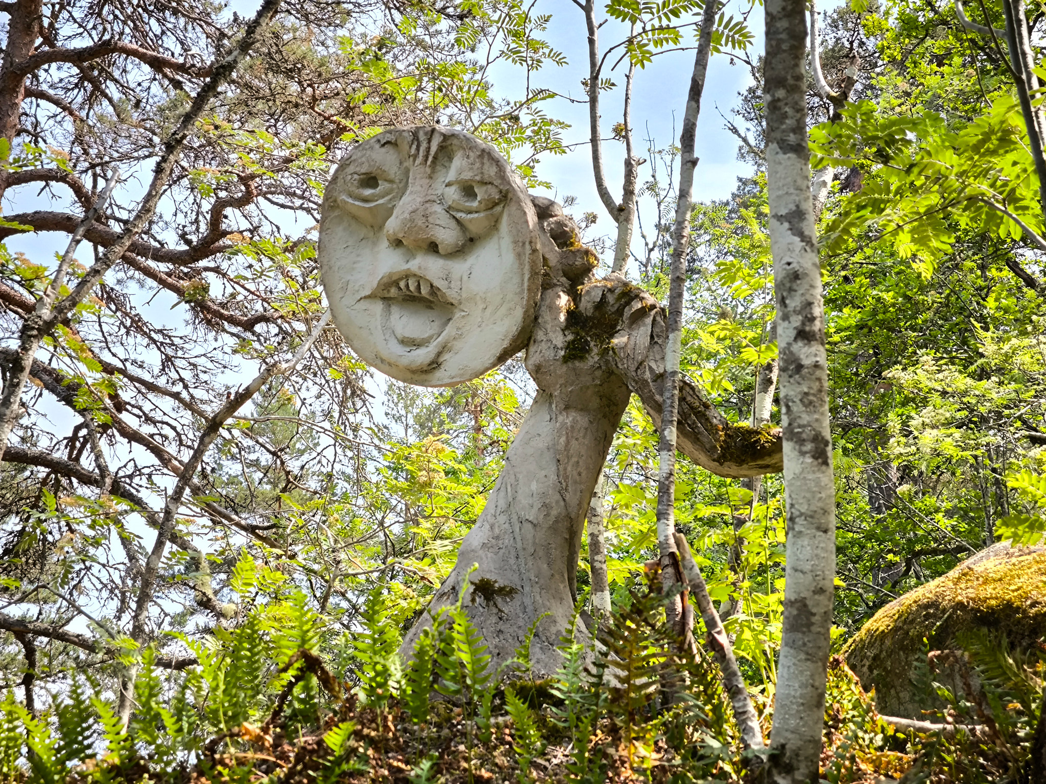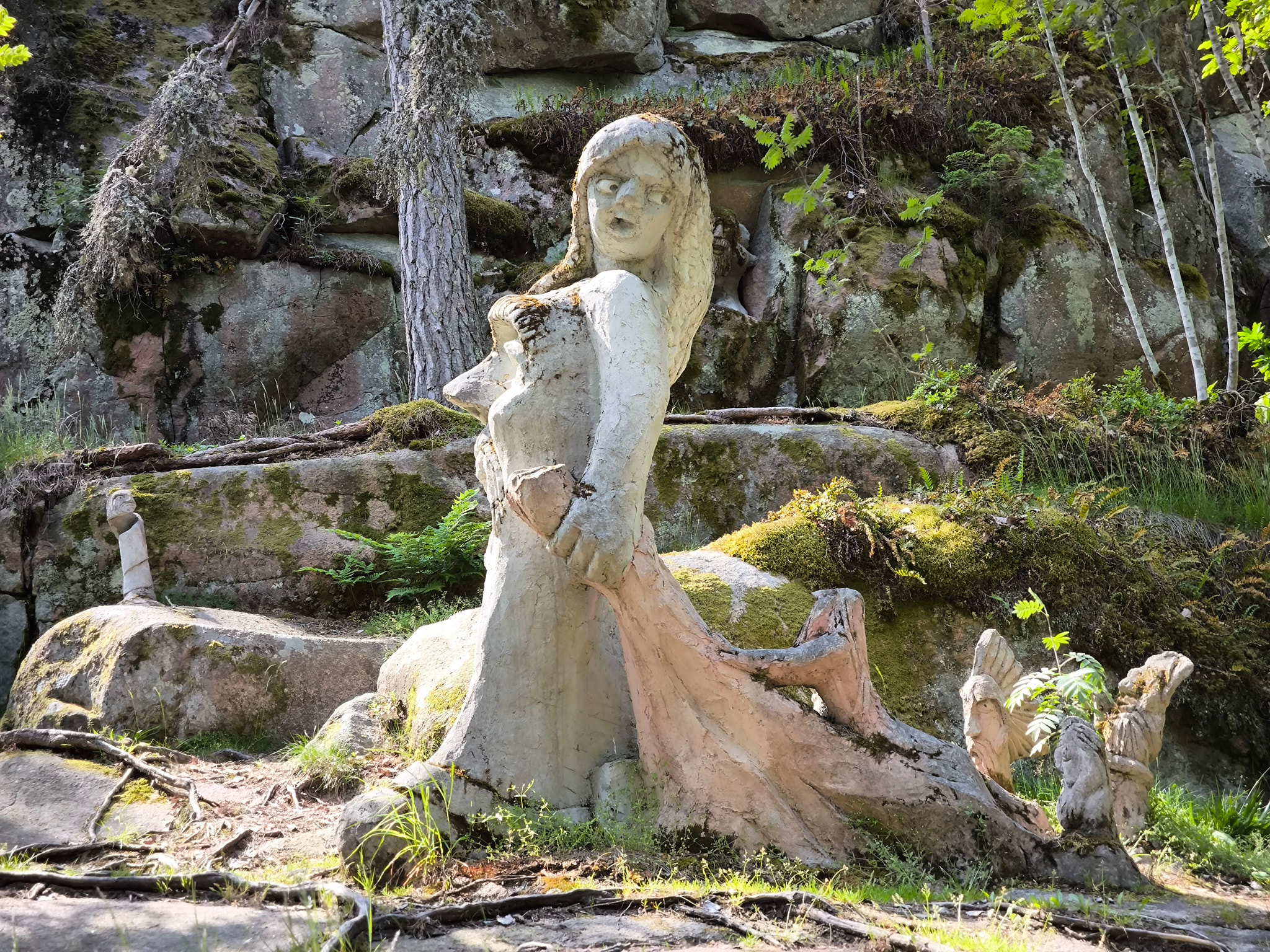 Der nächste Stopp erfolgte dann nach ein paar weiteren Kilometern durchs Hinterland über kurvige Nebenstrassen in Gamleby. Dort gibt es einen schönen Waldpfad mit vielen humorvollen Trollfiguren: Den Trollparken oder Skulpturparken. Schon beim grossen Parkplatz winkt einem eine riesige Trollfigur auf den zuerst steilen Weg rauf zu den vielen, teilweise etwas versteckten Figuren auf und in der Felswand oben im Wald.