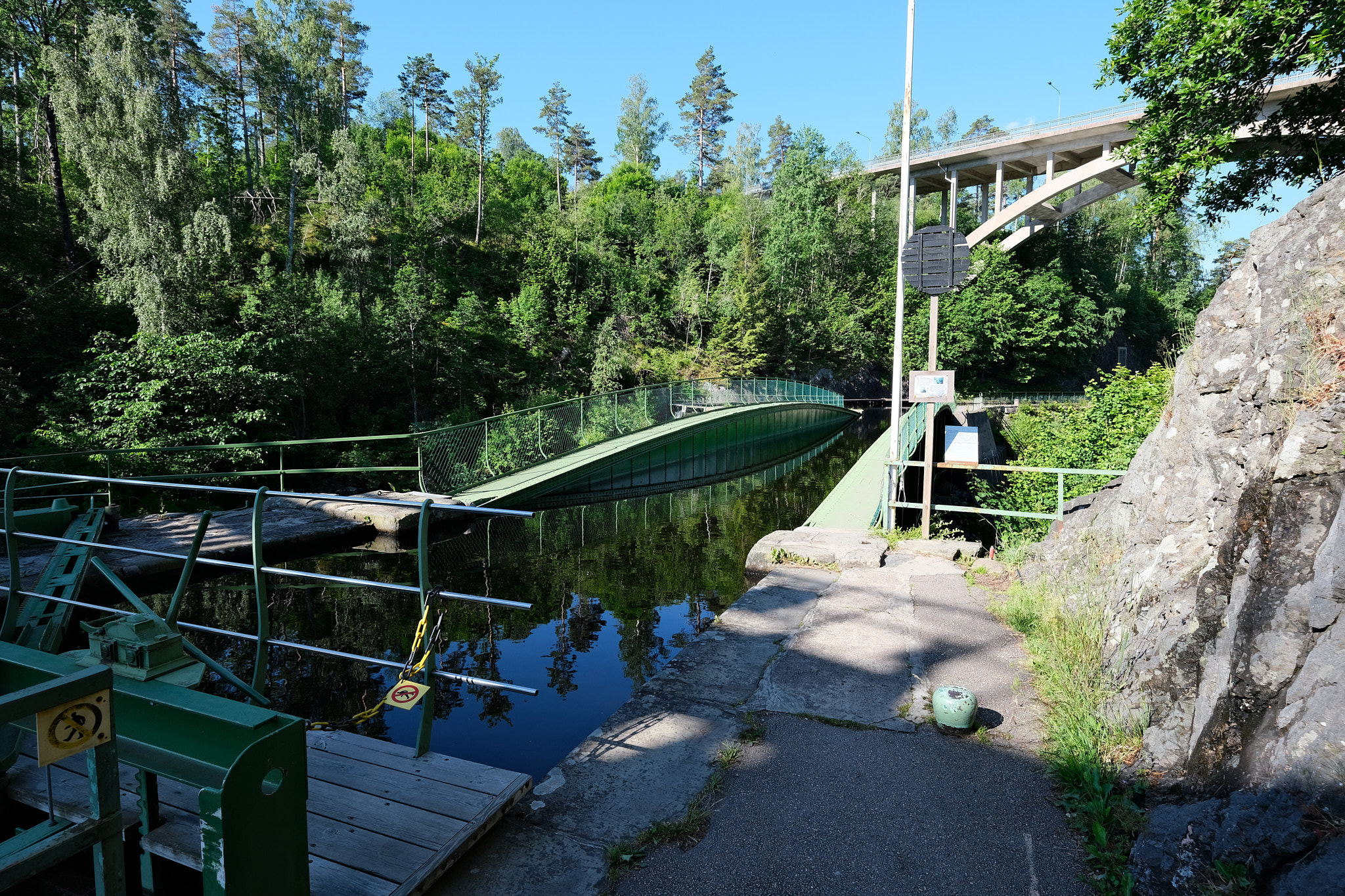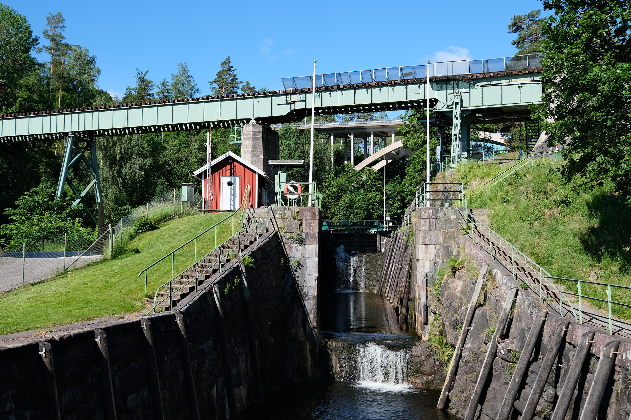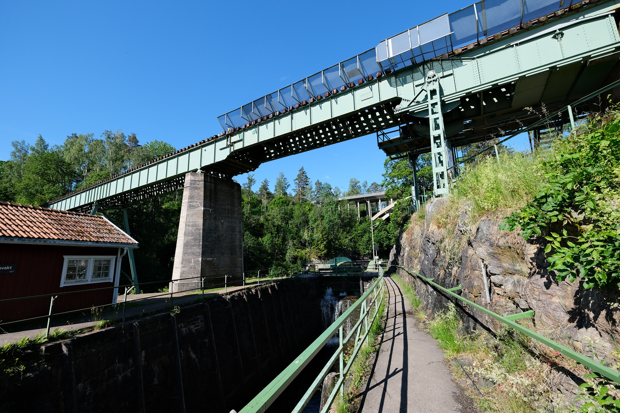 Das Aquädukt des Dalslandskanals war eine geniale Lösung eines grossen Problems. Es schien hier wegen des weichen Felsbodens und des tiefen Tals, durch das der Fluss brauste, unmöglich, den vorgesehenen Kanal und die Schleusen zu bauen. Der verantwortliche Leiter des Projektes, Nils Ericson, befürwortete den Bau eines Aquäduktes über den schwierigsten Teil und empfahl den oberen Teil des Kanals auf eine Eisenkonstruktion auf den Felsen zu legen und so geschah es auch! Das Aquädukt ist eine 32.5 Meter lange Stahlrinne, die aus 33′,’000 Nieten zusammengefügt wurde. Er wurde von König Karl XV. im September 1868 eingeweiht.